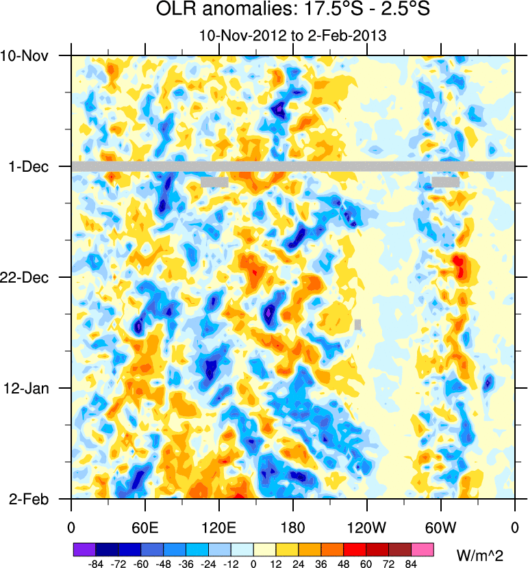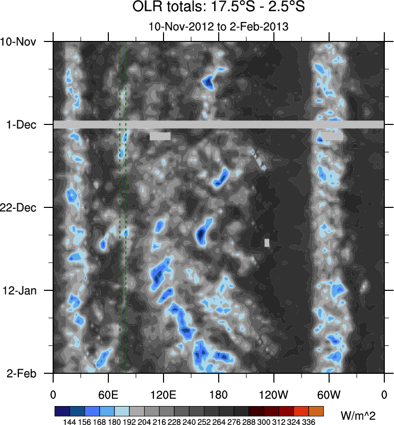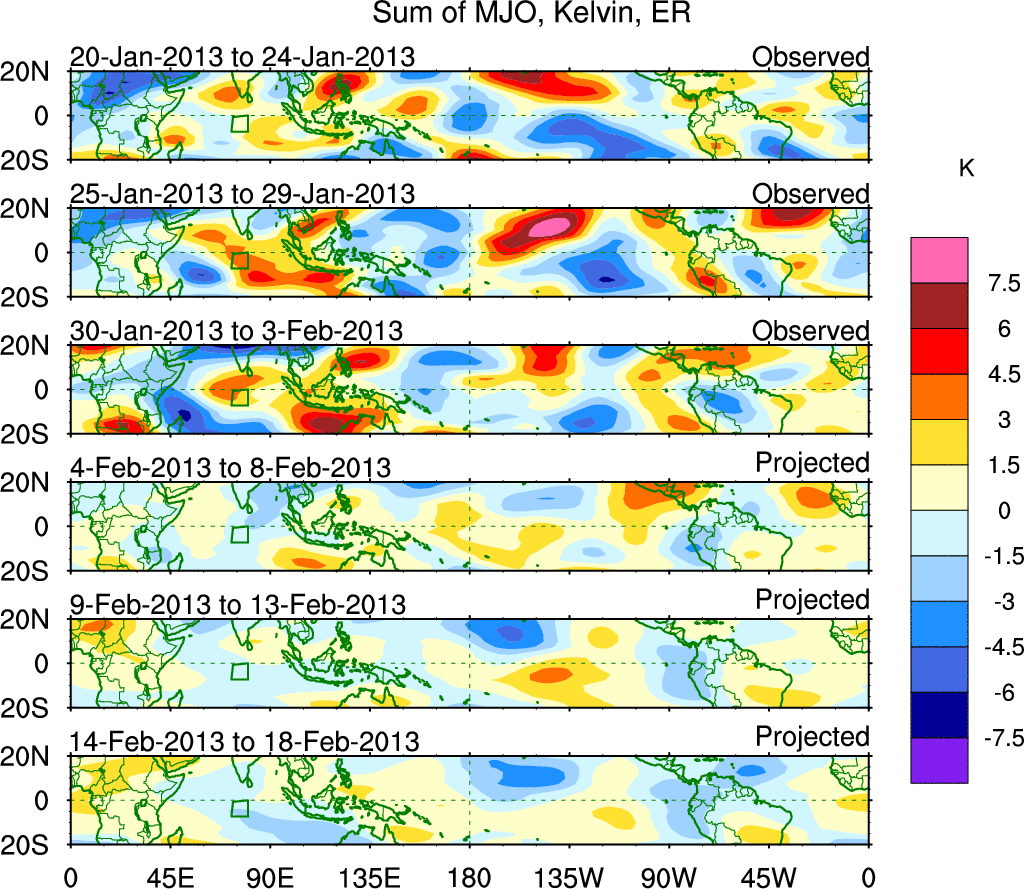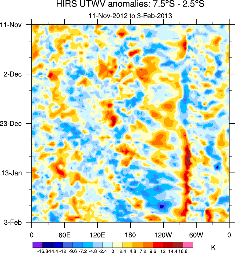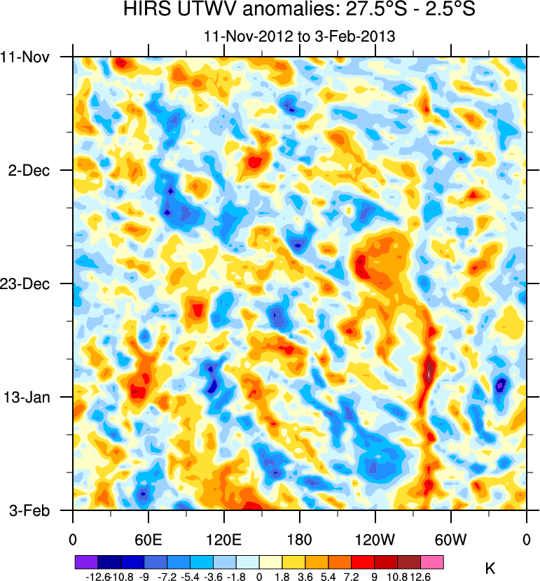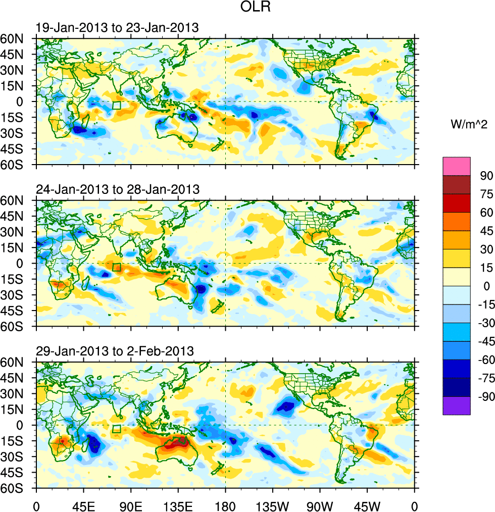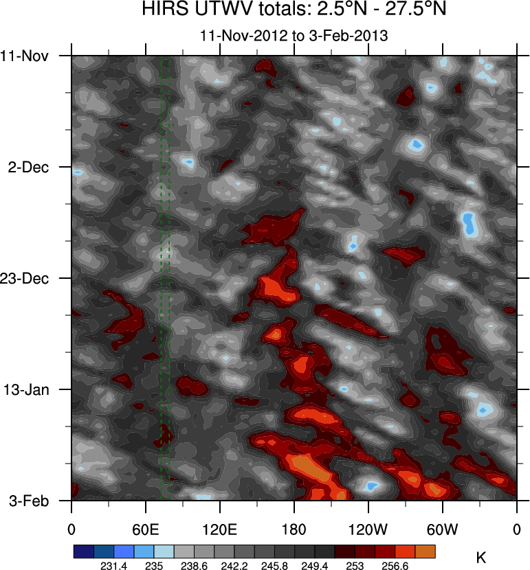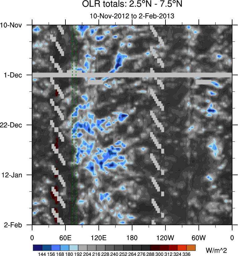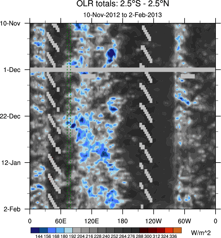 To identify tropical waves in near real-time, the OLR and UTWV data are filtered following Wheeler & Weickmann (2001 MWR). The daily anomalies are calculated using the first 3 harmonics of the seasonal cycle for 1979–2009. Missing values are then filled using linear interpolation in space and time. The most recent 365 days of anomalies are padded with 659 days of zeroes, and the result is filtered for each wave type.