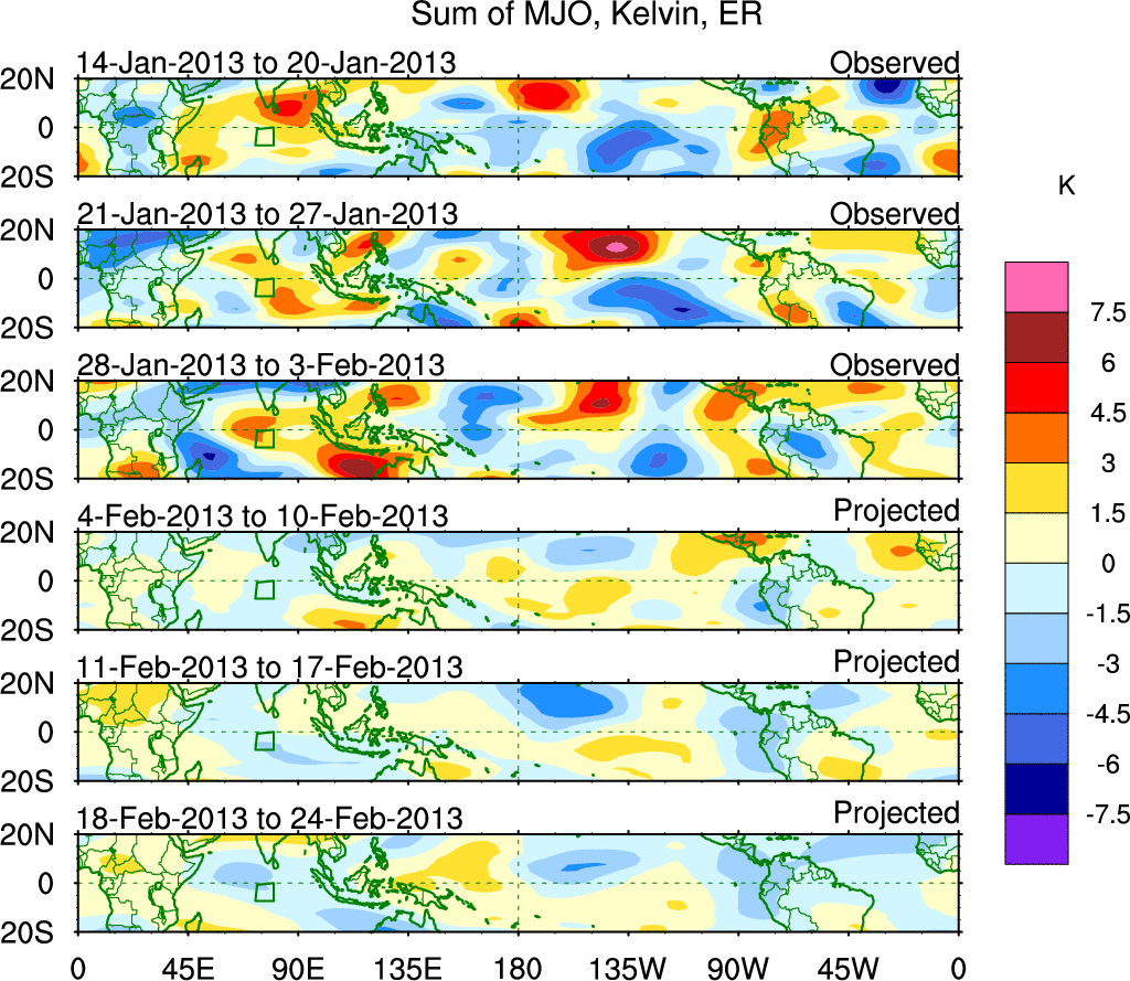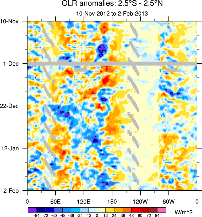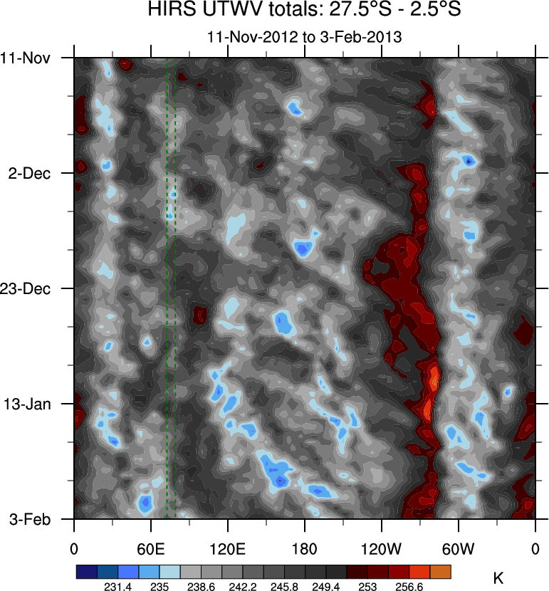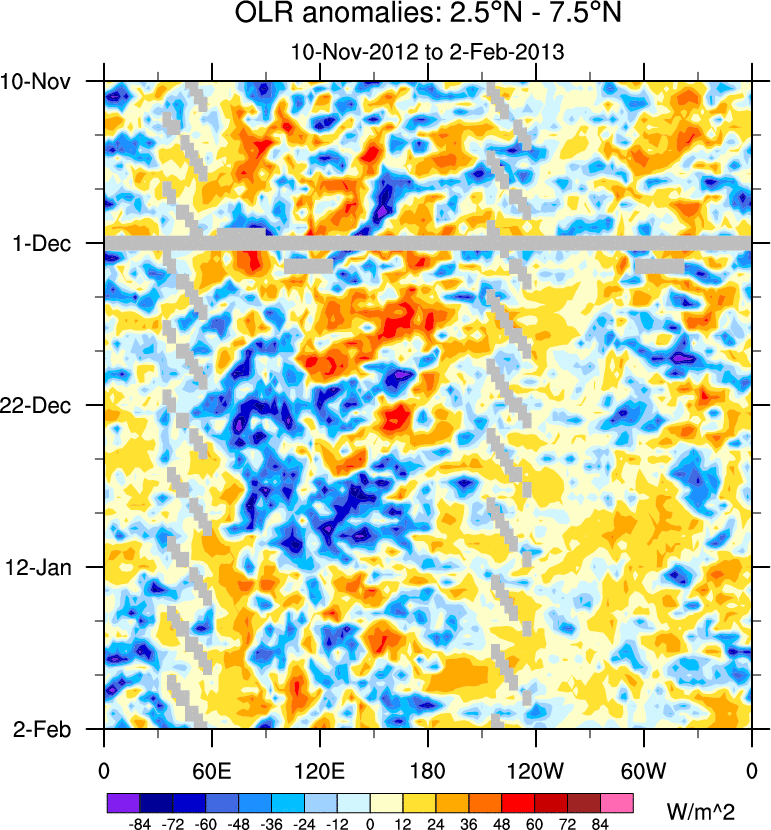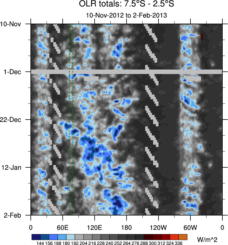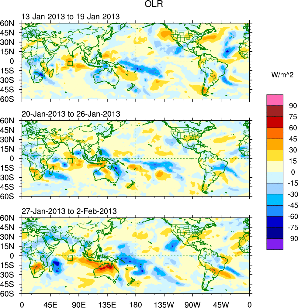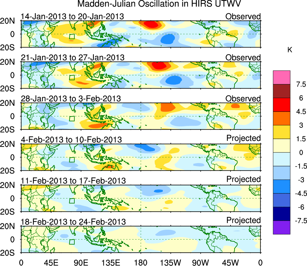 To identify tropical waves in near real-time, the OLR and UTWV data are filtered following Wheeler & Weickmann (2001 MWR). The daily anomalies are calculated using the first 3 harmonics of the seasonal cycle for 1979–2009. Missing values are then filled using linear interpolation in space and time. The most recent 365 days of anomalies are padded with 659 days of zeroes, and the result is filtered for each wave type.