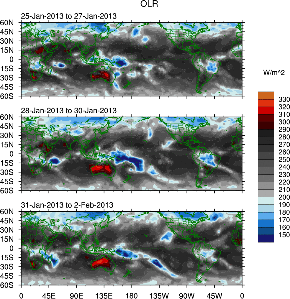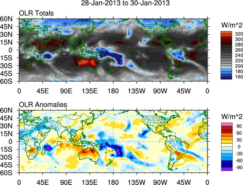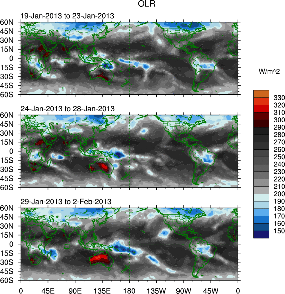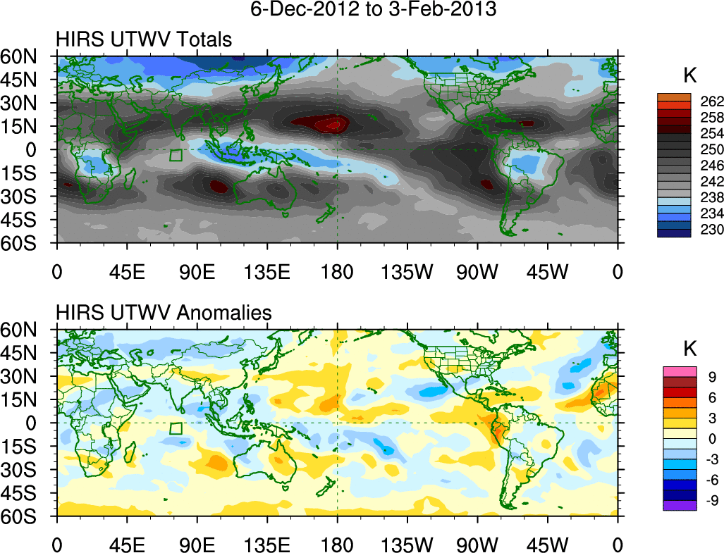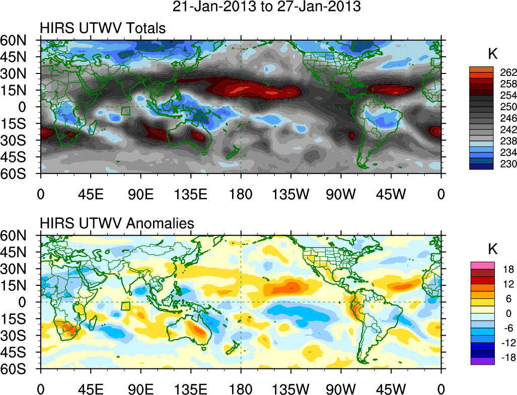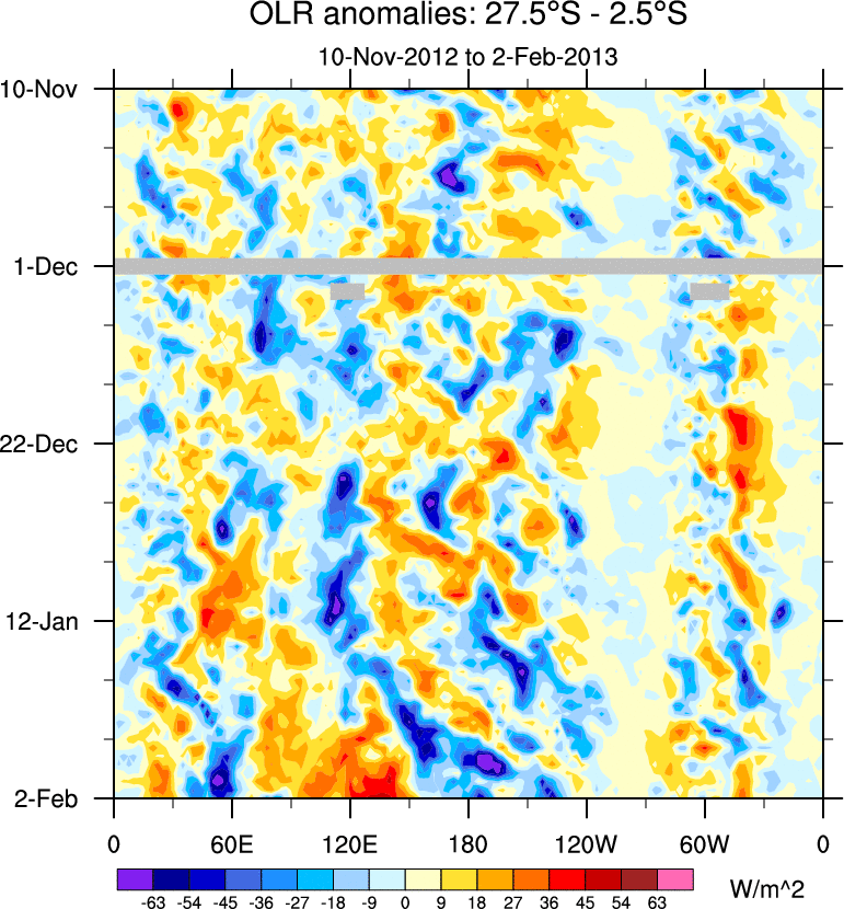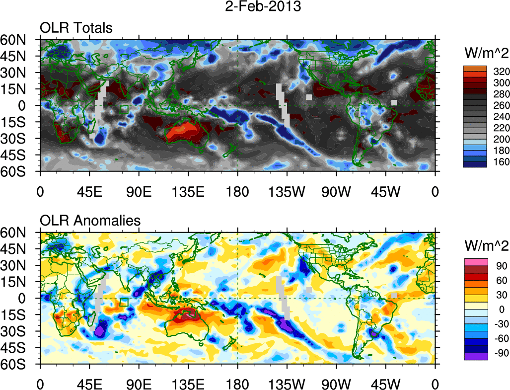 To identify tropical waves in near real-time, the OLR and UTWV data are filtered following Wheeler & Weickmann (2001 MWR). The daily anomalies are calculated using the first 3 harmonics of the seasonal cycle for 1979–2009. Missing values are then filled using linear interpolation in space and time. The most recent 365 days of anomalies are padded with 659 days of zeroes, and the result is filtered for each wave type.