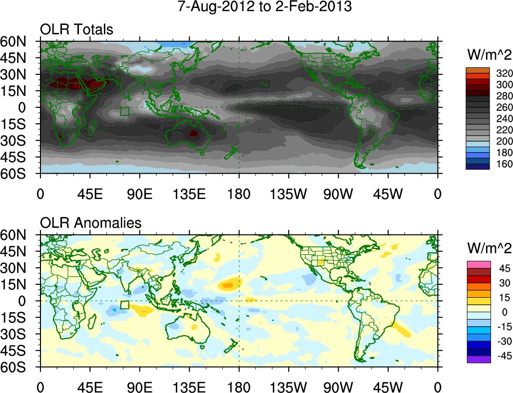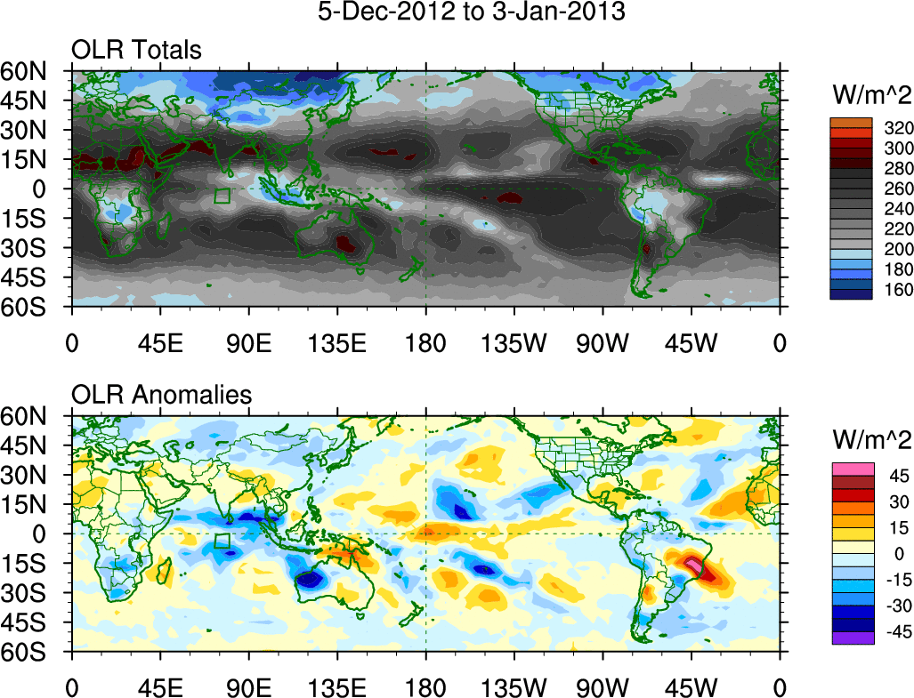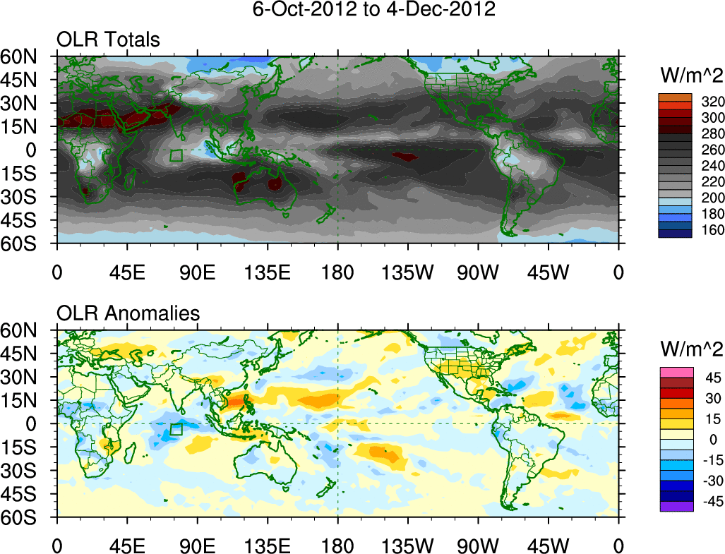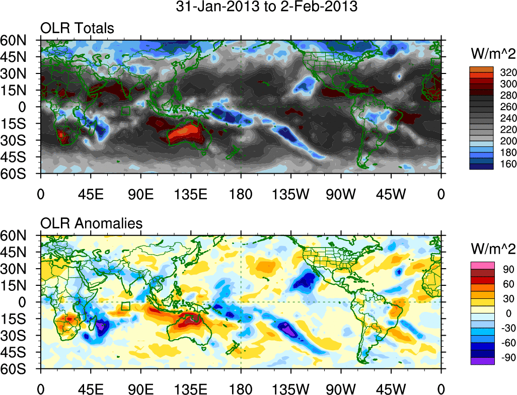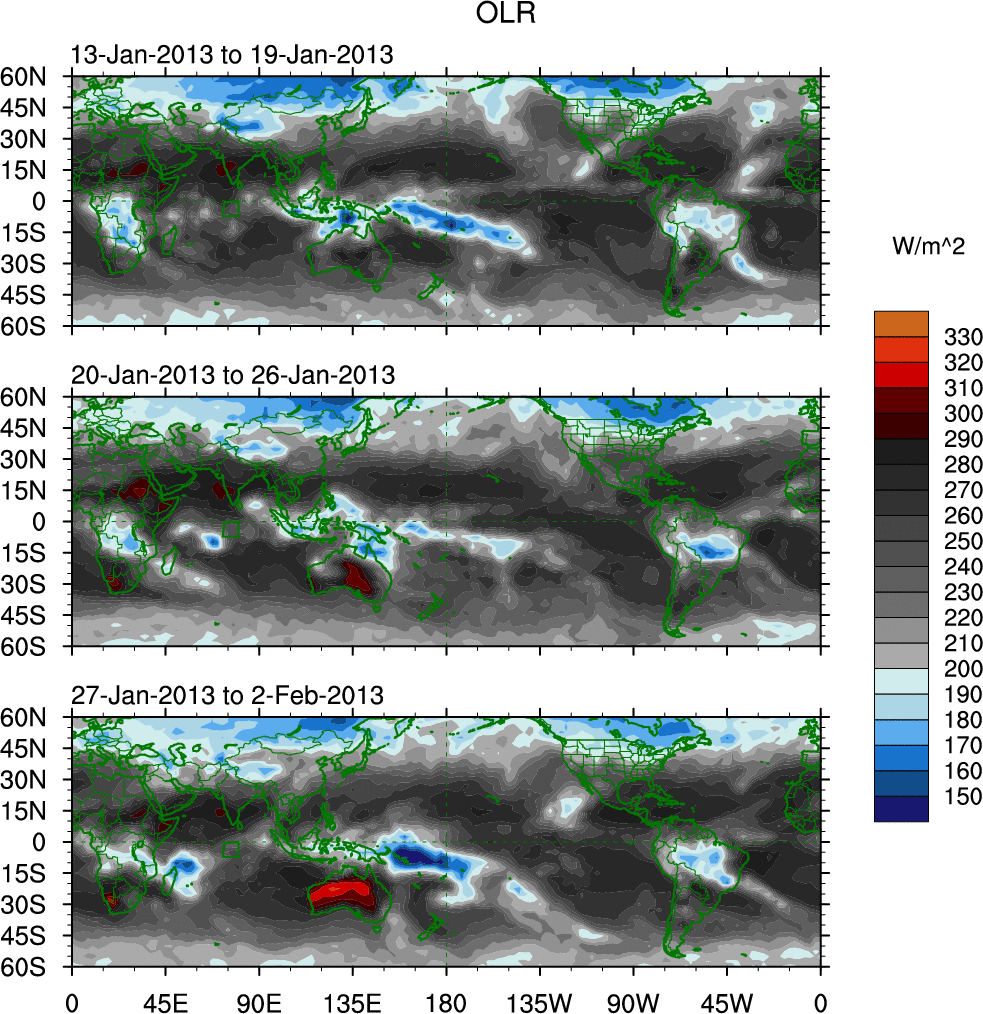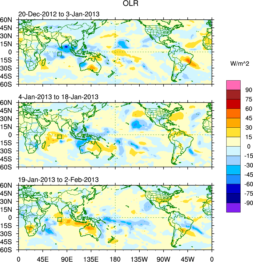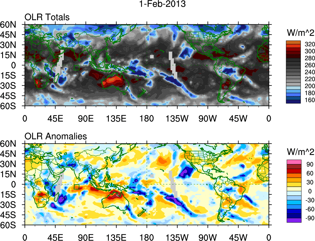 To identify tropical waves in near real-time, the OLR and UTWV data are filtered following Wheeler & Weickmann (2001 MWR). The daily anomalies are calculated using the first 3 harmonics of the seasonal cycle for 1979–2009. Missing values are then filled using linear interpolation in space and time. The most recent 365 days of anomalies are padded with 659 days of zeroes, and the result is filtered for each wave type.