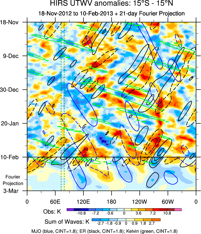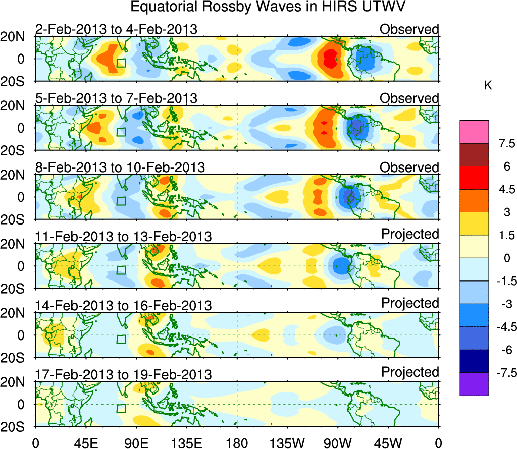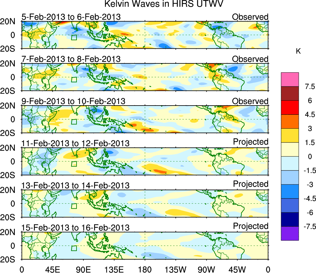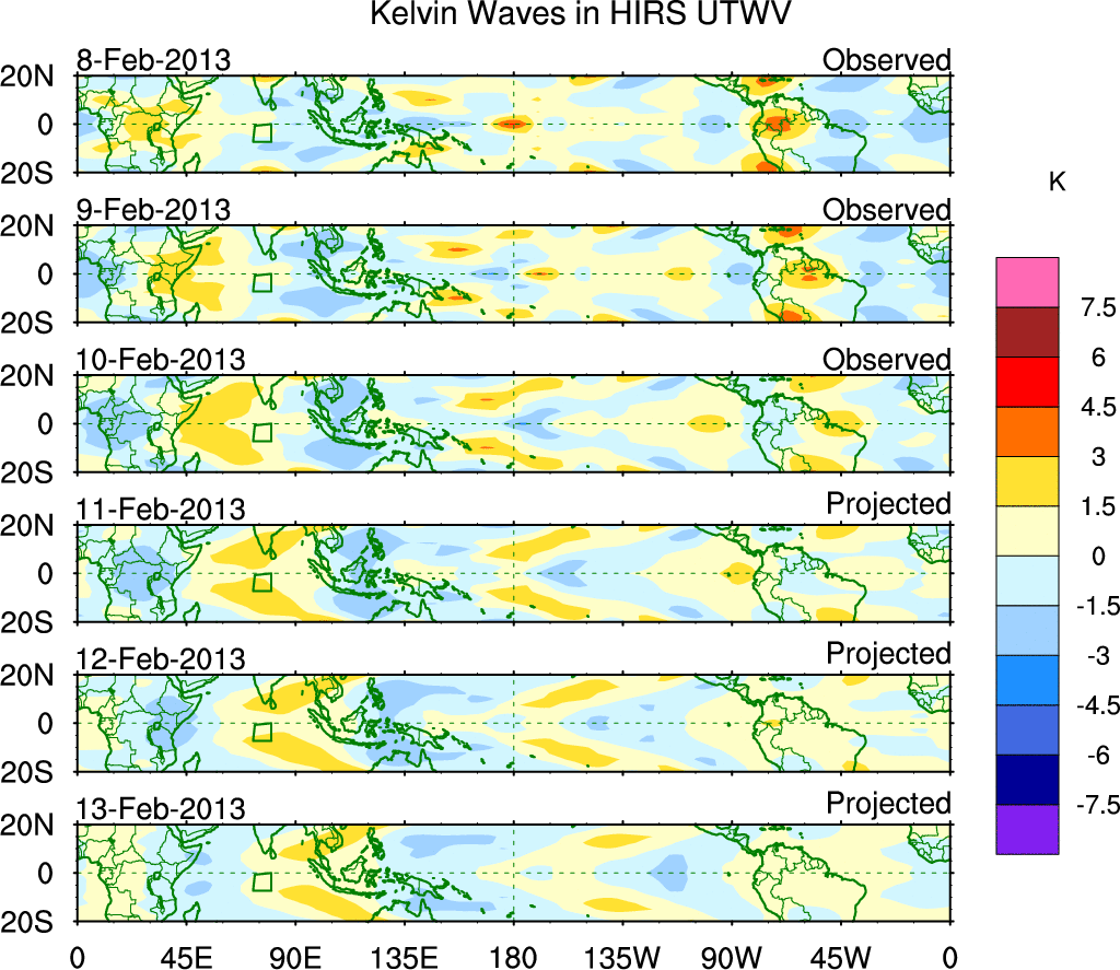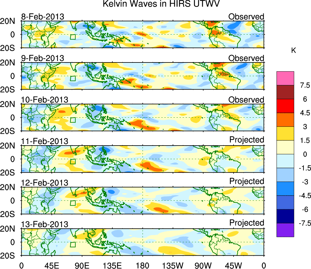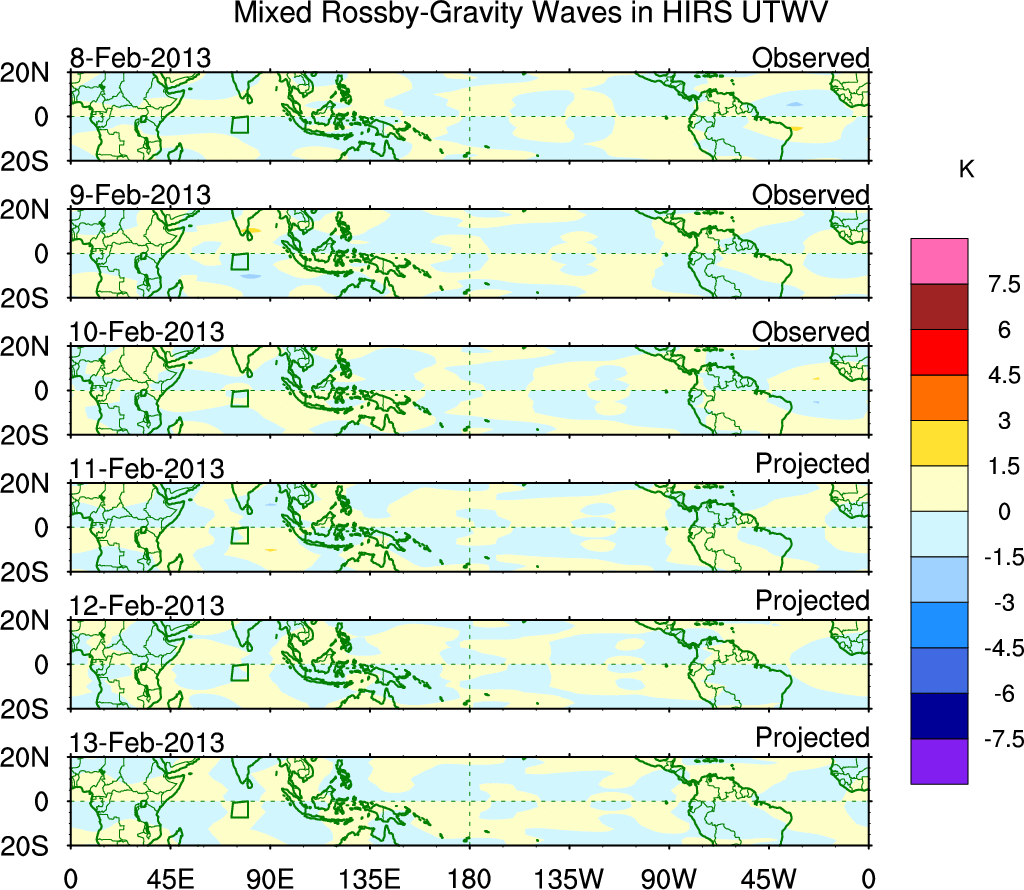 To identify tropical waves in near real-time, the OLR and UTWV data are filtered following Wheeler & Weickmann (2001 MWR). The daily anomalies are calculated using the first 3 harmonics of the seasonal cycle for 1979–2009. Missing values are then filled using linear interpolation in space and time. The most recent 365 days of anomalies are padded with 659 days of zeroes, and the result is filtered for each wave type.