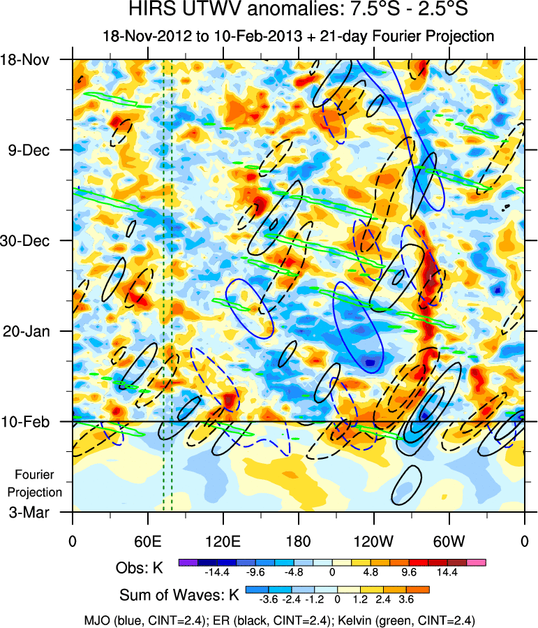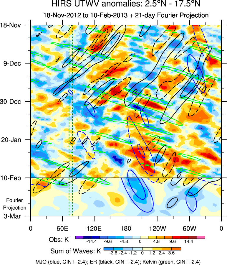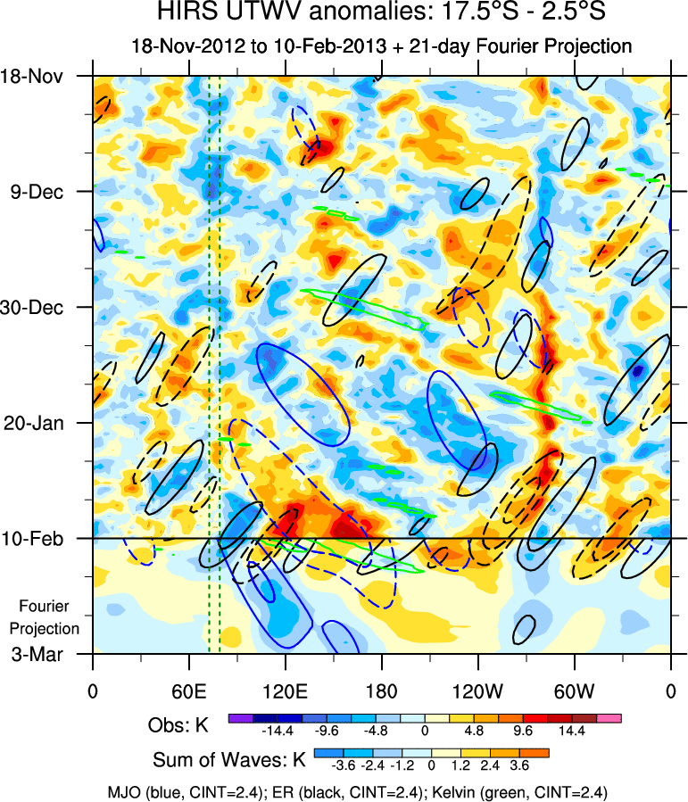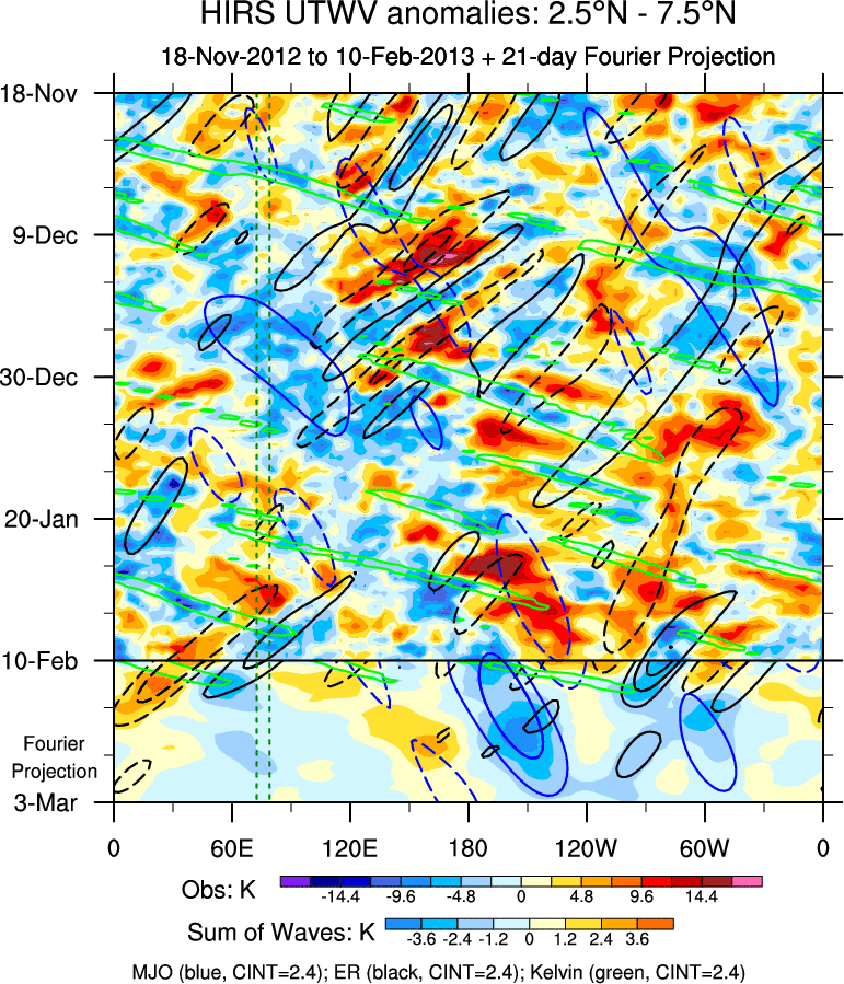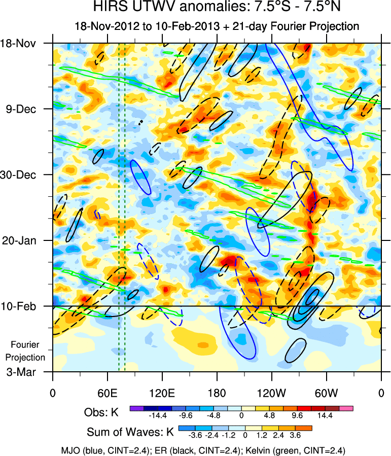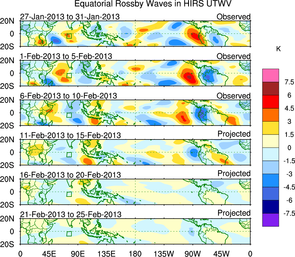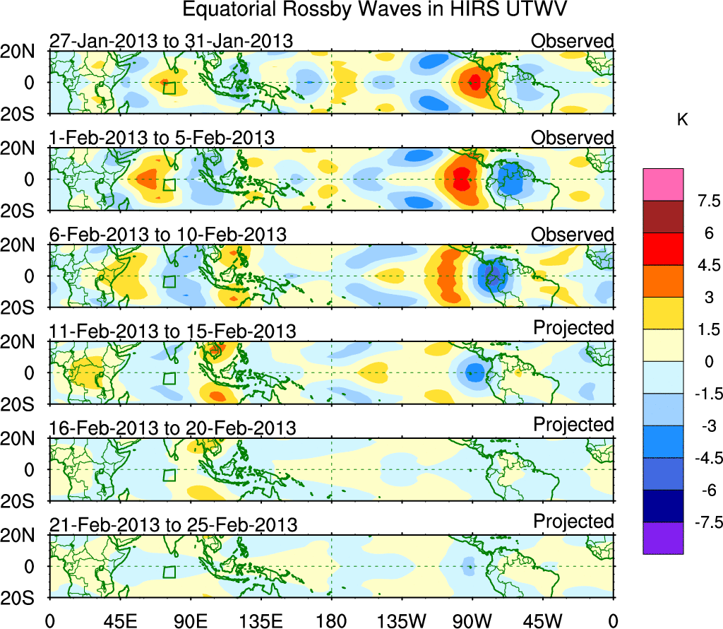 To identify tropical waves in near real-time, the OLR and UTWV data are filtered following Wheeler & Weickmann (2001 MWR). The daily anomalies are calculated using the first 3 harmonics of the seasonal cycle for 1979–2009. Missing values are then filled using linear interpolation in space and time. The most recent 365 days of anomalies are padded with 659 days of zeroes, and the result is filtered for each wave type.