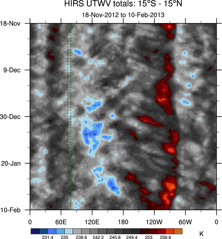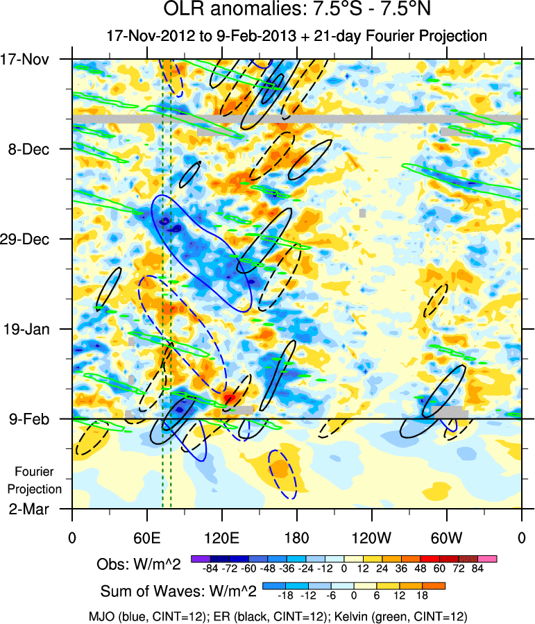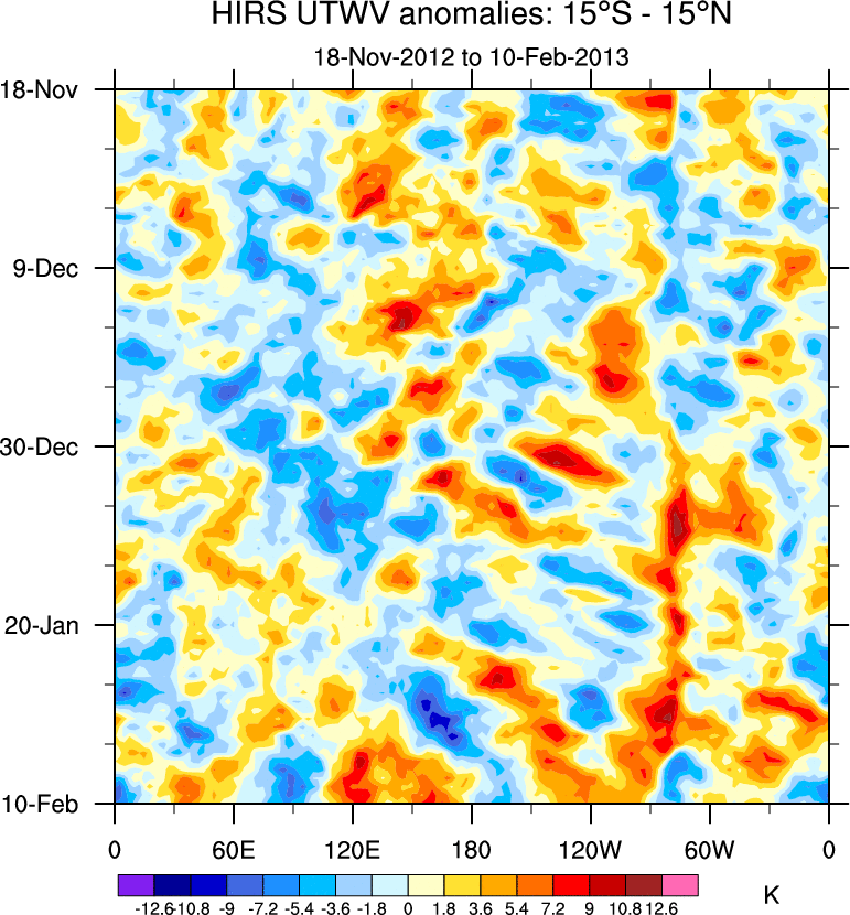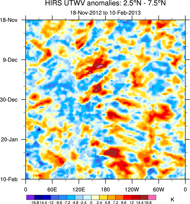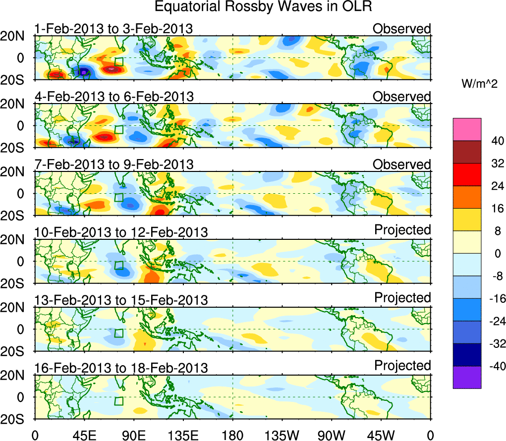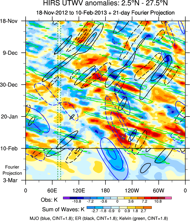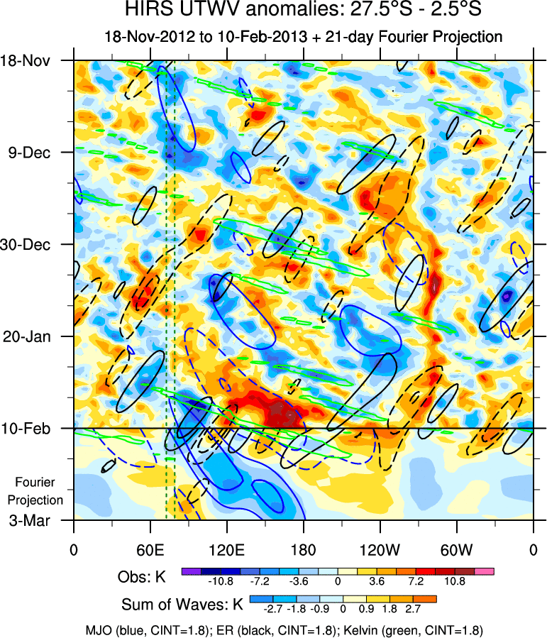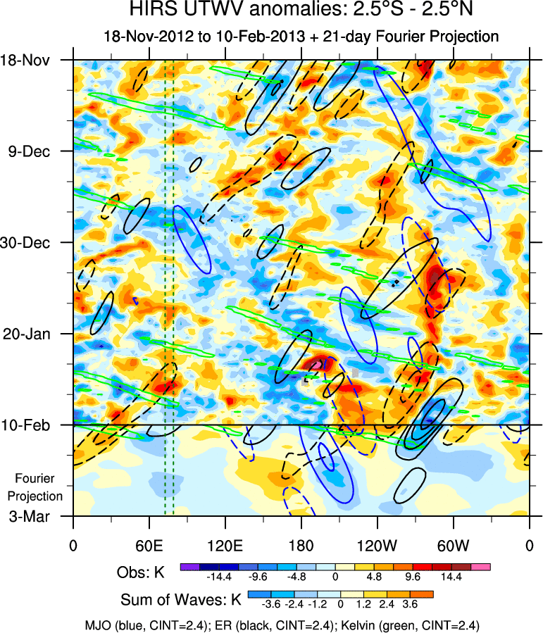 To identify tropical waves in near real-time, the OLR and UTWV data are filtered following Wheeler & Weickmann (2001 MWR). The daily anomalies are calculated using the first 3 harmonics of the seasonal cycle for 1979–2009. Missing values are then filled using linear interpolation in space and time. The most recent 365 days of anomalies are padded with 659 days of zeroes, and the result is filtered for each wave type.