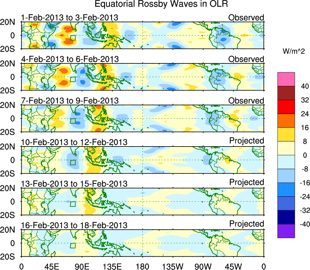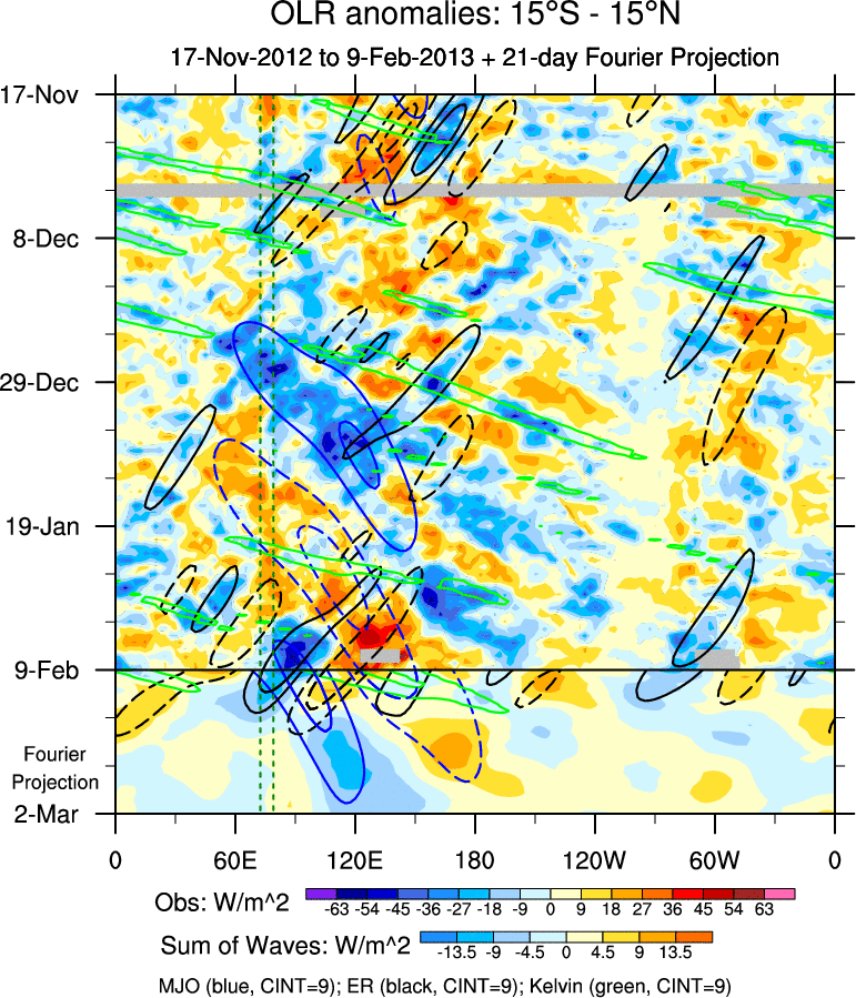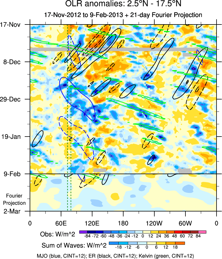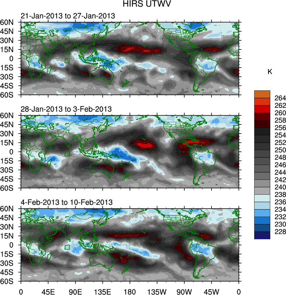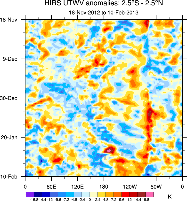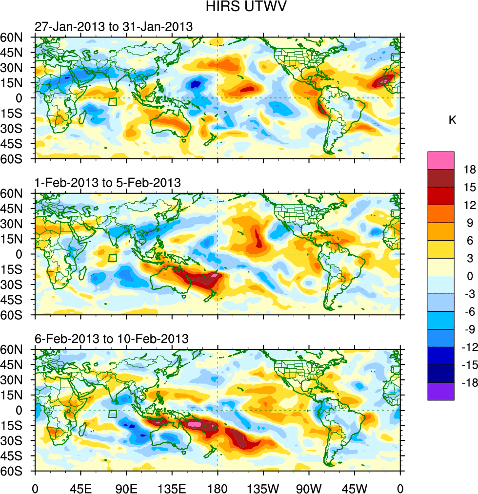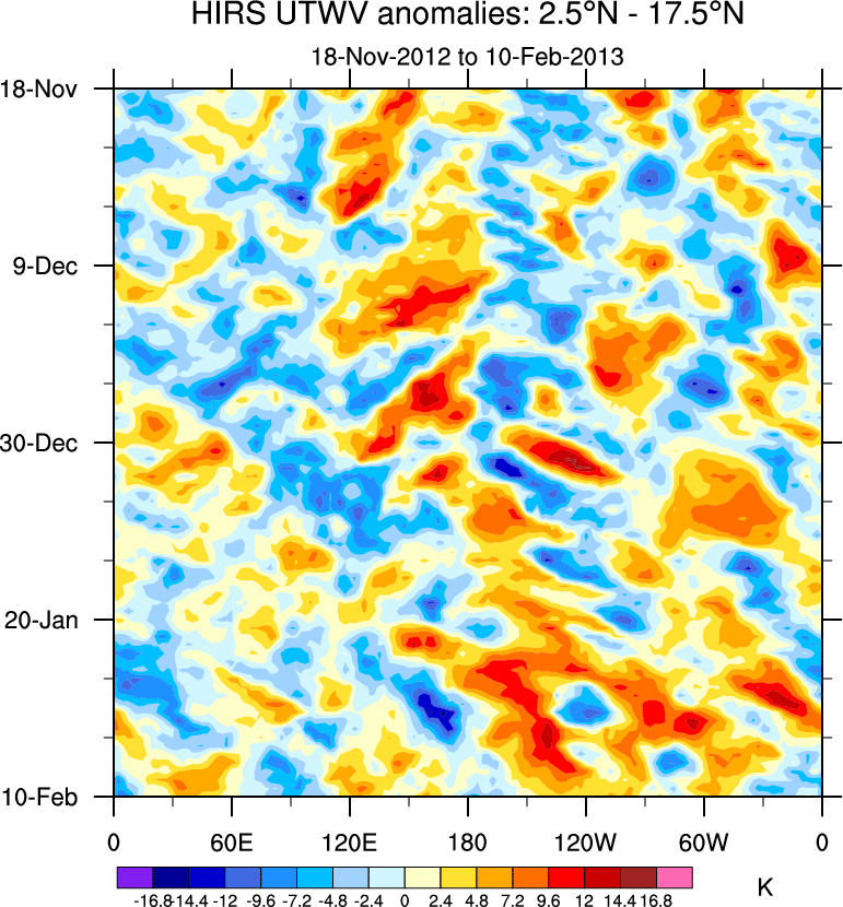 To identify tropical waves in near real-time, the OLR and UTWV data are filtered following Wheeler & Weickmann (2001 MWR). The daily anomalies are calculated using the first 3 harmonics of the seasonal cycle for 1979–2009. Missing values are then filled using linear interpolation in space and time. The most recent 365 days of anomalies are padded with 659 days of zeroes, and the result is filtered for each wave type.