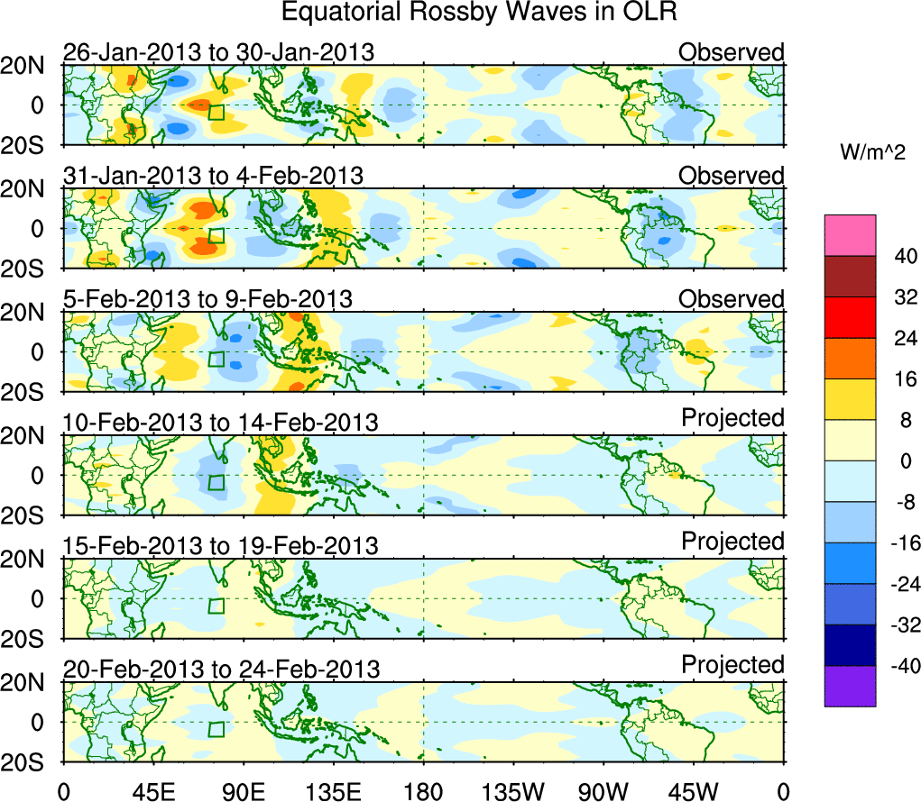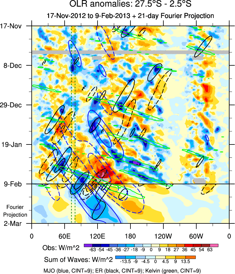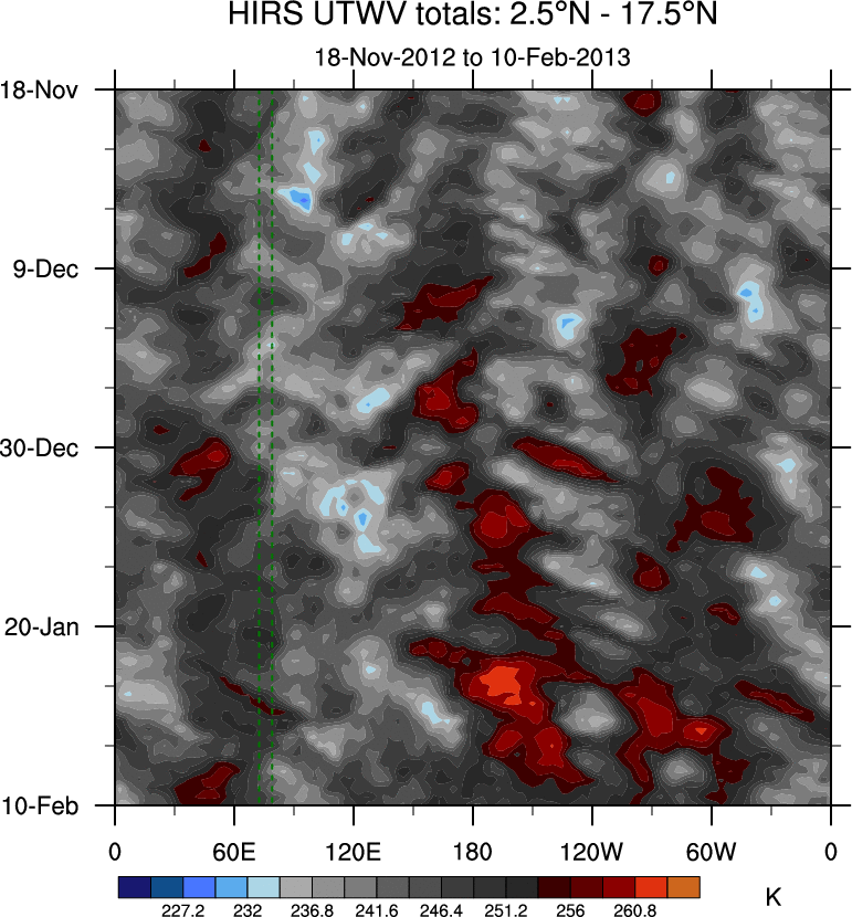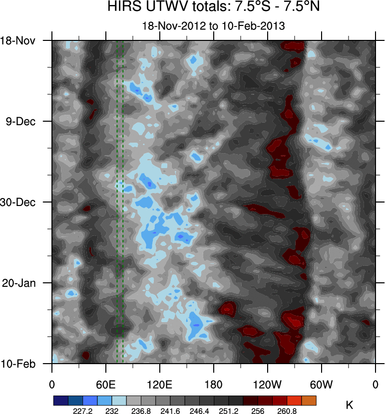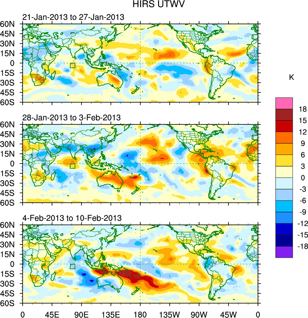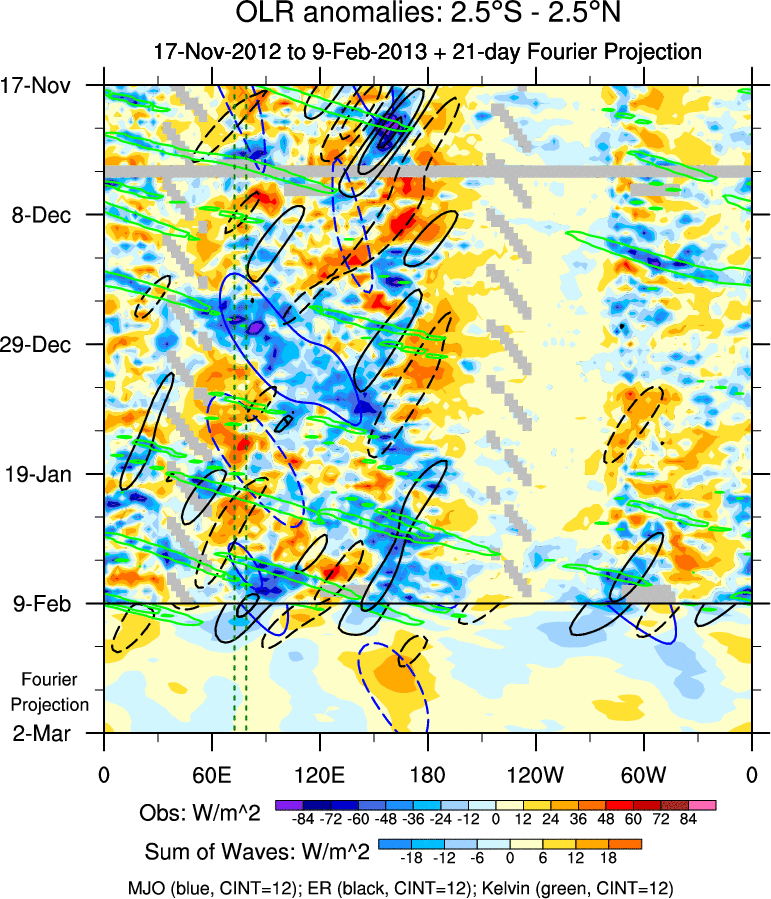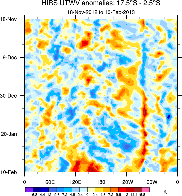 To identify tropical waves in near real-time, the OLR and UTWV data are filtered following Wheeler & Weickmann (2001 MWR). The daily anomalies are calculated using the first 3 harmonics of the seasonal cycle for 1979–2009. Missing values are then filled using linear interpolation in space and time. The most recent 365 days of anomalies are padded with 659 days of zeroes, and the result is filtered for each wave type.