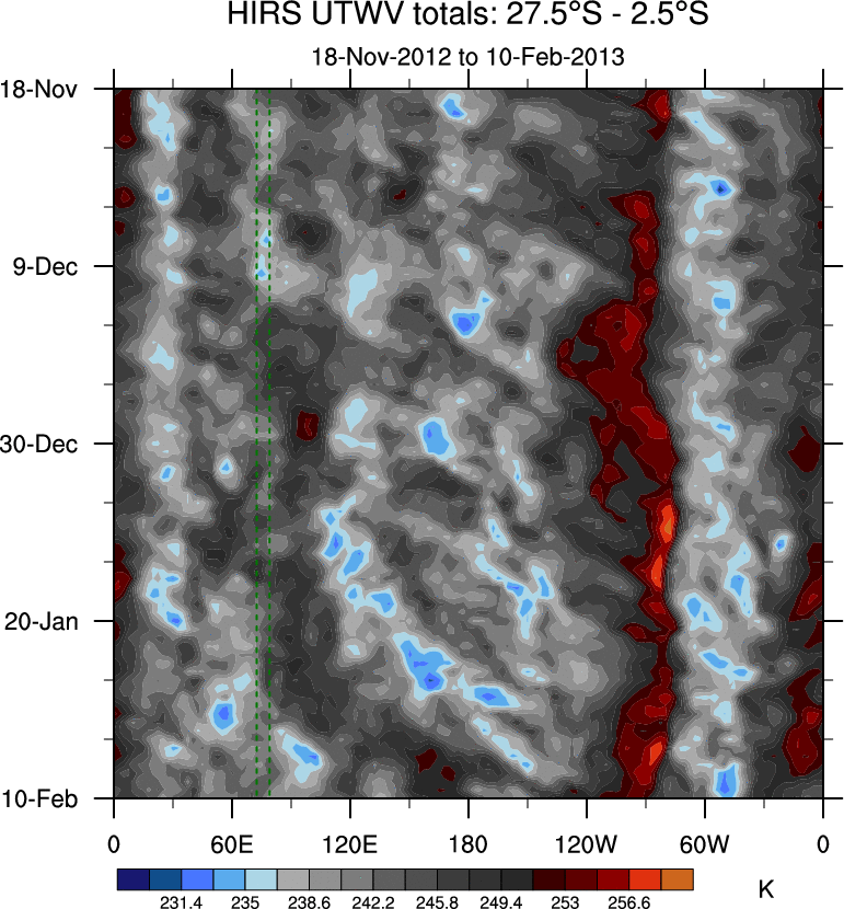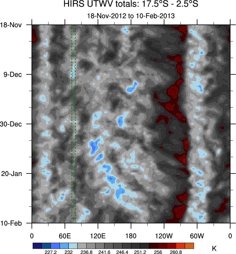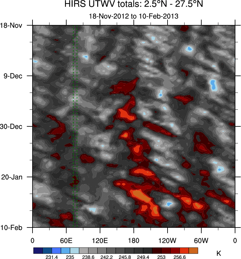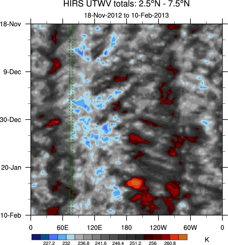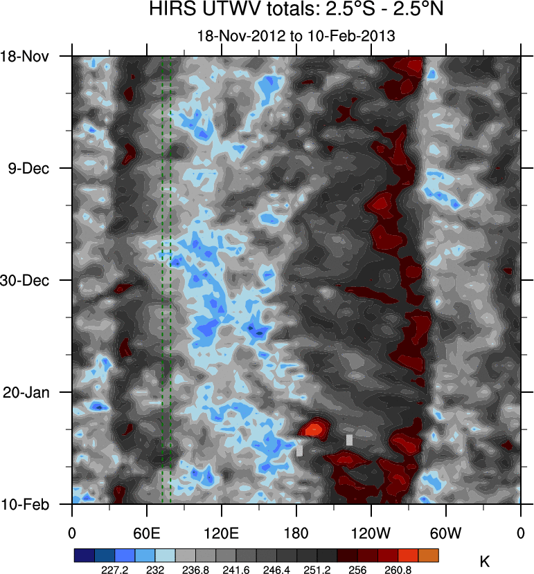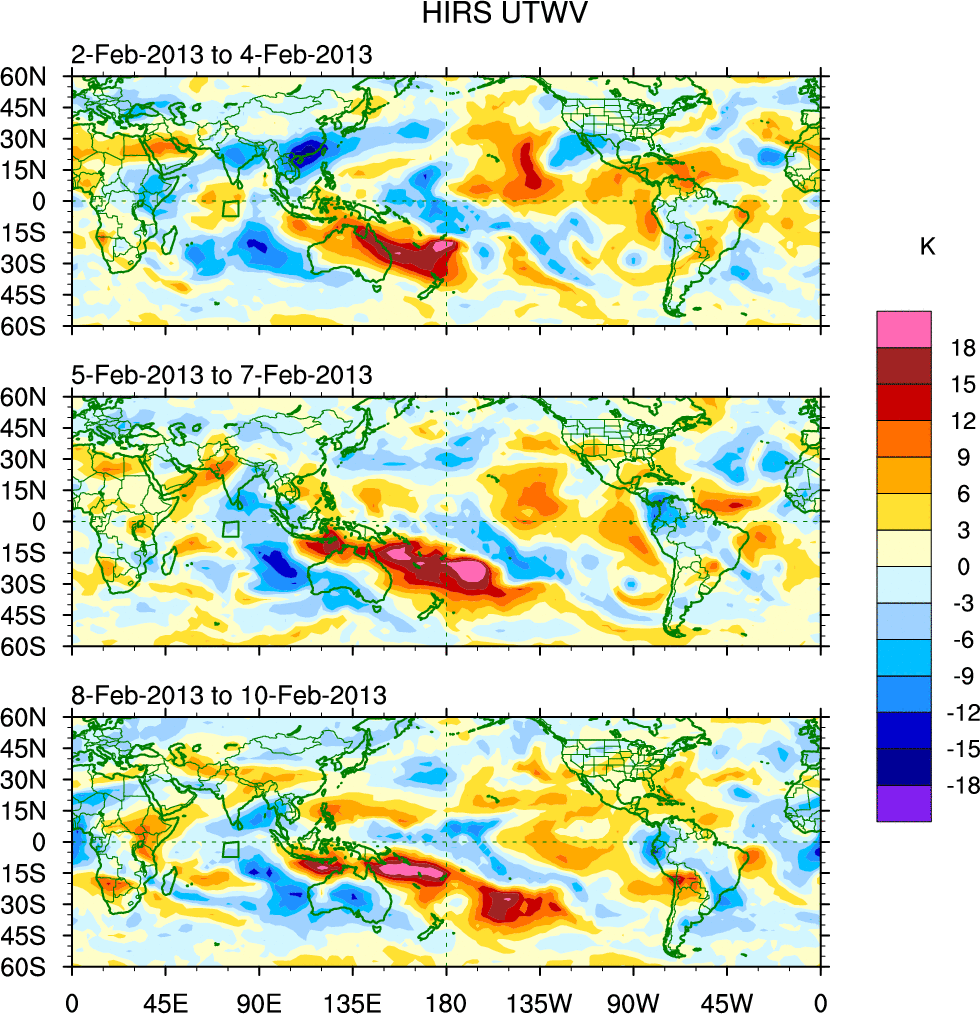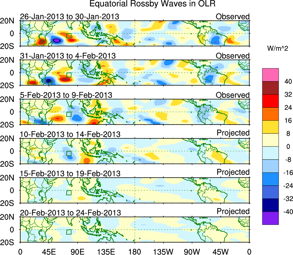 To identify tropical waves in near real-time, the OLR and UTWV data are filtered following Wheeler & Weickmann (2001 MWR). The daily anomalies are calculated using the first 3 harmonics of the seasonal cycle for 1979–2009. Missing values are then filled using linear interpolation in space and time. The most recent 365 days of anomalies are padded with 659 days of zeroes, and the result is filtered for each wave type.