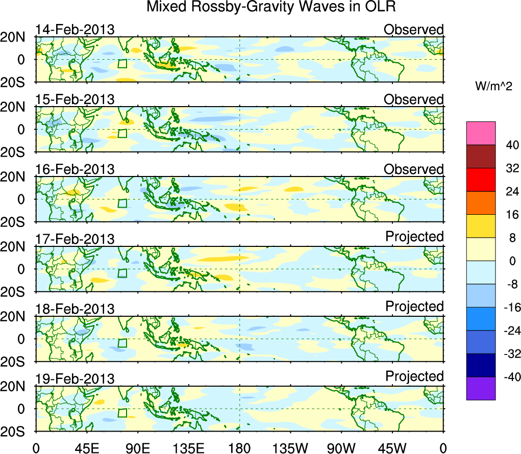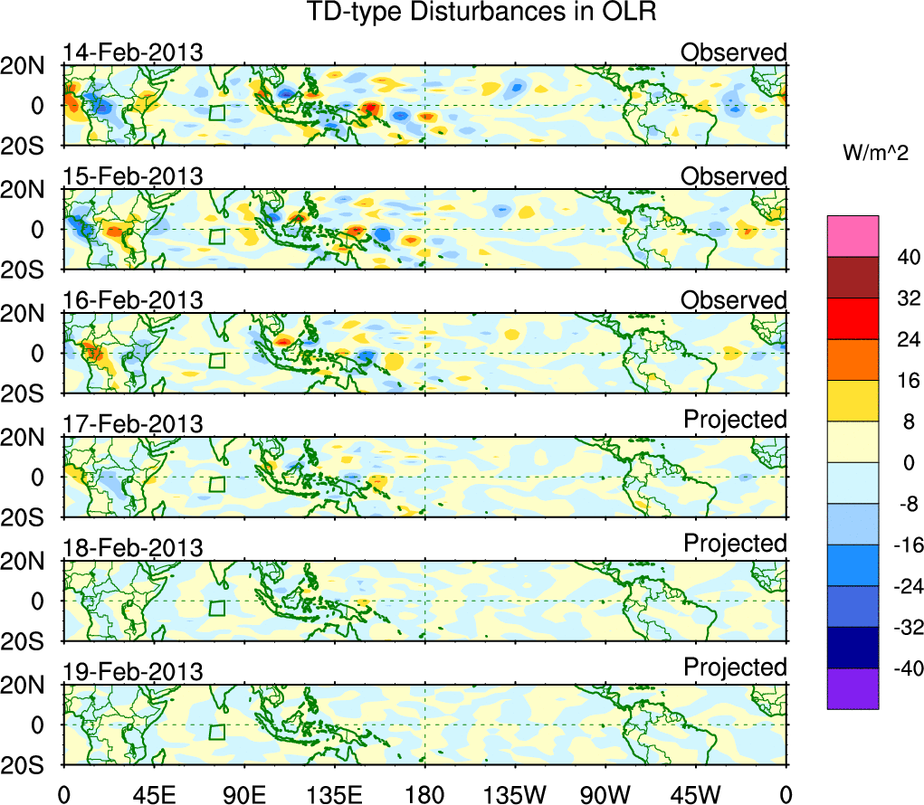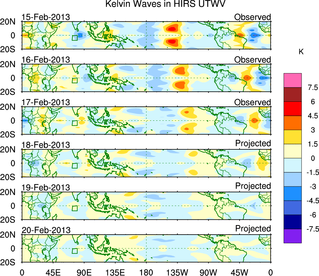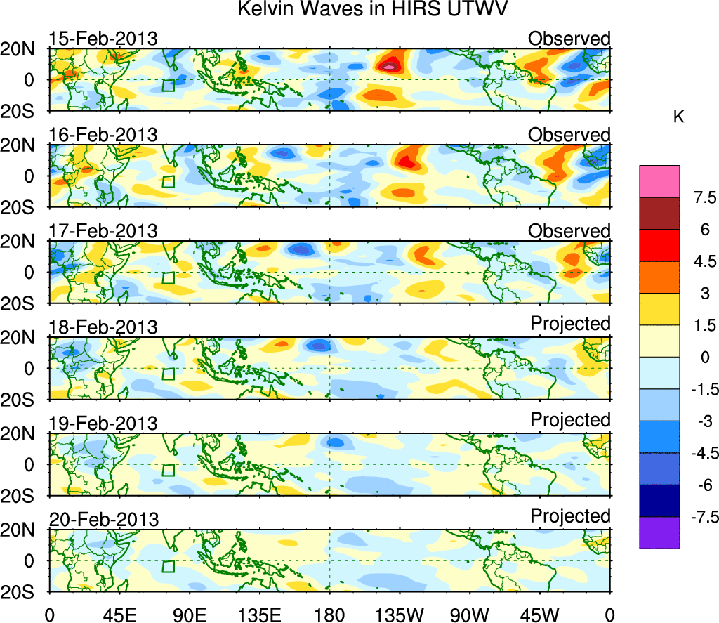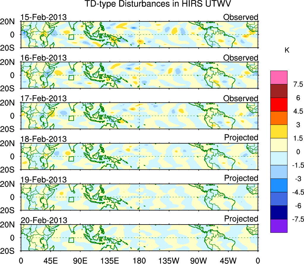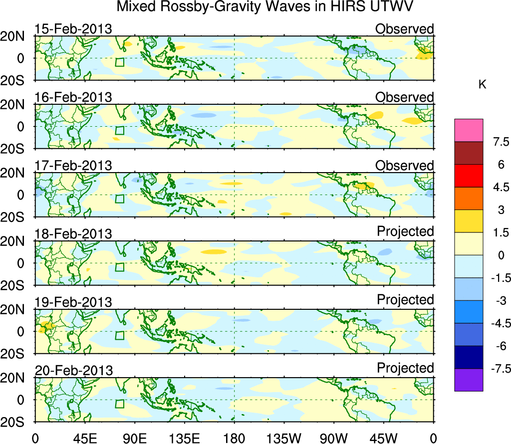 To identify tropical waves in near real-time, the OLR and UTWV data are filtered following Wheeler & Weickmann (2001 MWR). The daily anomalies are calculated using the first 3 harmonics of the seasonal cycle for 1979–2009. Missing values are then filled using linear interpolation in space and time. The most recent 365 days of anomalies are padded with 659 days of zeroes, and the result is filtered for each wave type.