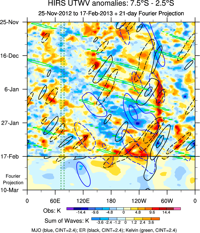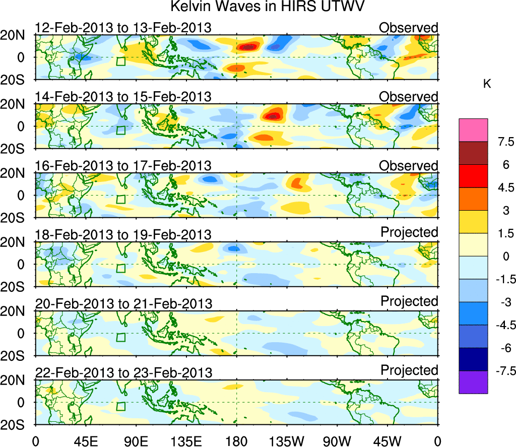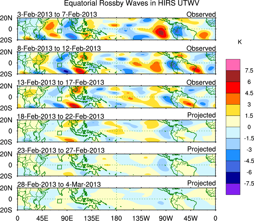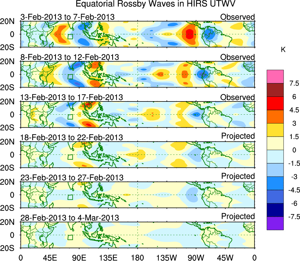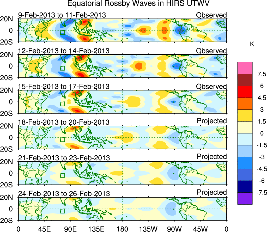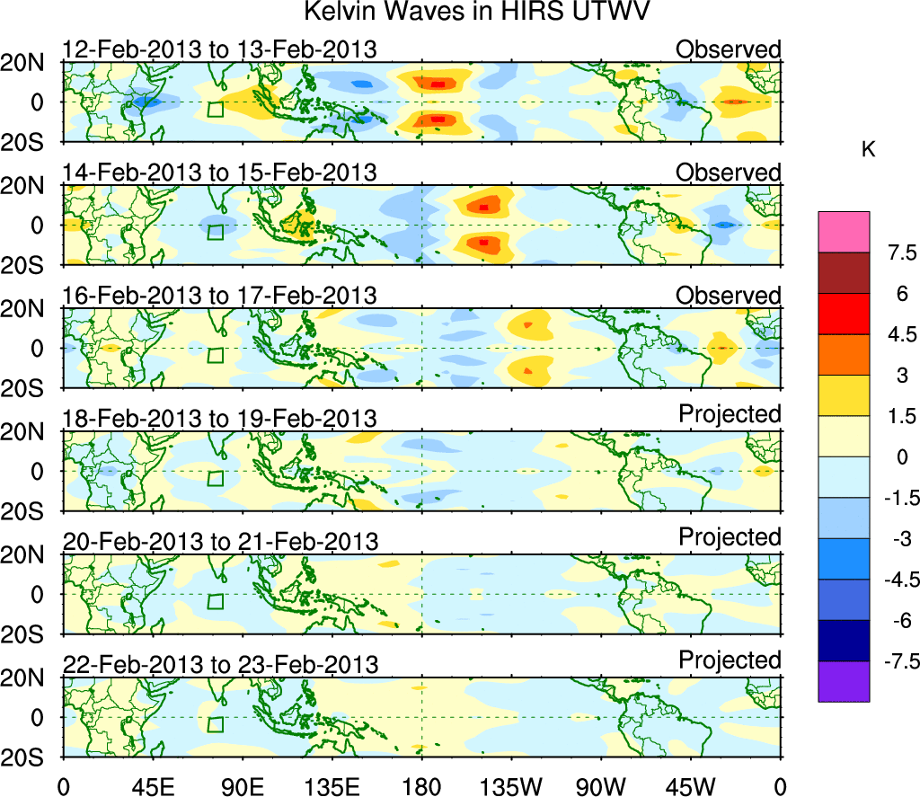 To identify tropical waves in near real-time, the OLR and UTWV data are filtered following Wheeler & Weickmann (2001 MWR). The daily anomalies are calculated using the first 3 harmonics of the seasonal cycle for 1979–2009. Missing values are then filled using linear interpolation in space and time. The most recent 365 days of anomalies are padded with 659 days of zeroes, and the result is filtered for each wave type.