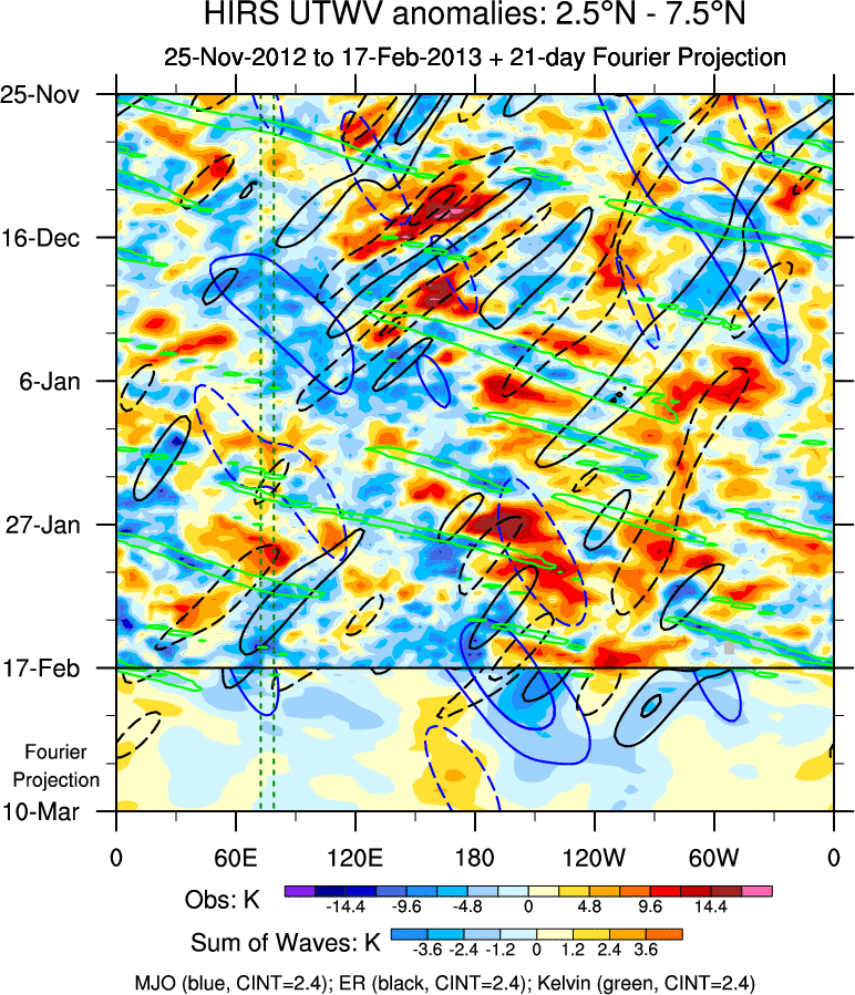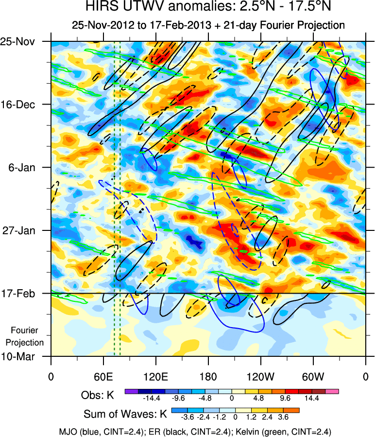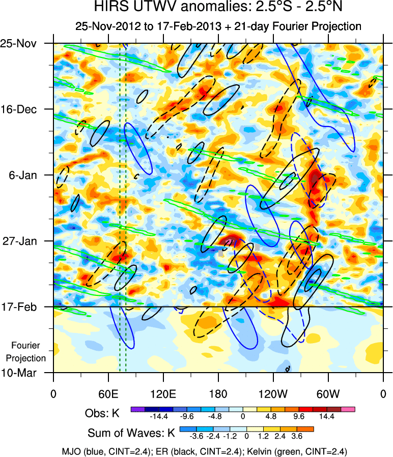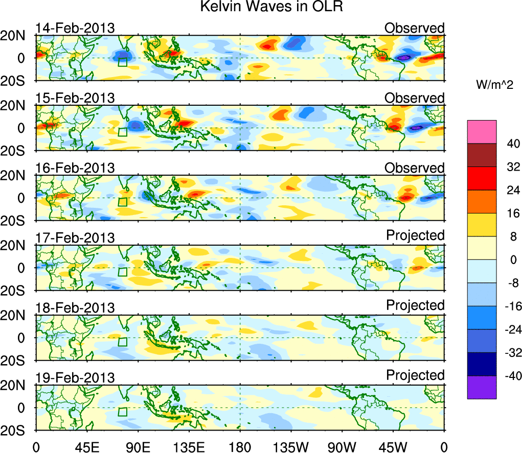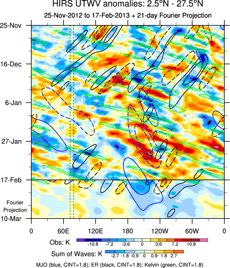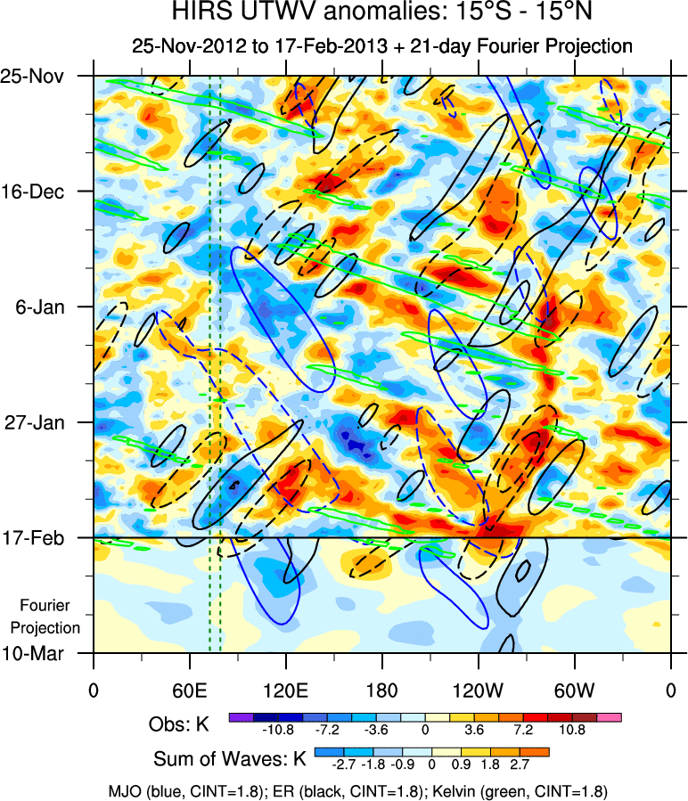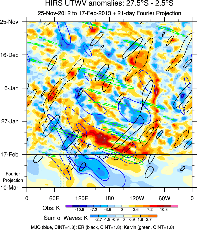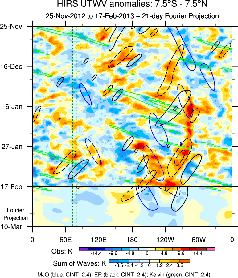 To identify tropical waves in near real-time, the OLR and UTWV data are filtered following Wheeler & Weickmann (2001 MWR). The daily anomalies are calculated using the first 3 harmonics of the seasonal cycle for 1979–2009. Missing values are then filled using linear interpolation in space and time. The most recent 365 days of anomalies are padded with 659 days of zeroes, and the result is filtered for each wave type.