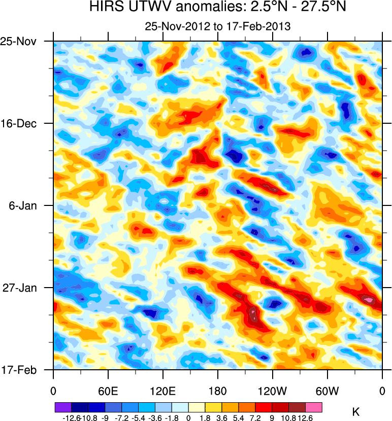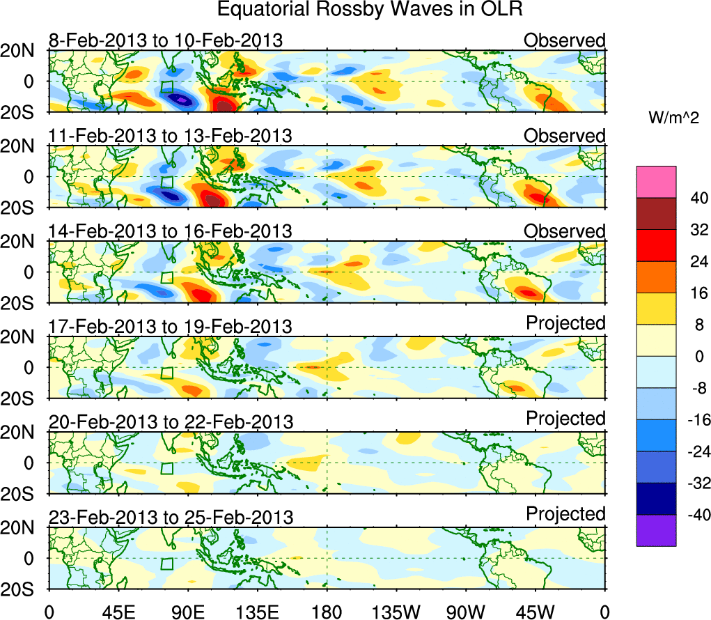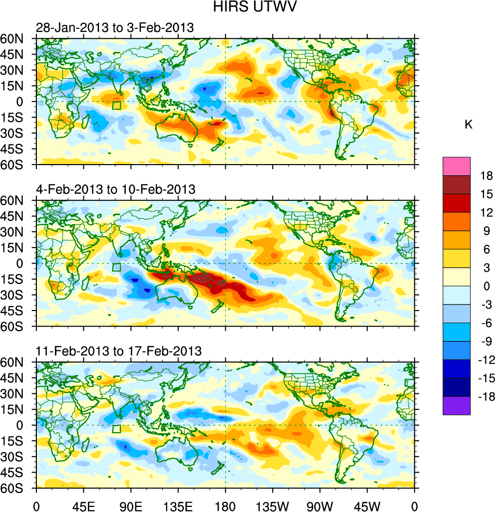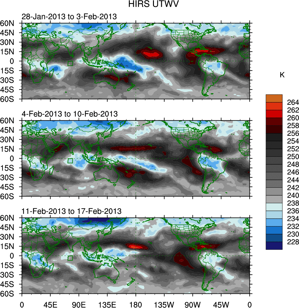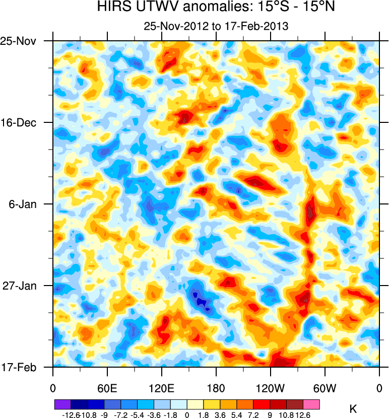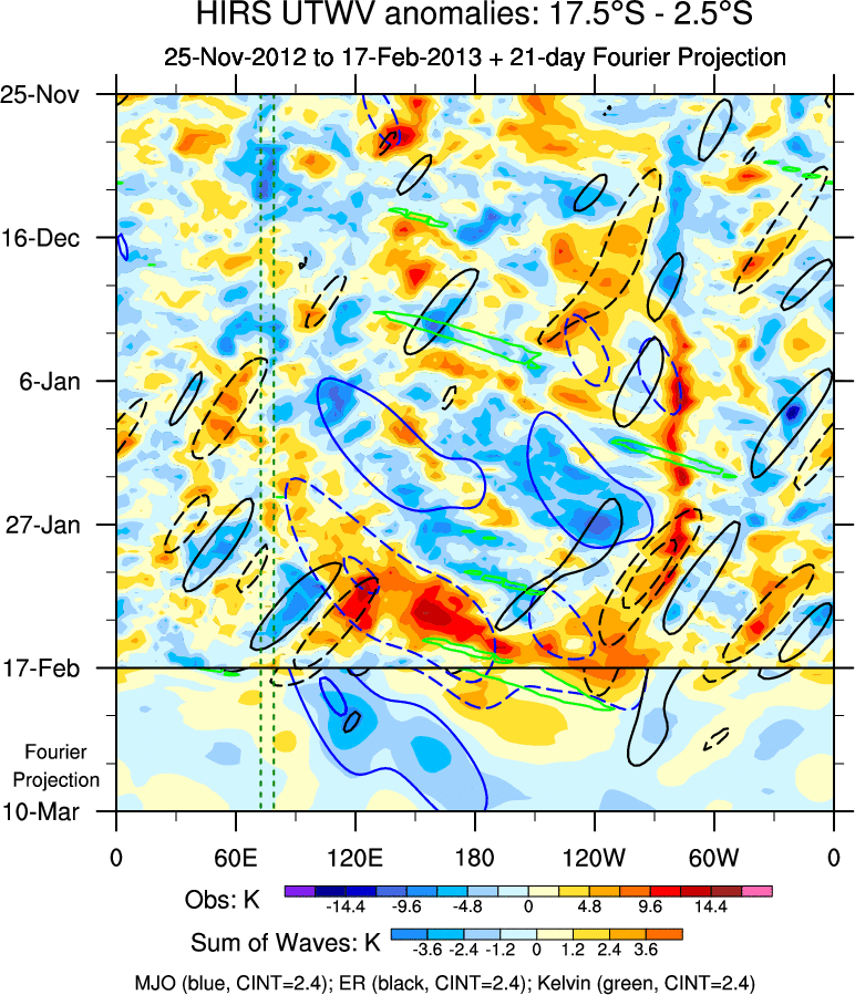 To identify tropical waves in near real-time, the OLR and UTWV data are filtered following Wheeler & Weickmann (2001 MWR). The daily anomalies are calculated using the first 3 harmonics of the seasonal cycle for 1979–2009. Missing values are then filled using linear interpolation in space and time. The most recent 365 days of anomalies are padded with 659 days of zeroes, and the result is filtered for each wave type.