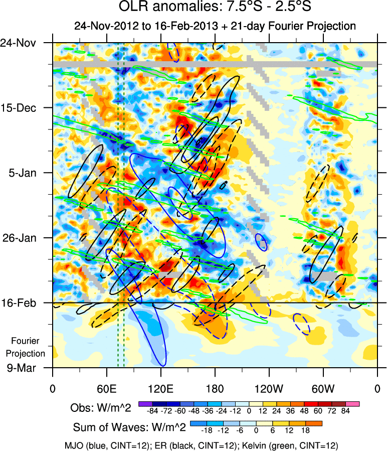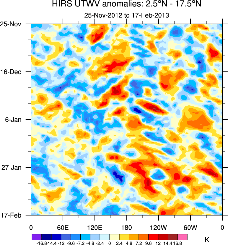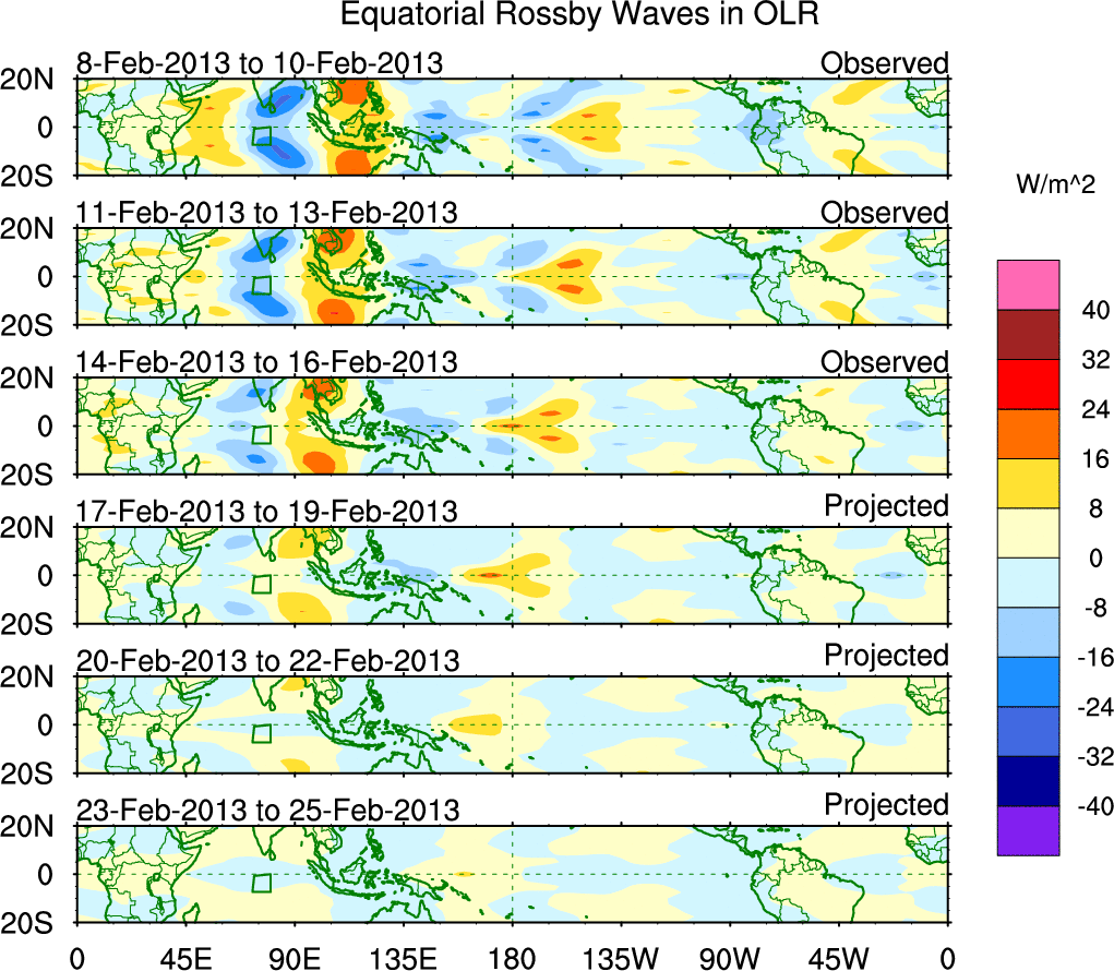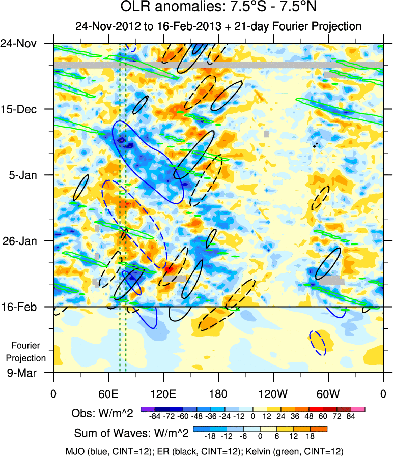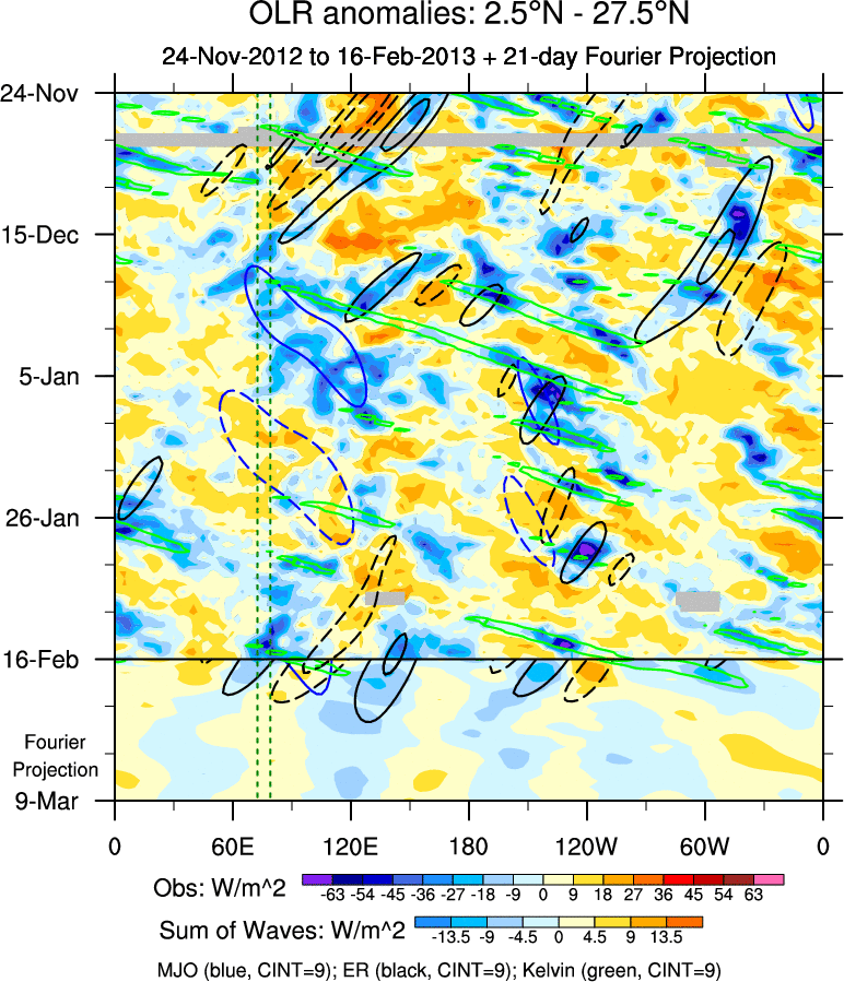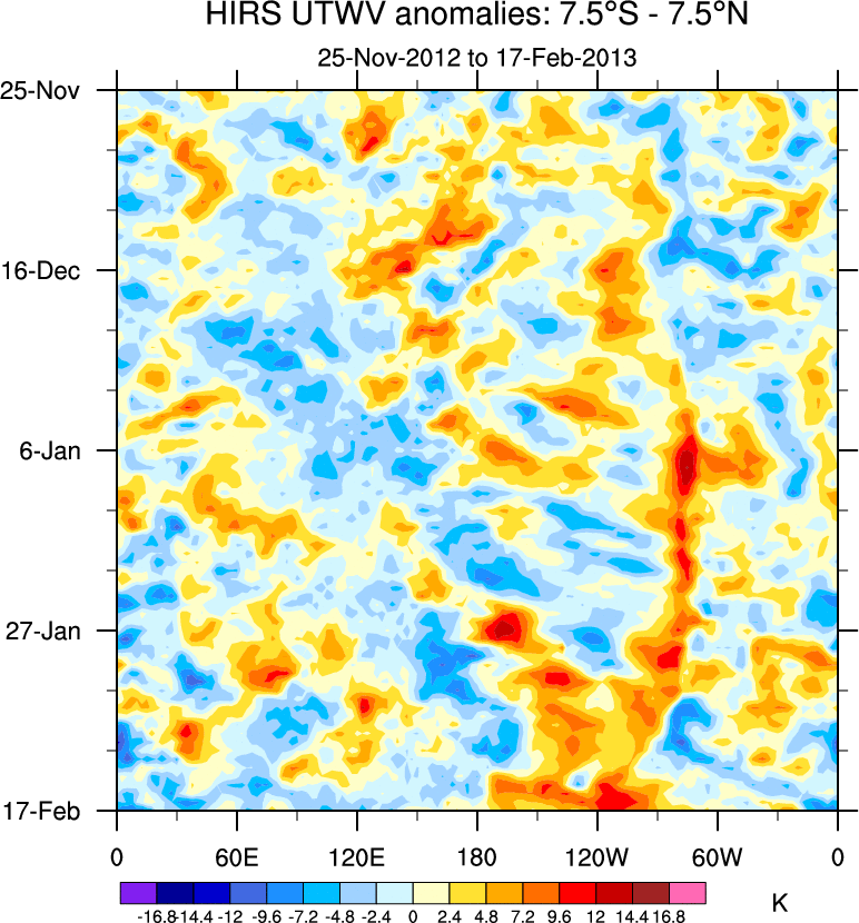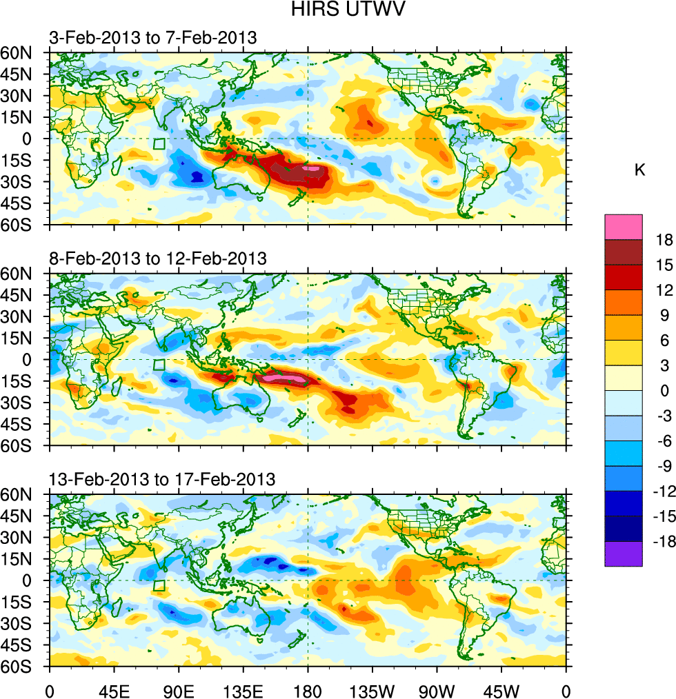 To identify tropical waves in near real-time, the OLR and UTWV data are filtered following Wheeler & Weickmann (2001 MWR). The daily anomalies are calculated using the first 3 harmonics of the seasonal cycle for 1979–2009. Missing values are then filled using linear interpolation in space and time. The most recent 365 days of anomalies are padded with 659 days of zeroes, and the result is filtered for each wave type.