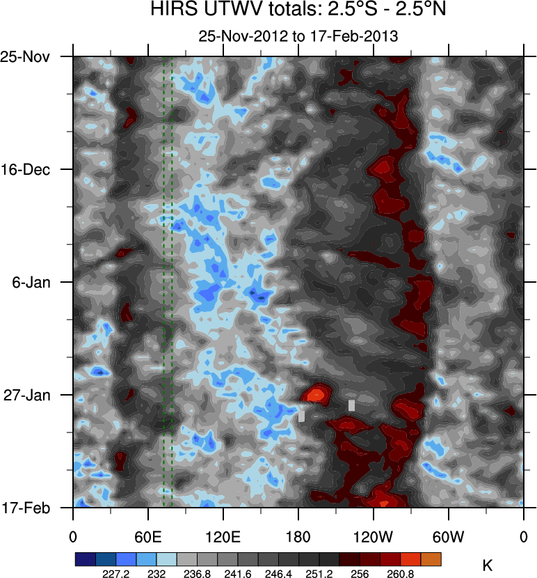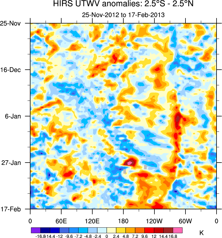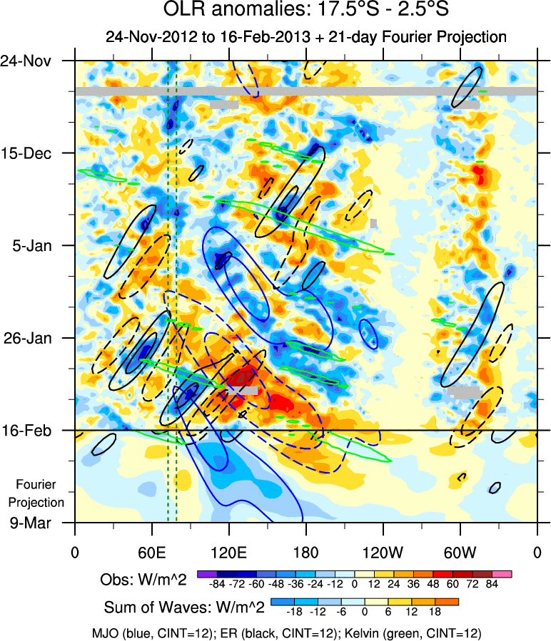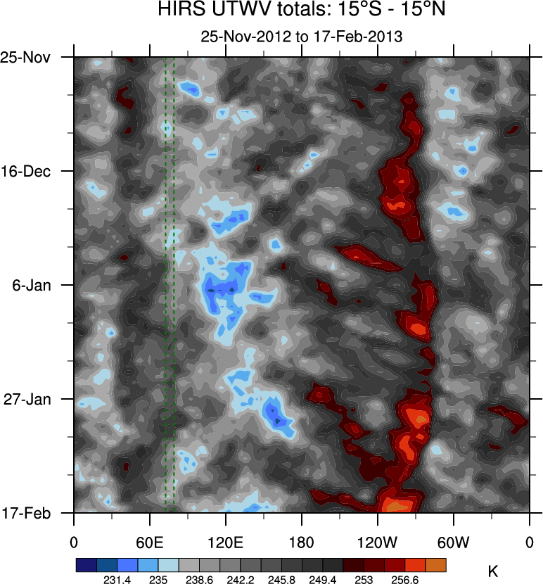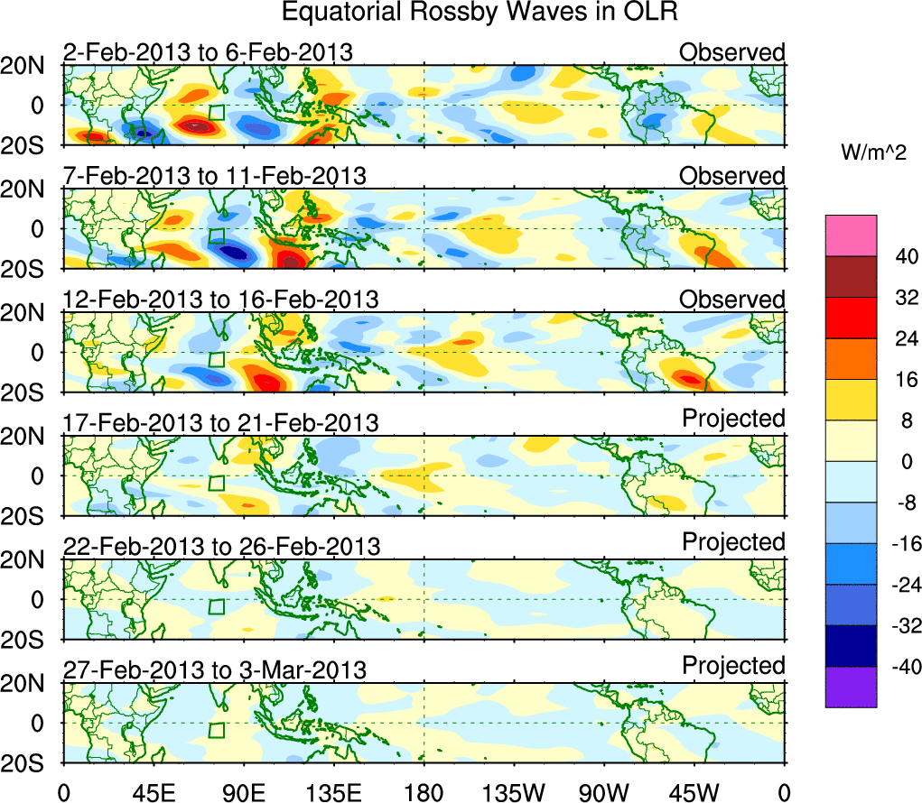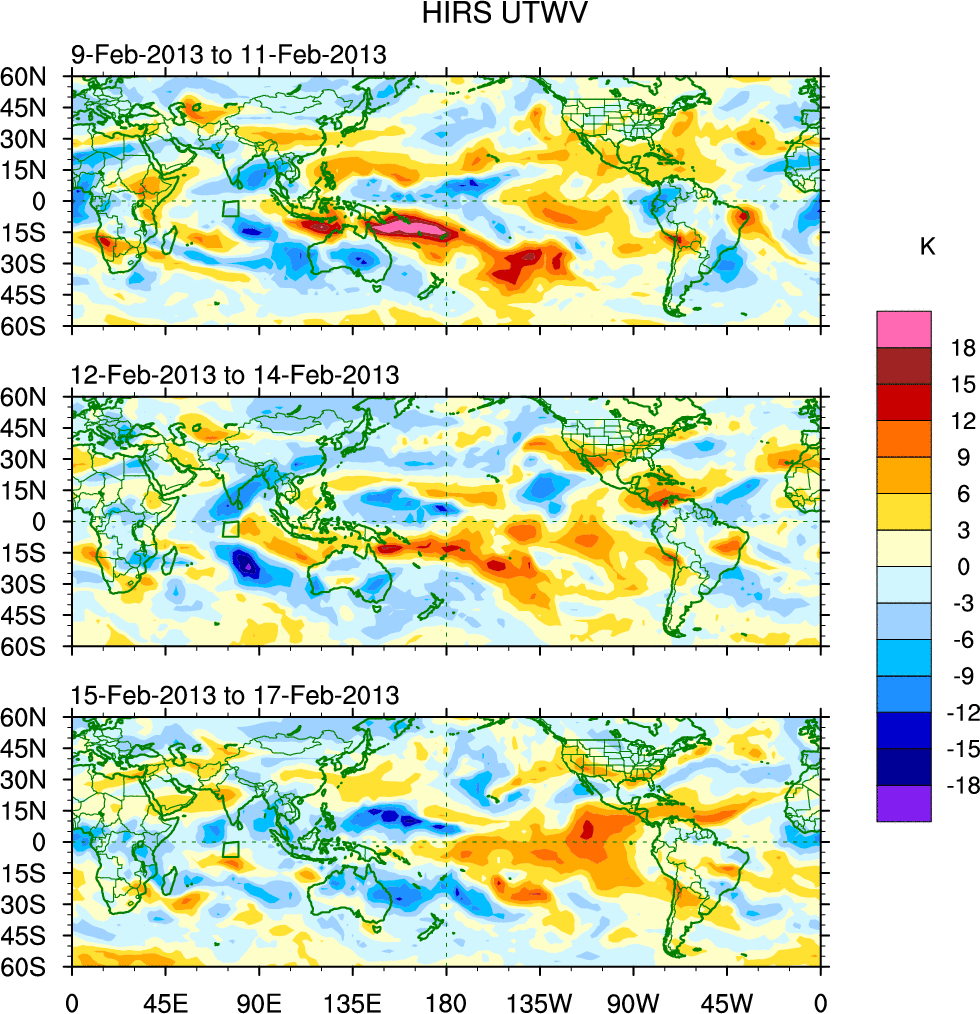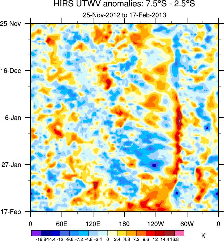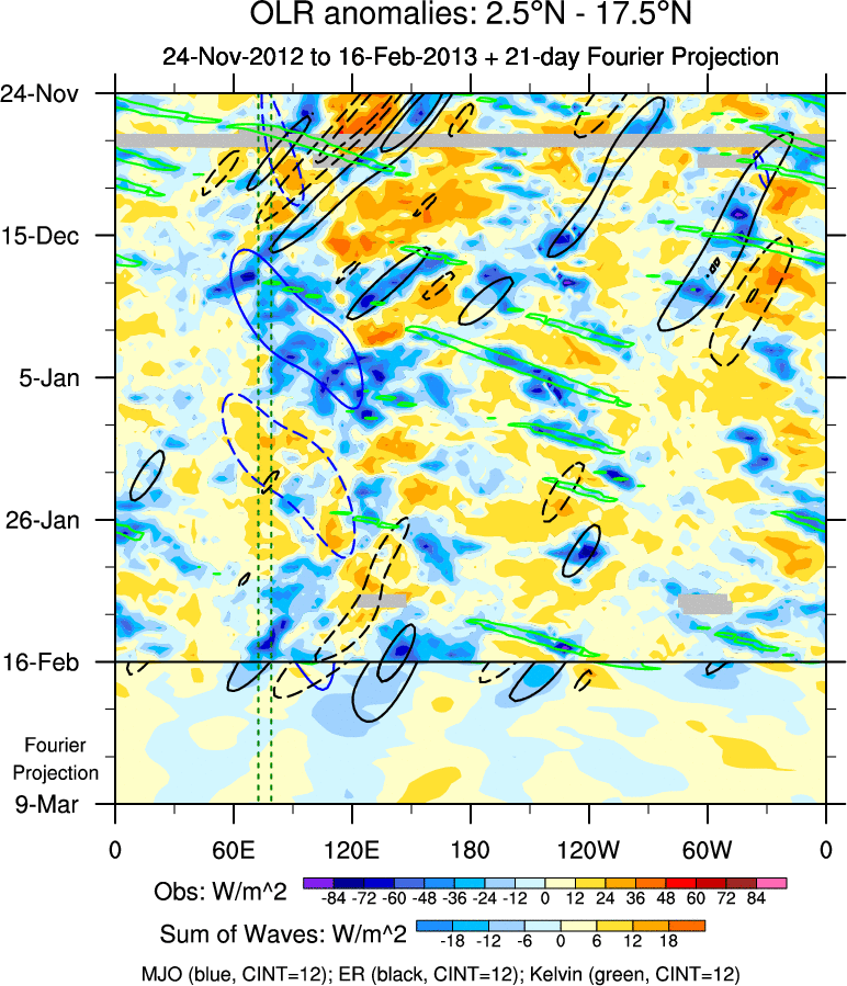 To identify tropical waves in near real-time, the OLR and UTWV data are filtered following Wheeler & Weickmann (2001 MWR). The daily anomalies are calculated using the first 3 harmonics of the seasonal cycle for 1979–2009. Missing values are then filled using linear interpolation in space and time. The most recent 365 days of anomalies are padded with 659 days of zeroes, and the result is filtered for each wave type.