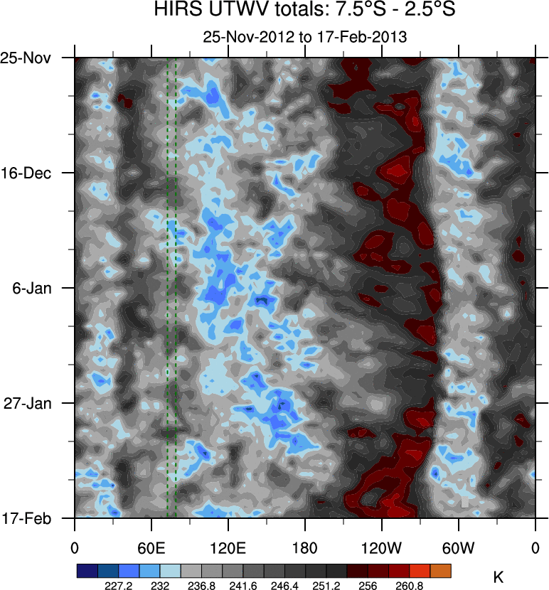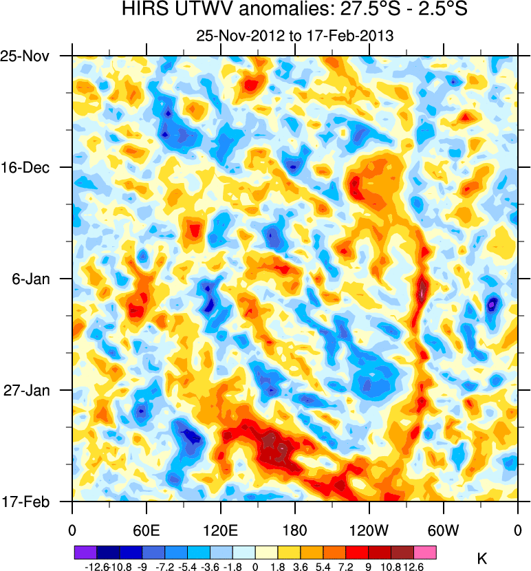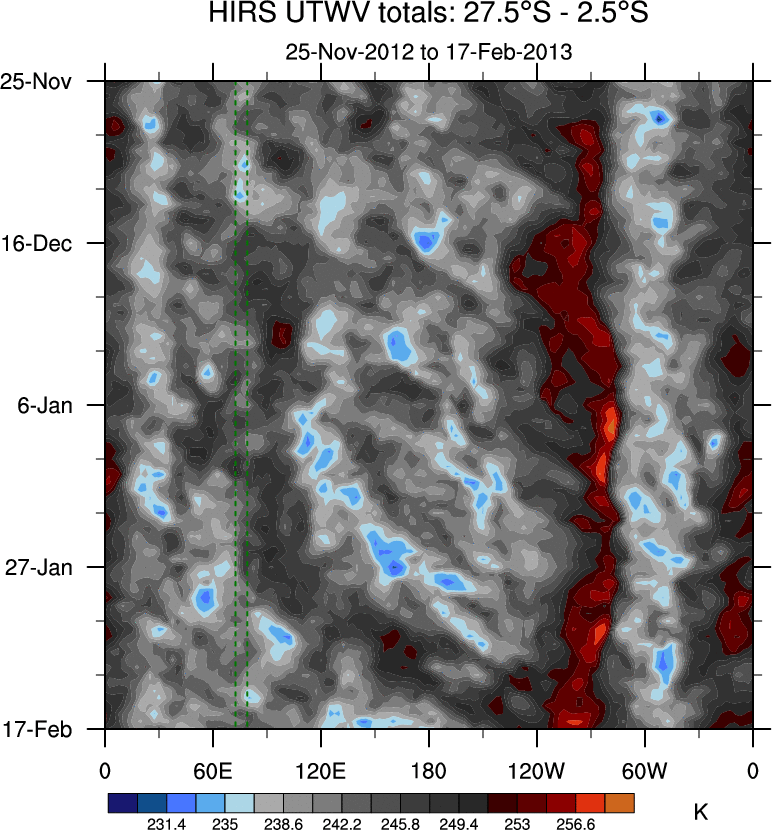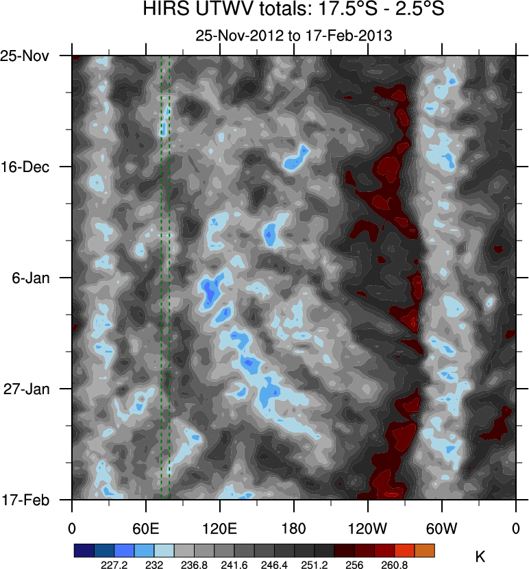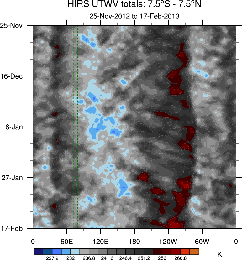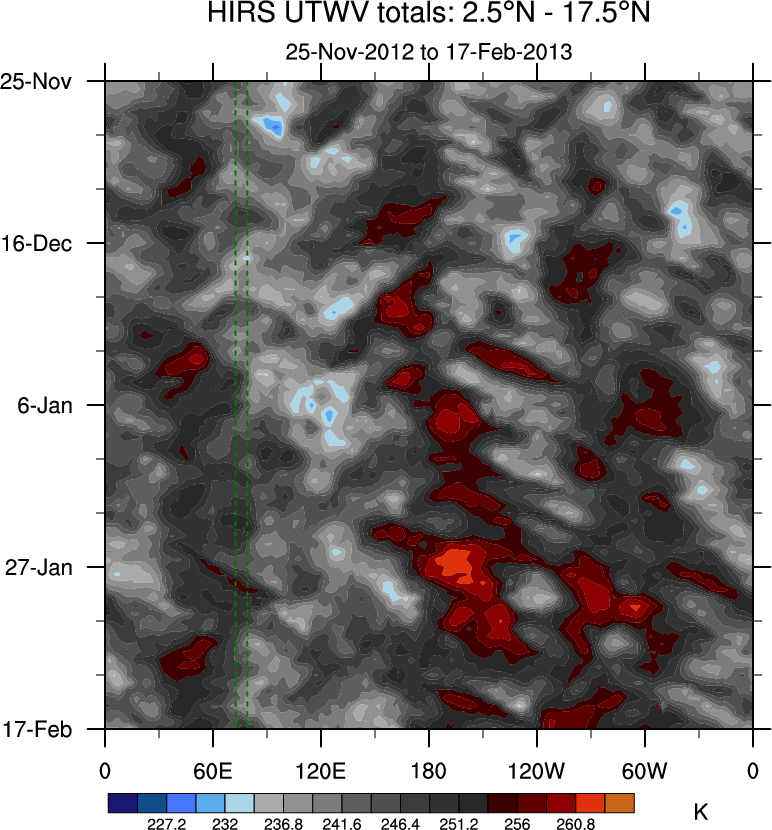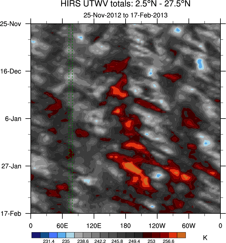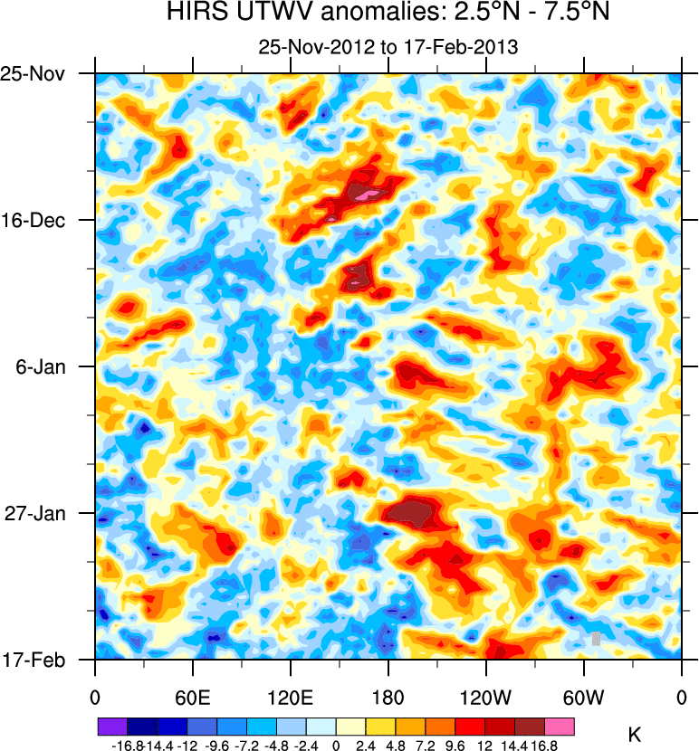 To identify tropical waves in near real-time, the OLR and UTWV data are filtered following Wheeler & Weickmann (2001 MWR). The daily anomalies are calculated using the first 3 harmonics of the seasonal cycle for 1979–2009. Missing values are then filled using linear interpolation in space and time. The most recent 365 days of anomalies are padded with 659 days of zeroes, and the result is filtered for each wave type.
