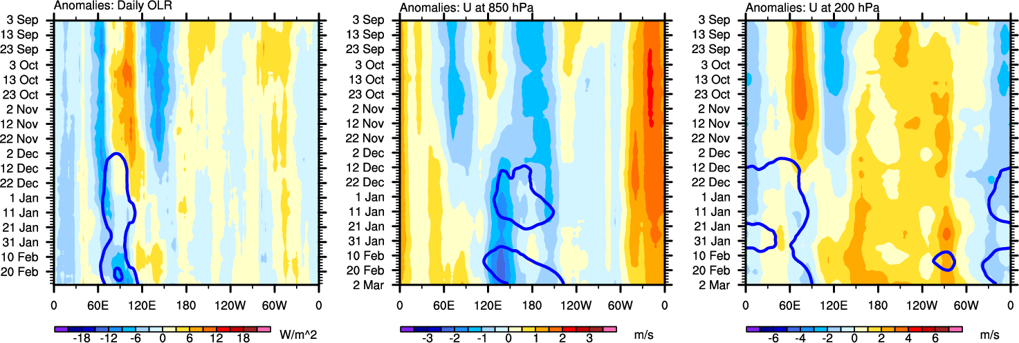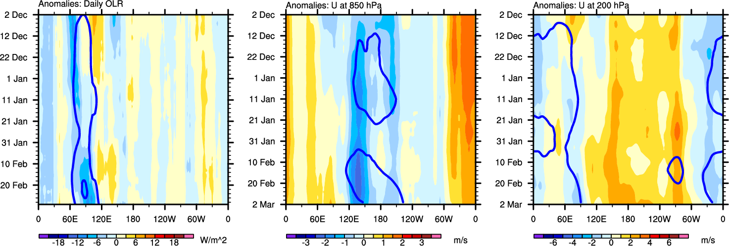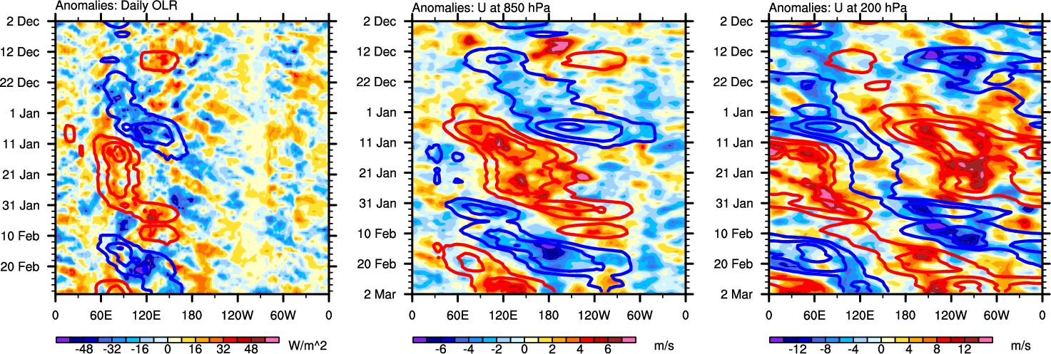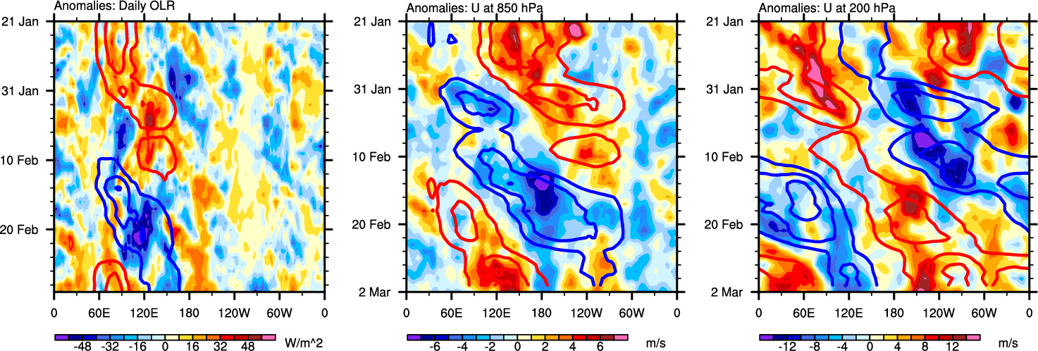 The Hovmollers show longitude-time plots for OLR, U-850, and U-200. The shading indicates the observed anomalies, while the contours are the projection of those anomalies onto the RMM EOFs.