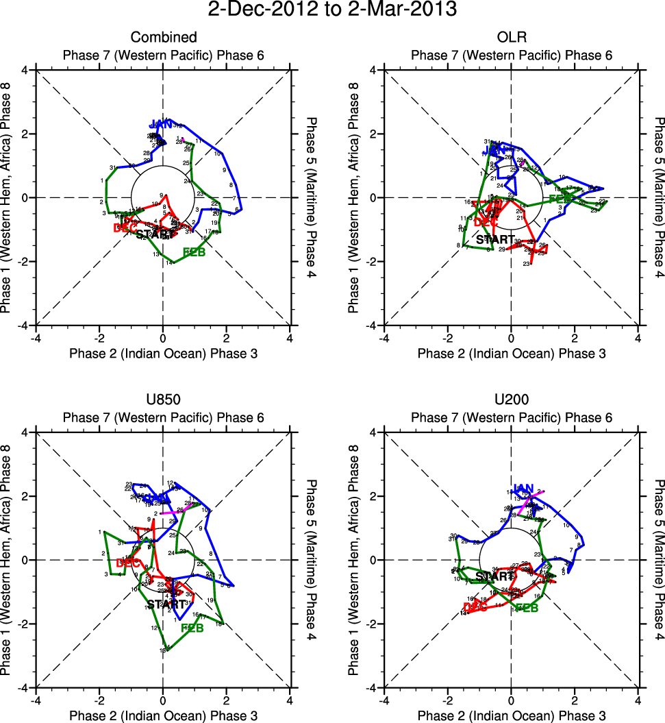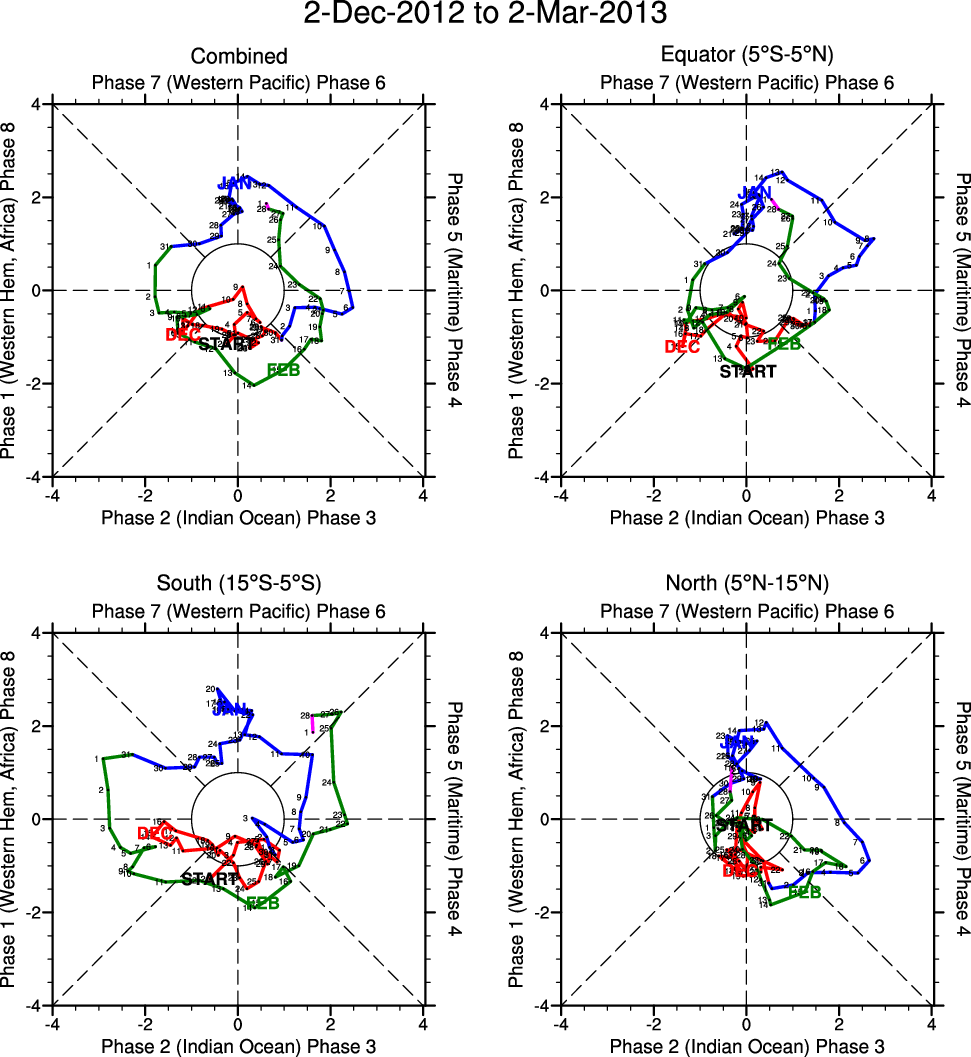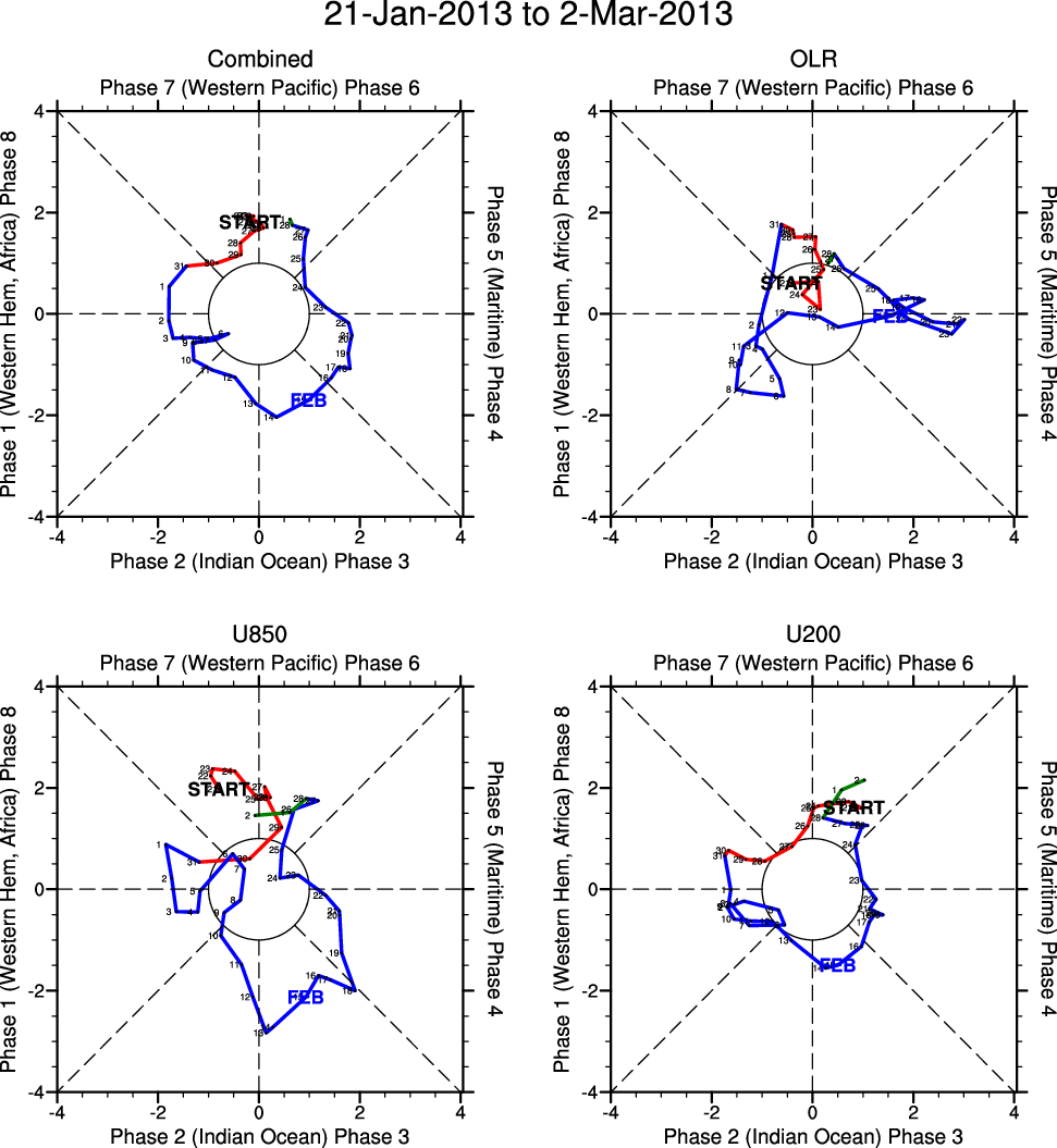 Wheeler and Hendon (2004) constructed the RMM index for monitoring the MJO. This index consists of the first two principal components (PCs) of OLR, 850-hPa zonal wind, and 200-hPa zonal wind averaged 15S-15N.