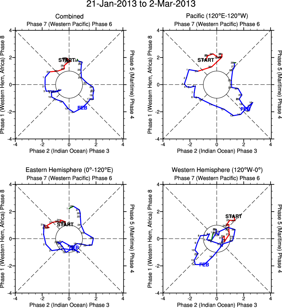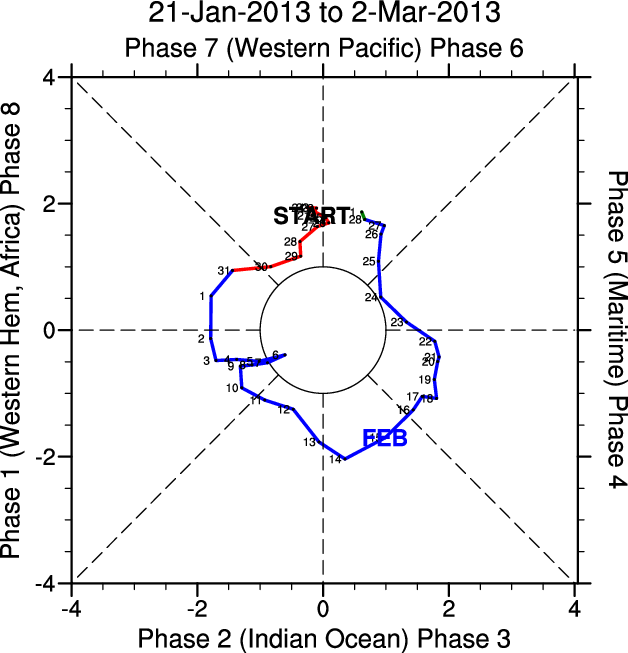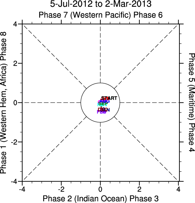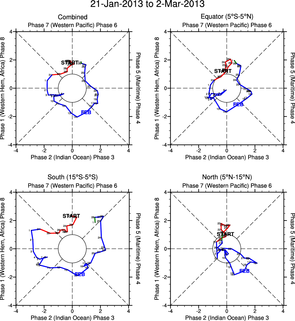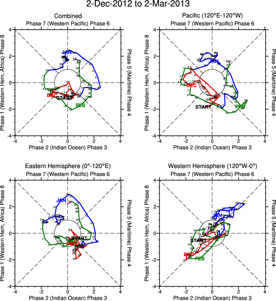 Wheeler and Hendon (2004) constructed the RMM index for monitoring the MJO. This index consists of the first two principal components (PCs) of OLR, 850-hPa zonal wind, and 200-hPa zonal wind averaged 15S-15N.