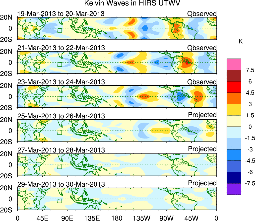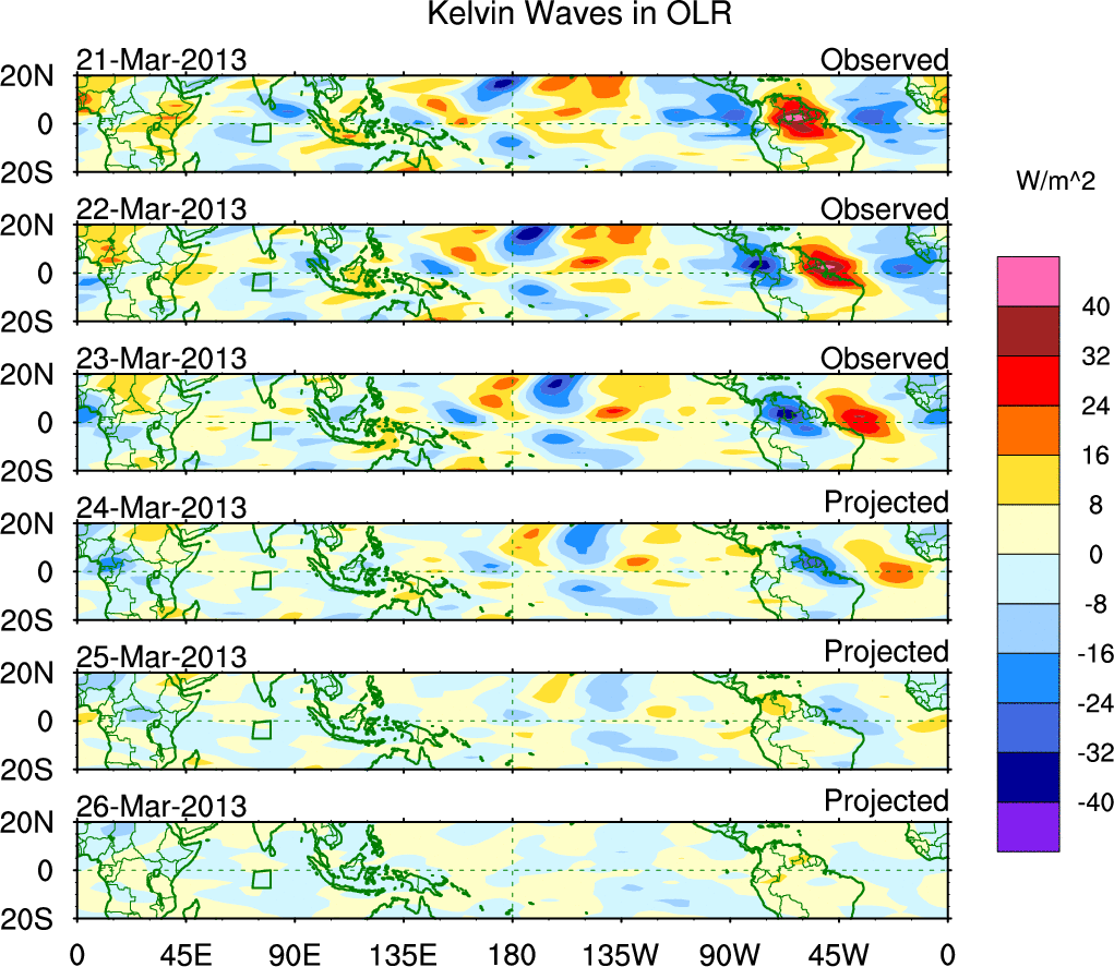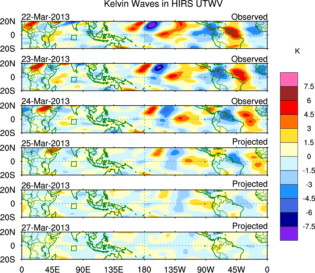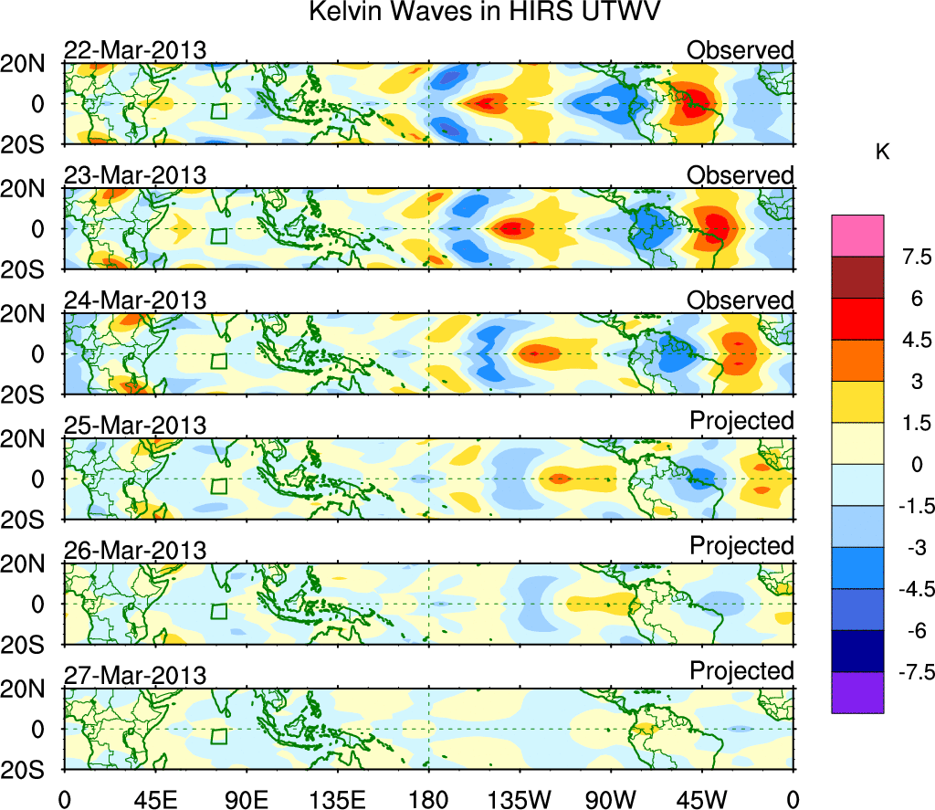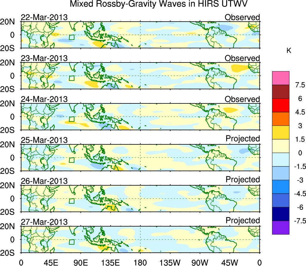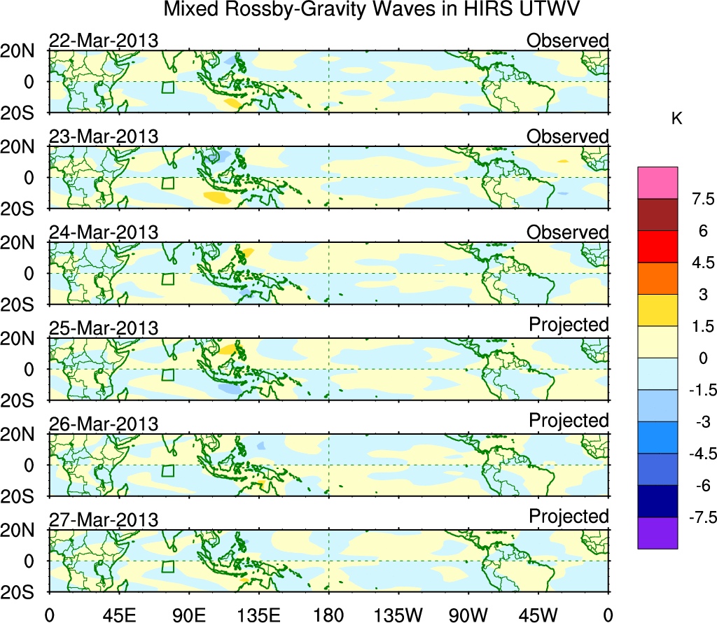 To identify tropical waves in near real-time, the OLR and UTWV data are filtered following Wheeler & Weickmann (2001 MWR). The daily anomalies are calculated using the first 3 harmonics of the seasonal cycle for 1979–2009. Missing values are then filled using linear interpolation in space and time. The most recent 365 days of anomalies are padded with 659 days of zeroes, and the result is filtered for each wave type.