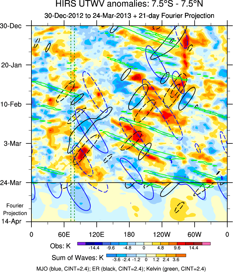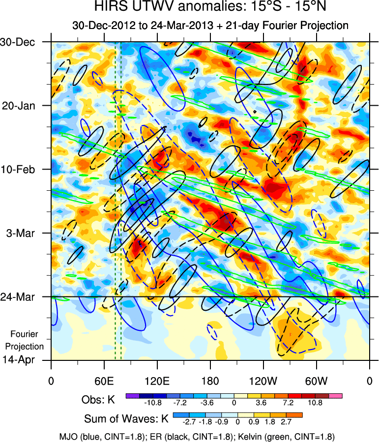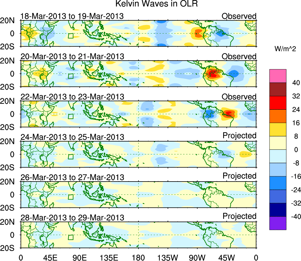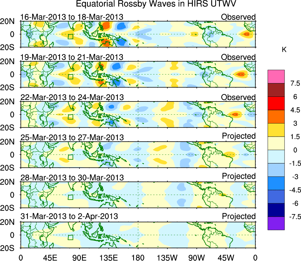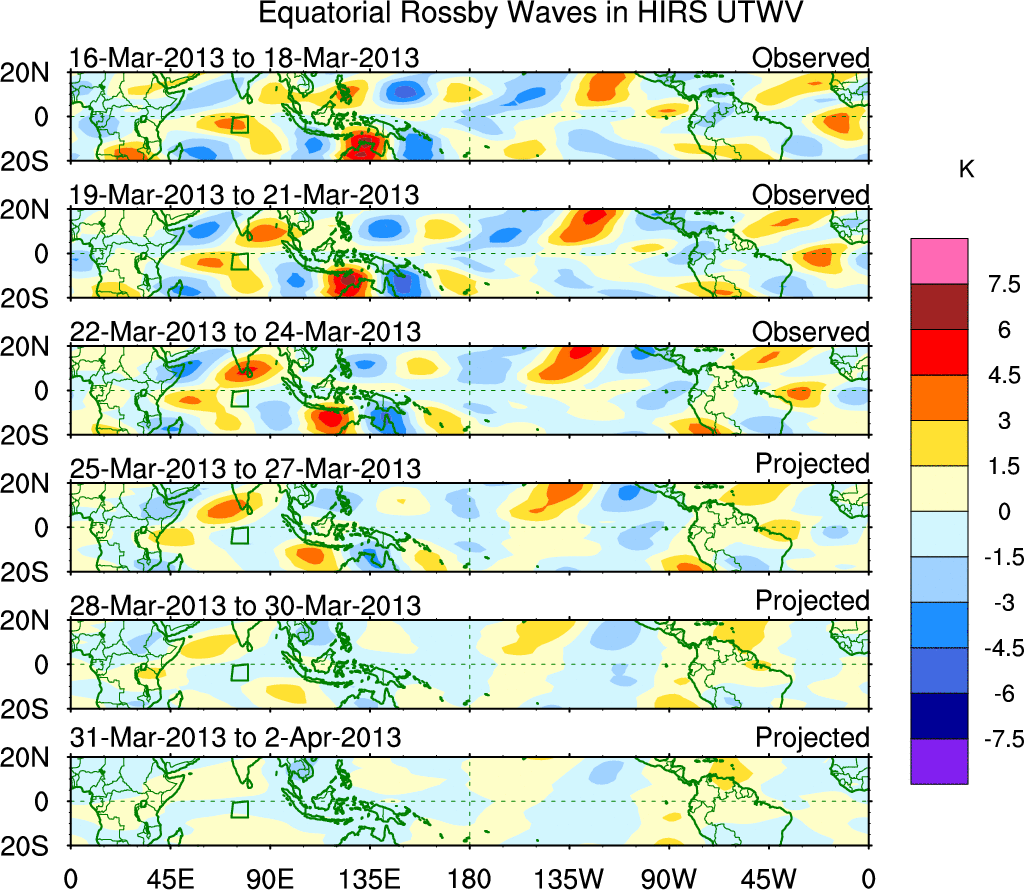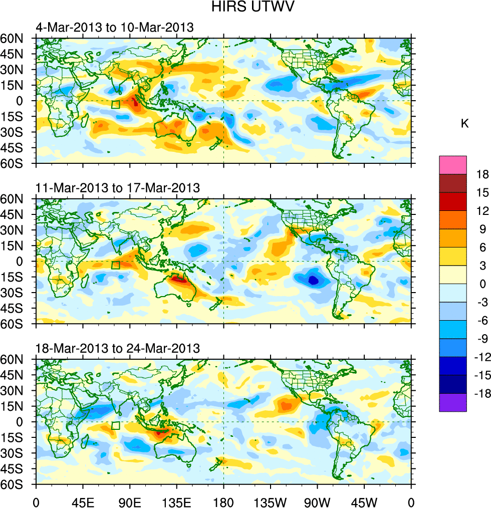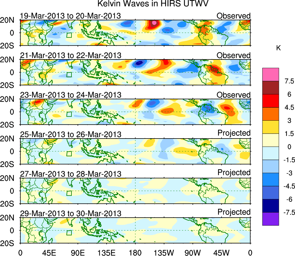 To identify tropical waves in near real-time, the OLR and UTWV data are filtered following Wheeler & Weickmann (2001 MWR). The daily anomalies are calculated using the first 3 harmonics of the seasonal cycle for 1979–2009. Missing values are then filled using linear interpolation in space and time. The most recent 365 days of anomalies are padded with 659 days of zeroes, and the result is filtered for each wave type.