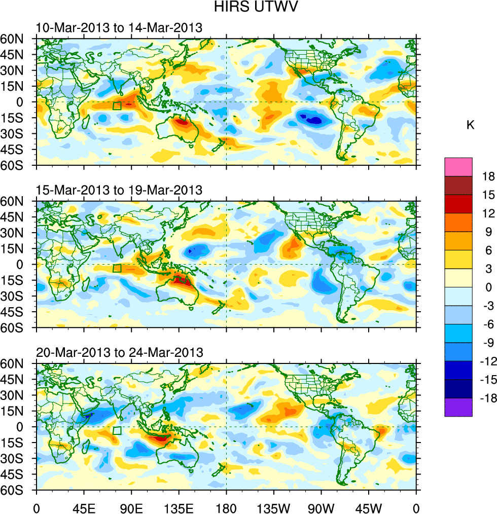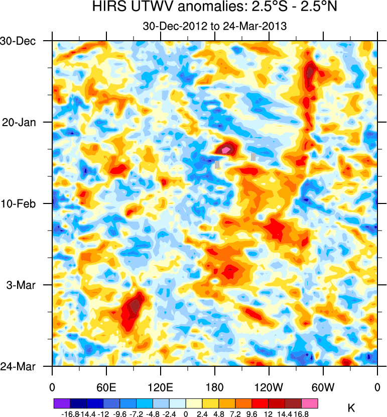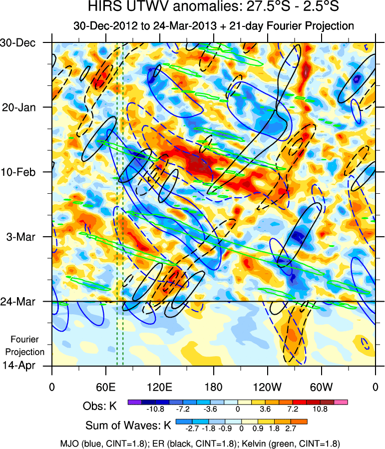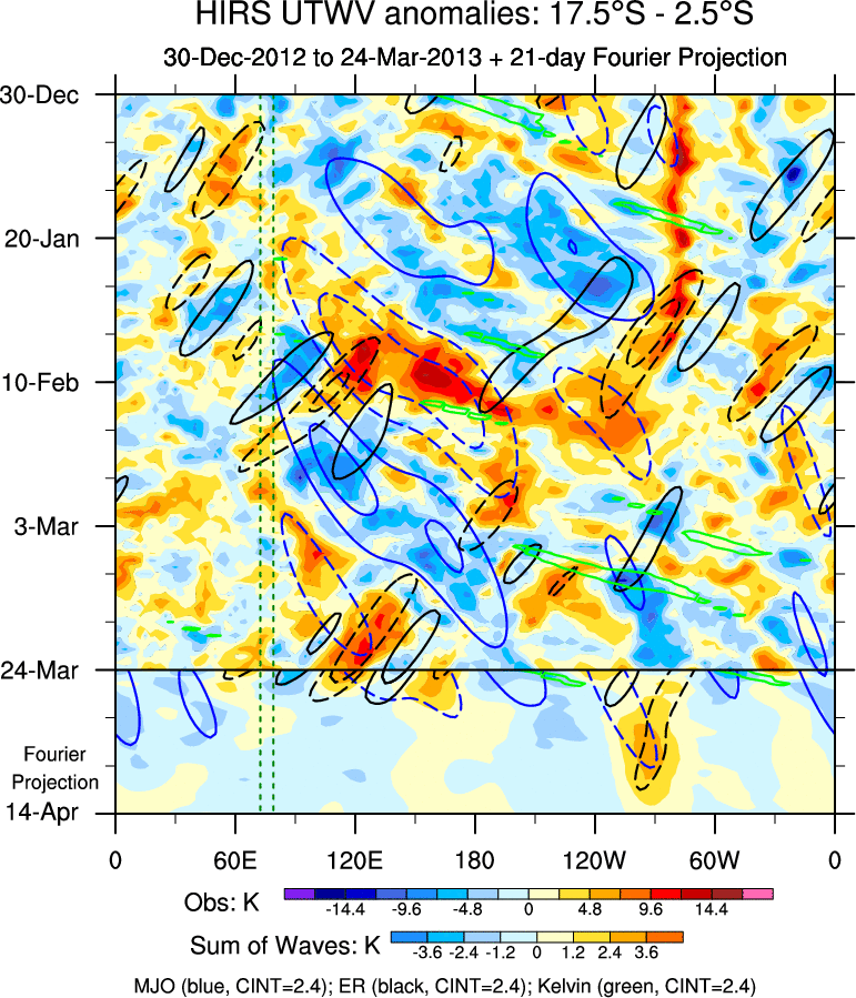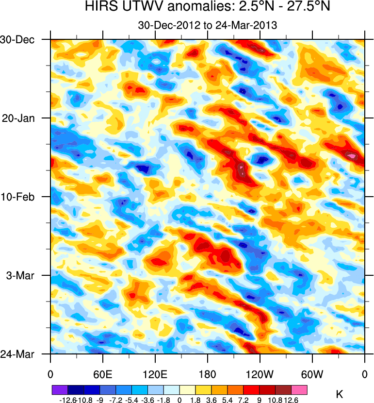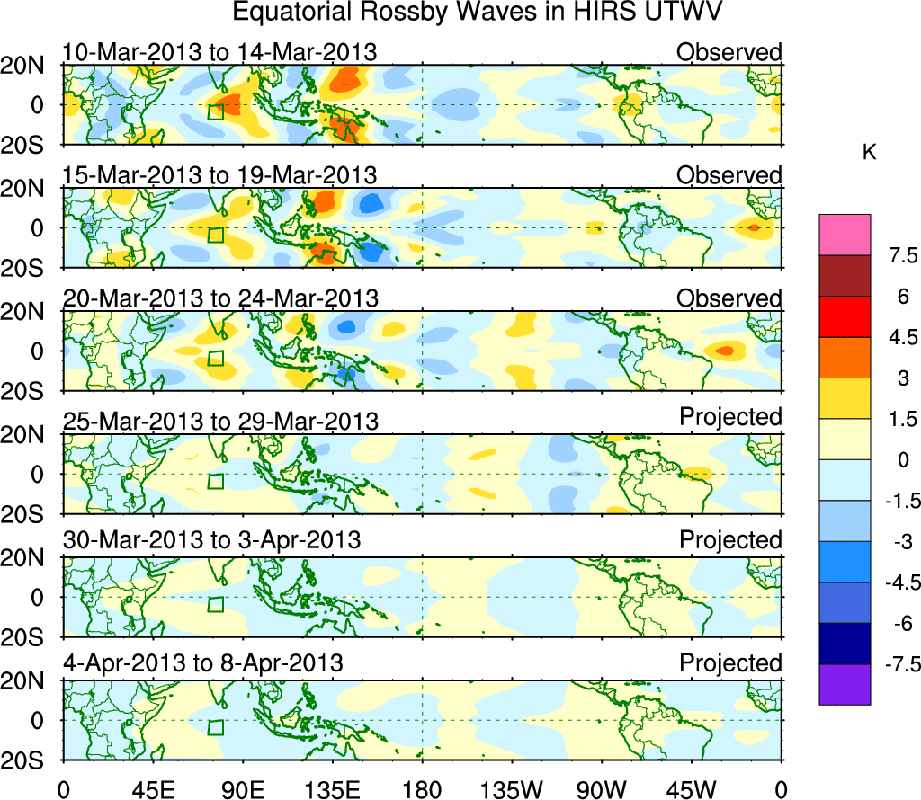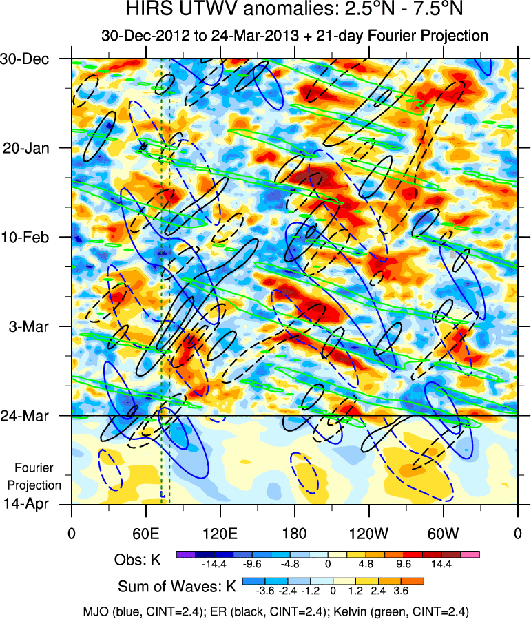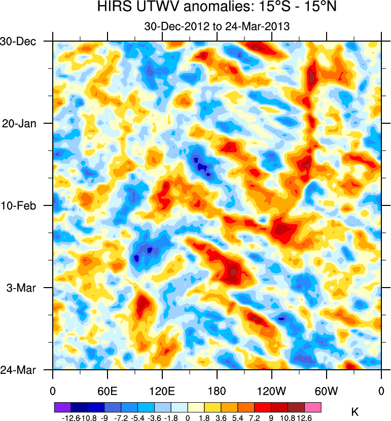 To identify tropical waves in near real-time, the OLR and UTWV data are filtered following Wheeler & Weickmann (2001 MWR). The daily anomalies are calculated using the first 3 harmonics of the seasonal cycle for 1979–2009. Missing values are then filled using linear interpolation in space and time. The most recent 365 days of anomalies are padded with 659 days of zeroes, and the result is filtered for each wave type.