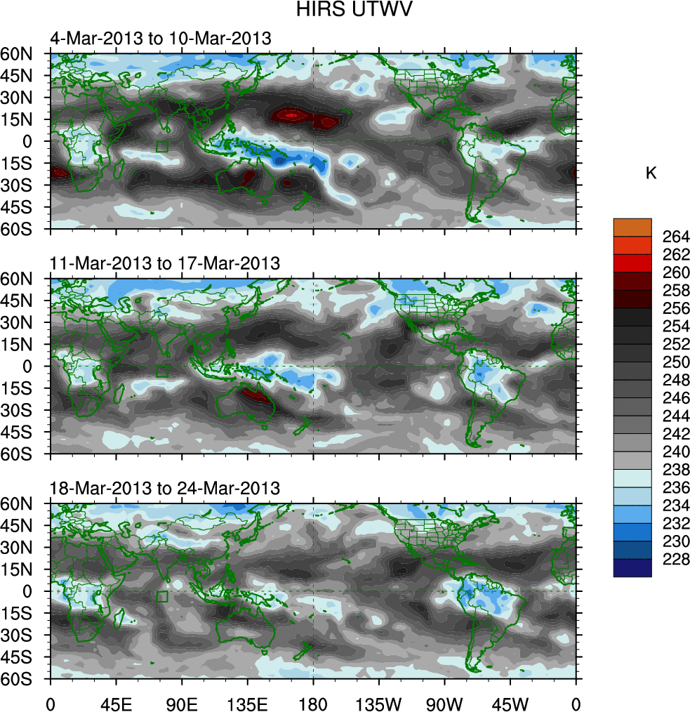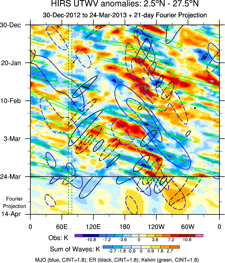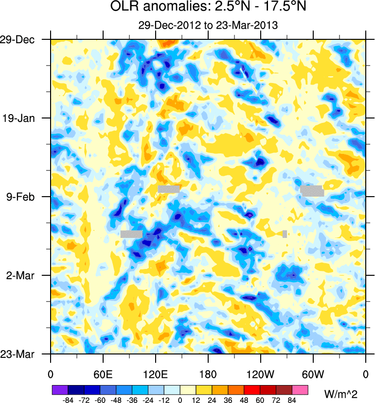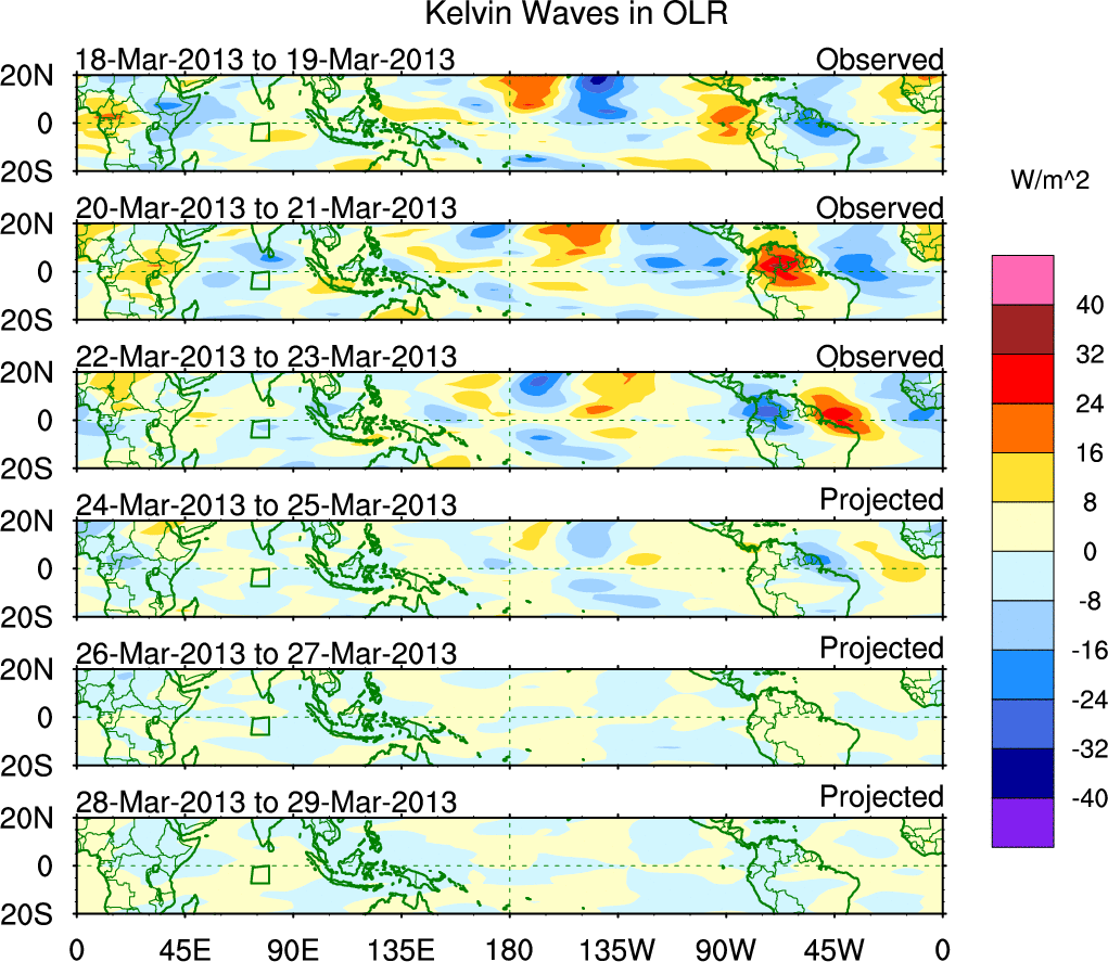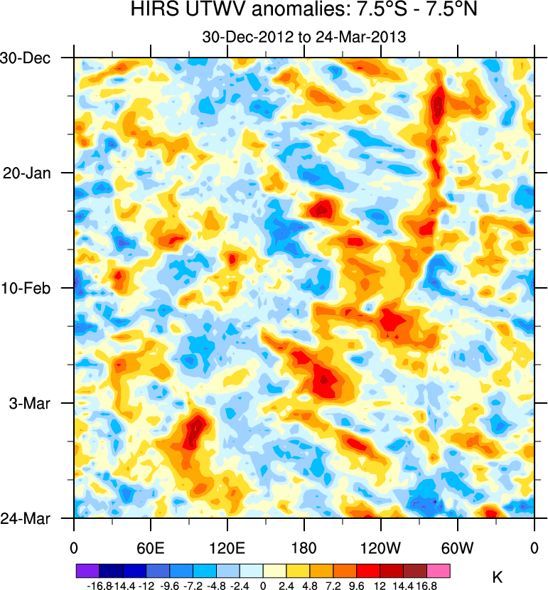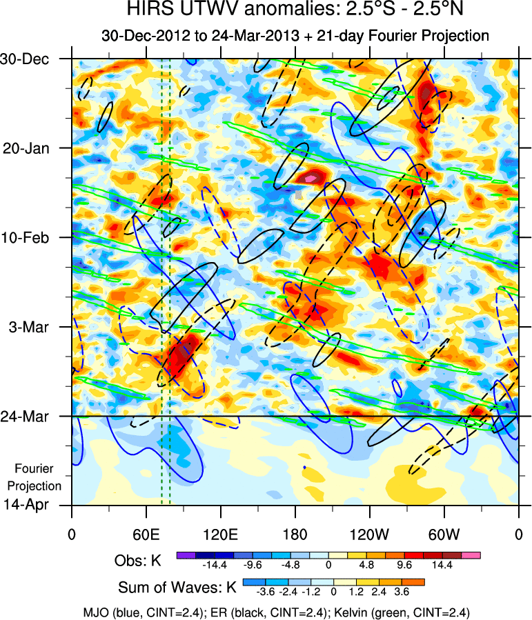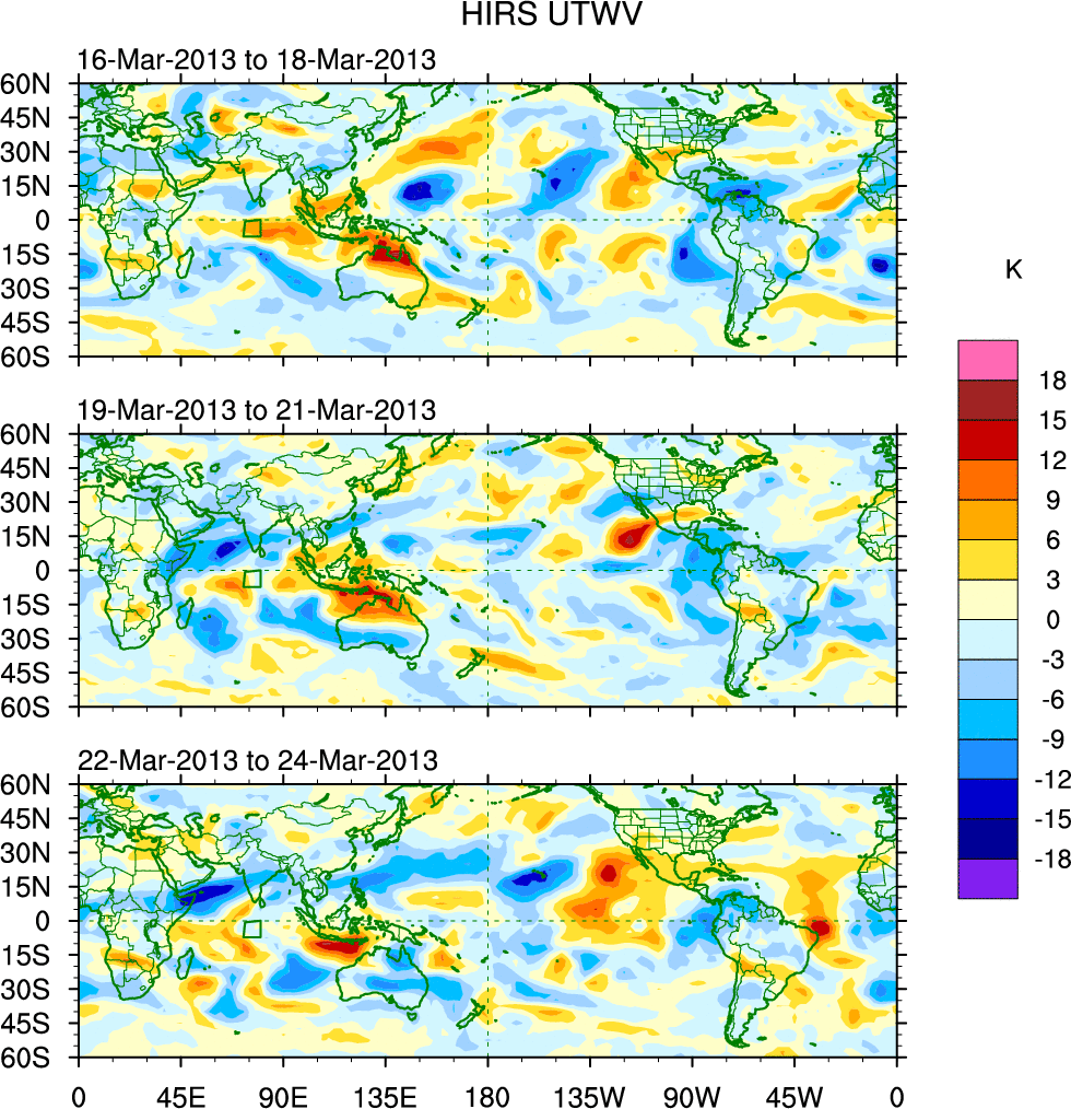 To identify tropical waves in near real-time, the OLR and UTWV data are filtered following Wheeler & Weickmann (2001 MWR). The daily anomalies are calculated using the first 3 harmonics of the seasonal cycle for 1979–2009. Missing values are then filled using linear interpolation in space and time. The most recent 365 days of anomalies are padded with 659 days of zeroes, and the result is filtered for each wave type.
