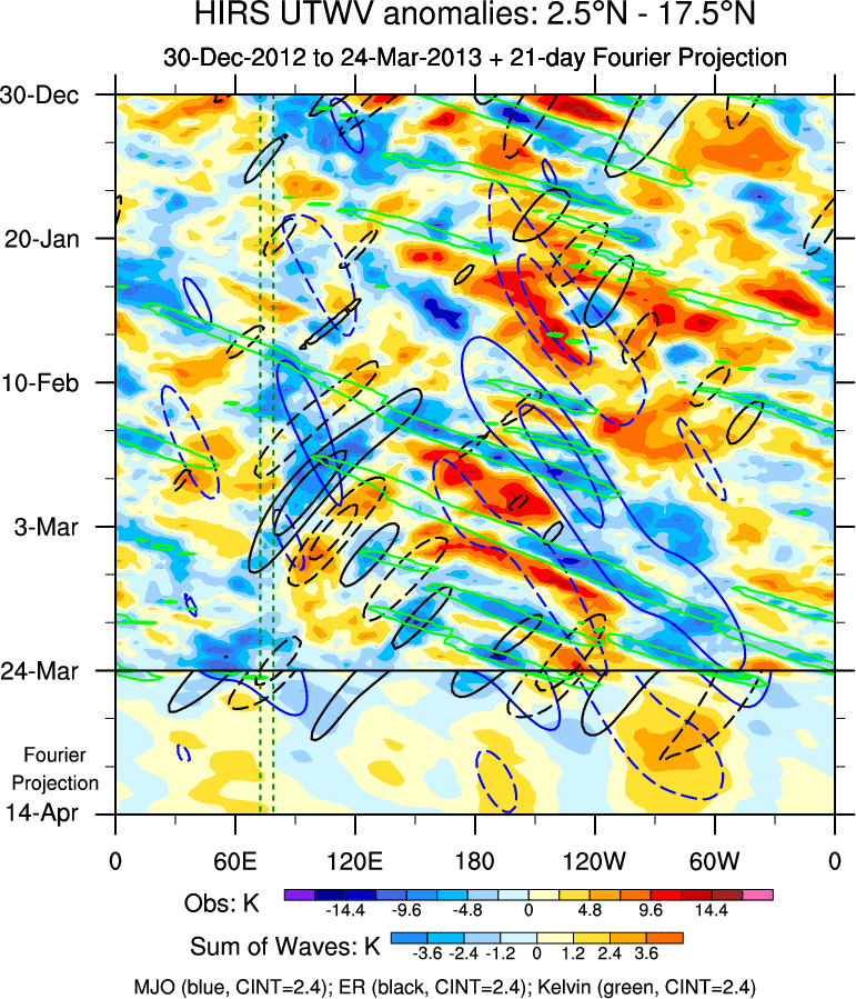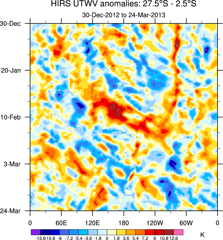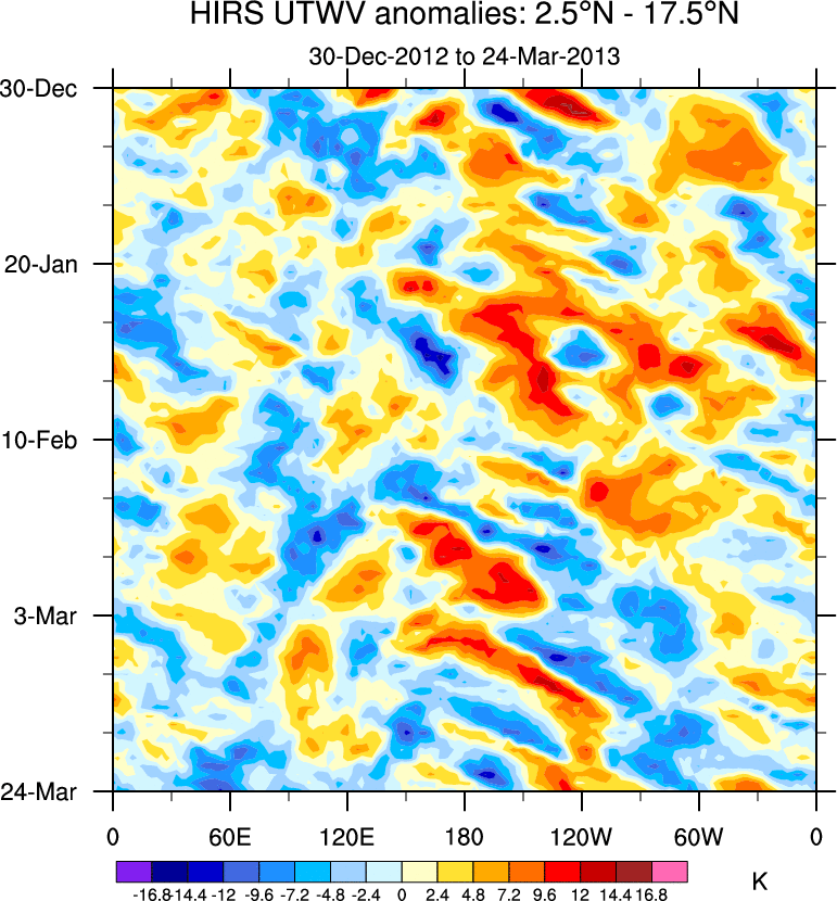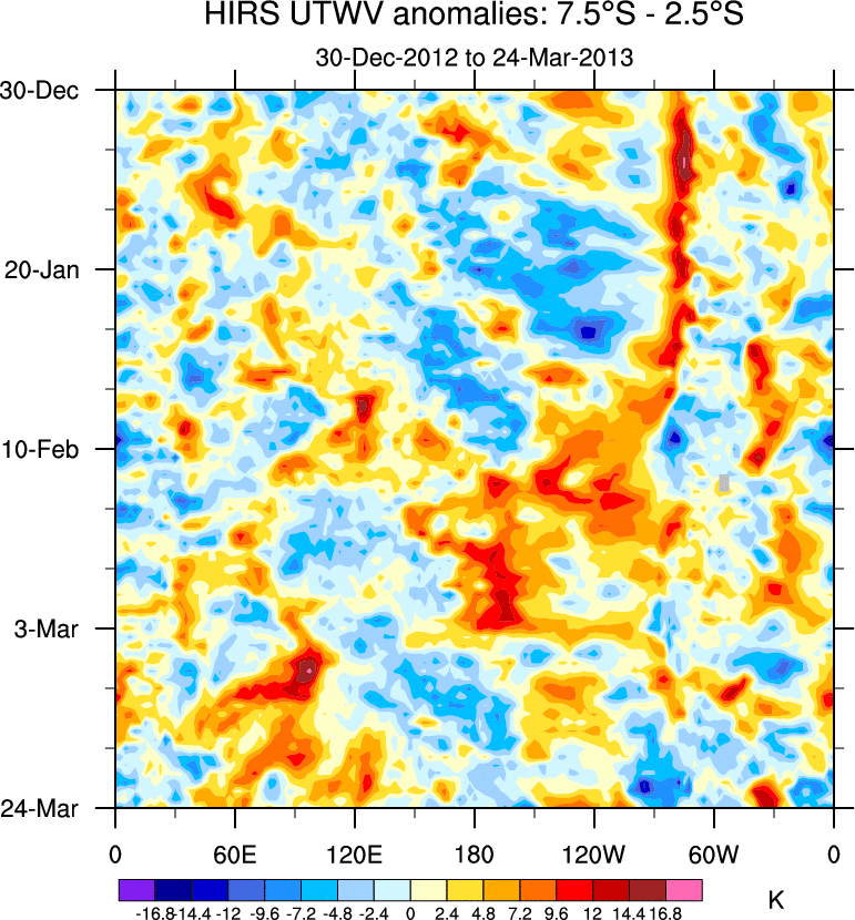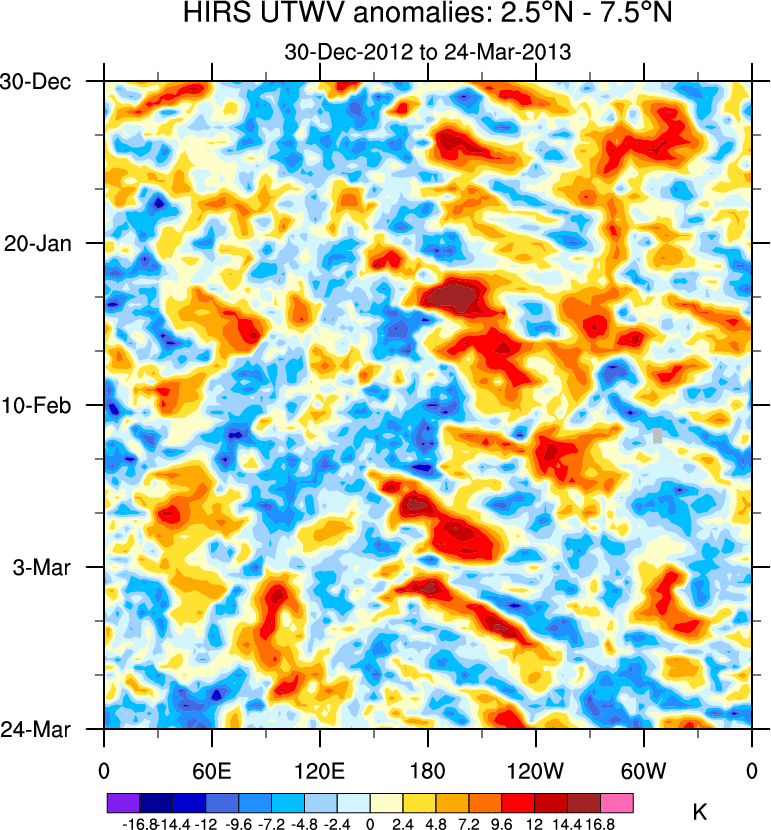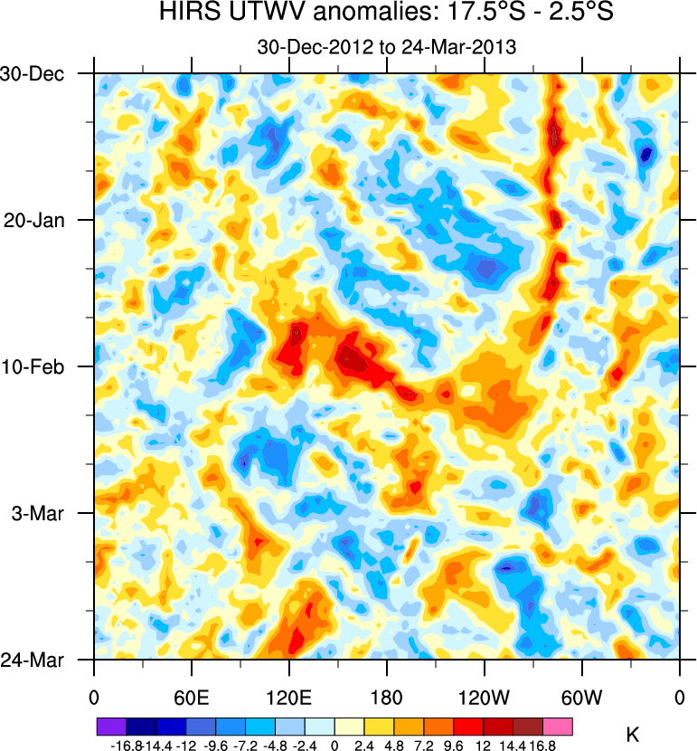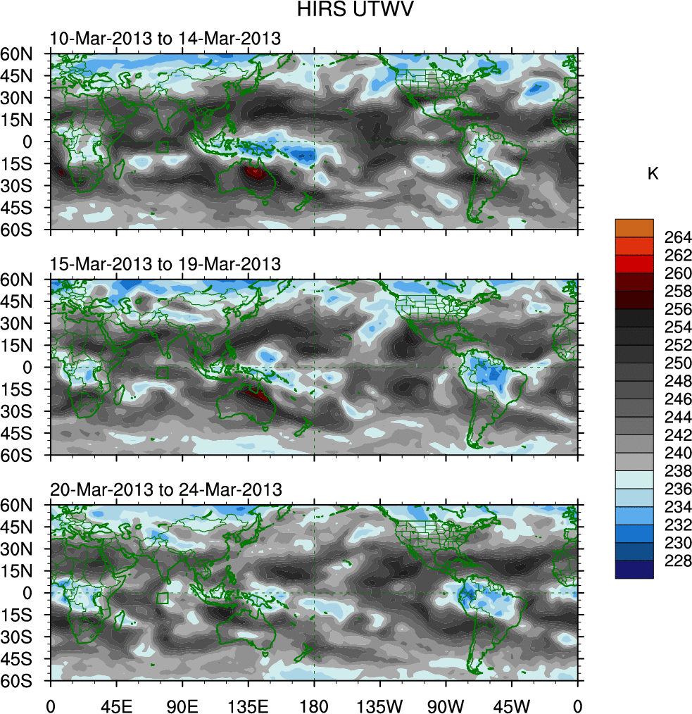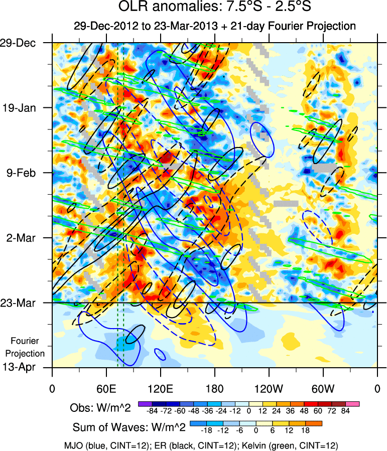 To identify tropical waves in near real-time, the OLR and UTWV data are filtered following Wheeler & Weickmann (2001 MWR). The daily anomalies are calculated using the first 3 harmonics of the seasonal cycle for 1979–2009. Missing values are then filled using linear interpolation in space and time. The most recent 365 days of anomalies are padded with 659 days of zeroes, and the result is filtered for each wave type.