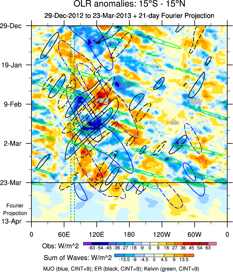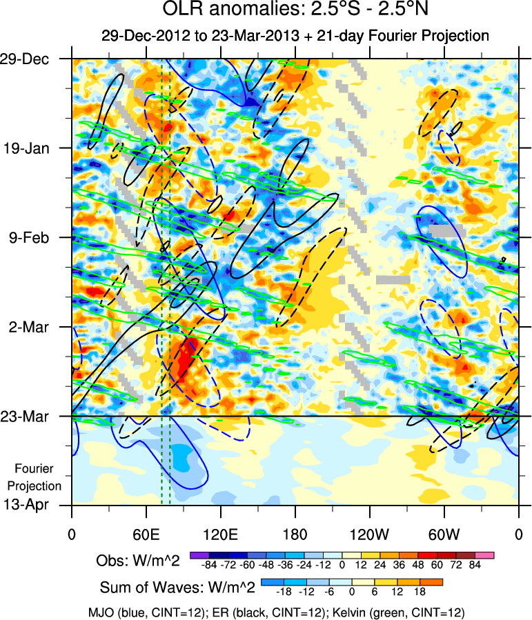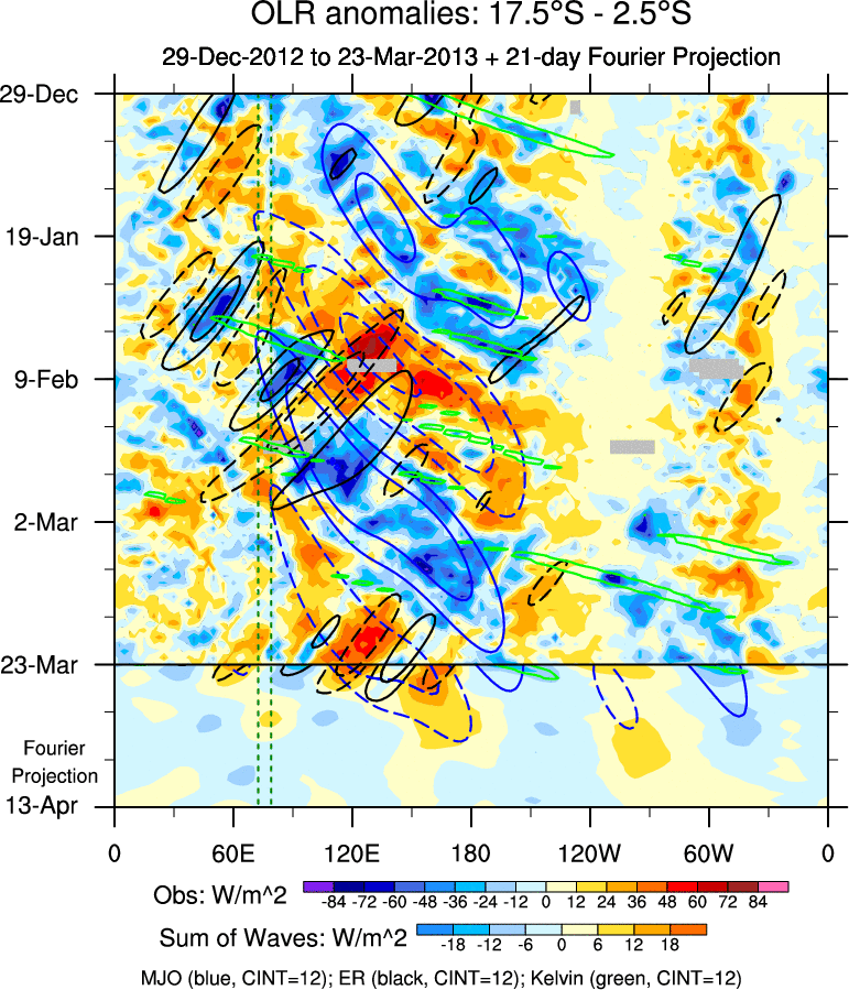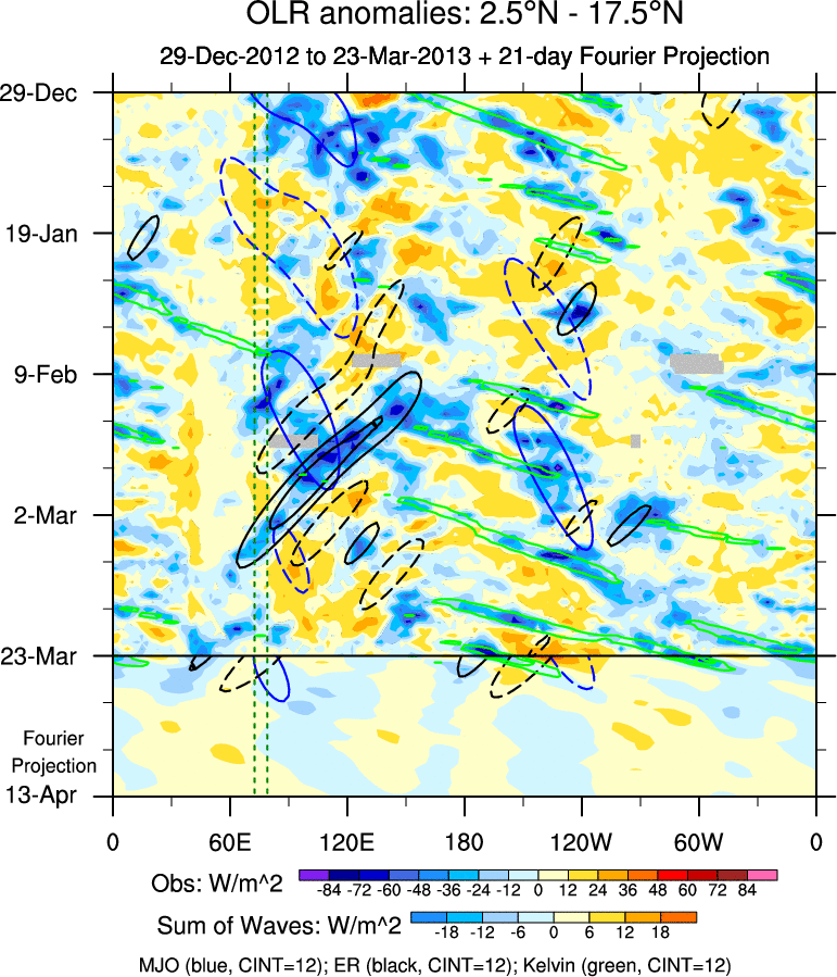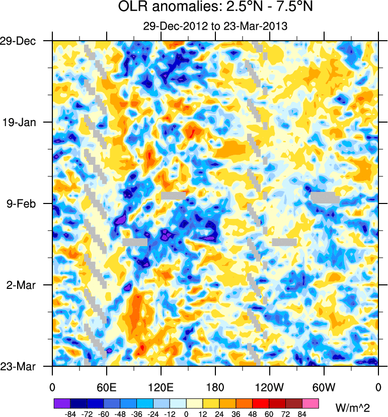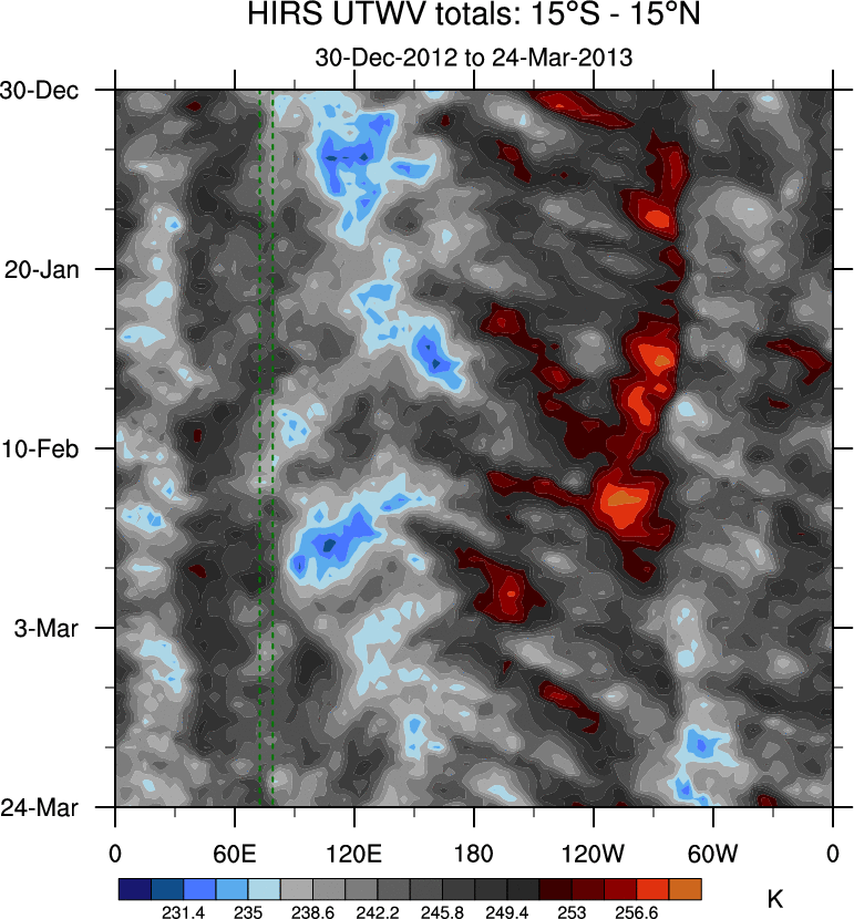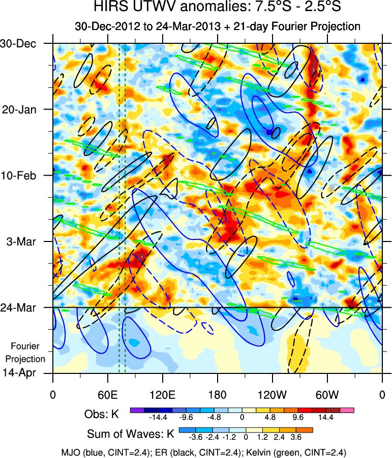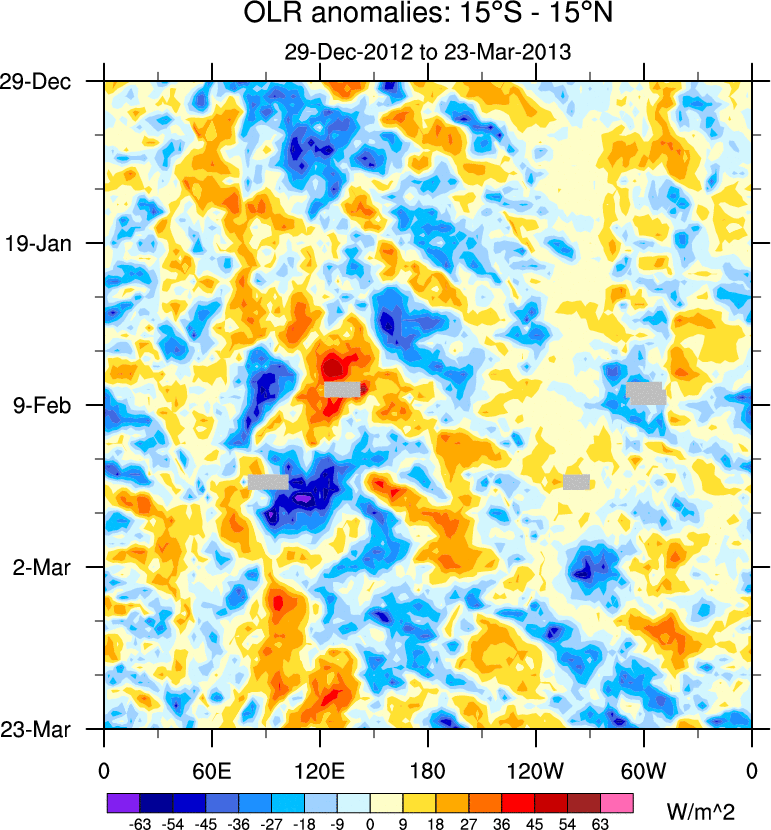 To identify tropical waves in near real-time, the OLR and UTWV data are filtered following Wheeler & Weickmann (2001 MWR). The daily anomalies are calculated using the first 3 harmonics of the seasonal cycle for 1979–2009. Missing values are then filled using linear interpolation in space and time. The most recent 365 days of anomalies are padded with 659 days of zeroes, and the result is filtered for each wave type.