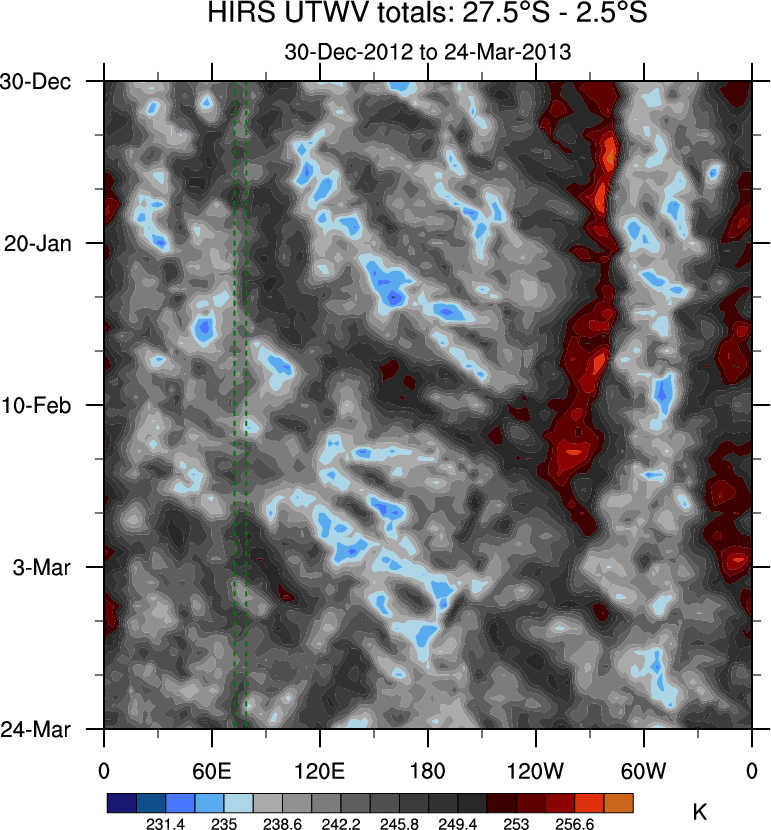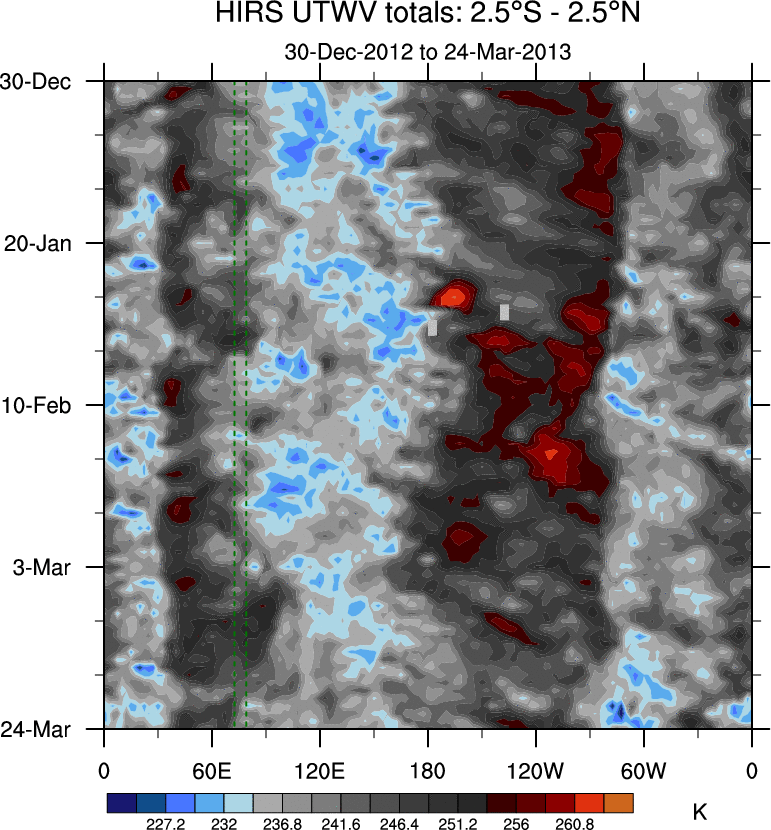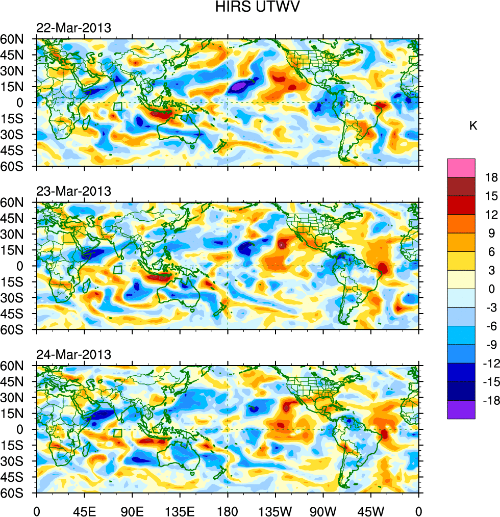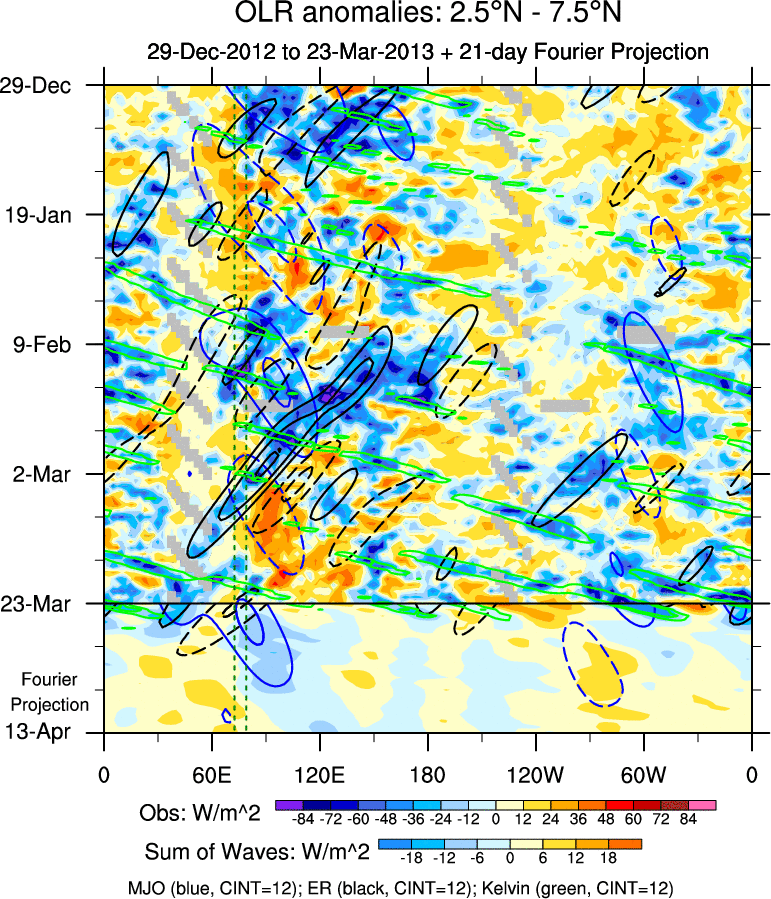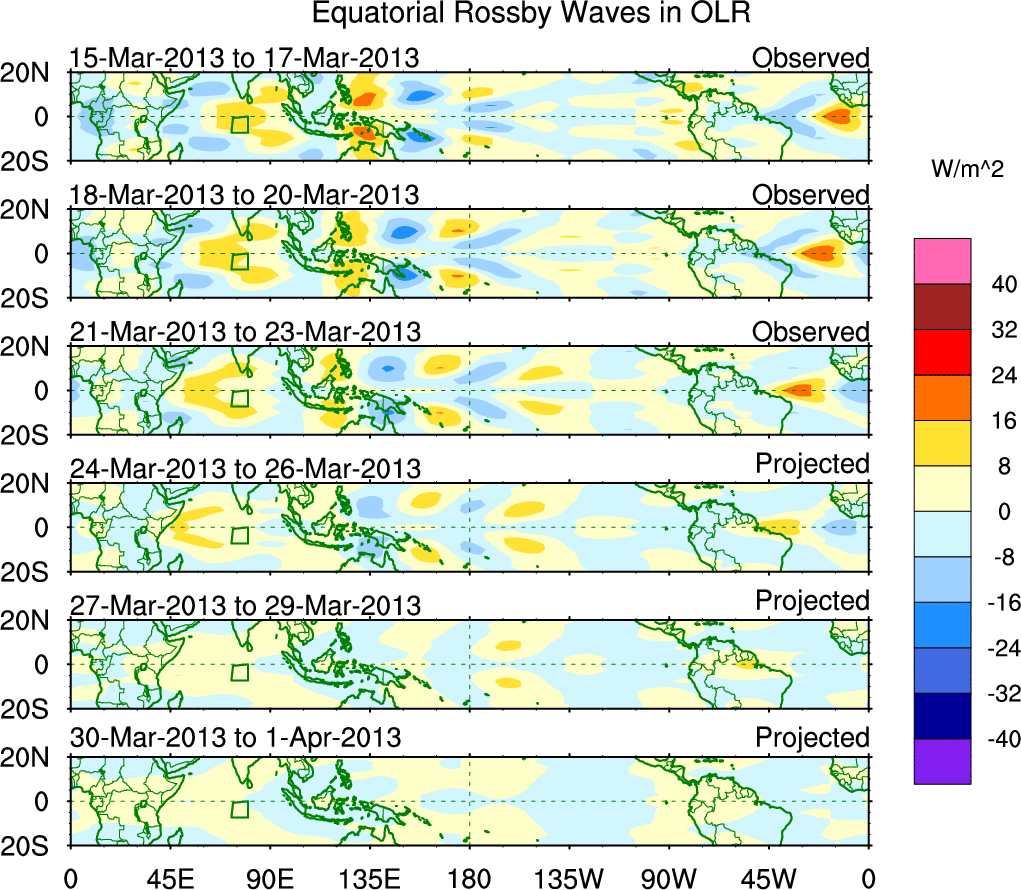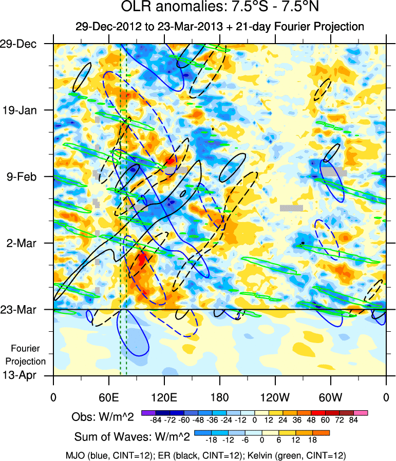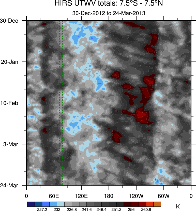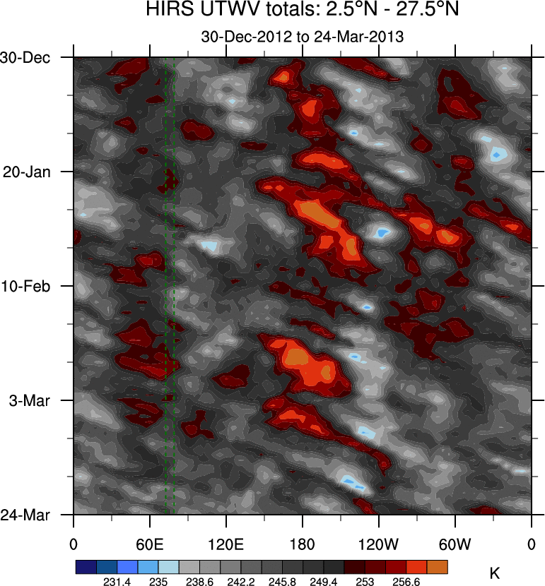 To identify tropical waves in near real-time, the OLR and UTWV data are filtered following Wheeler & Weickmann (2001 MWR). The daily anomalies are calculated using the first 3 harmonics of the seasonal cycle for 1979–2009. Missing values are then filled using linear interpolation in space and time. The most recent 365 days of anomalies are padded with 659 days of zeroes, and the result is filtered for each wave type.