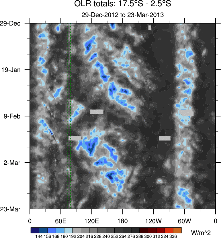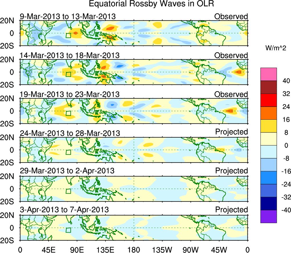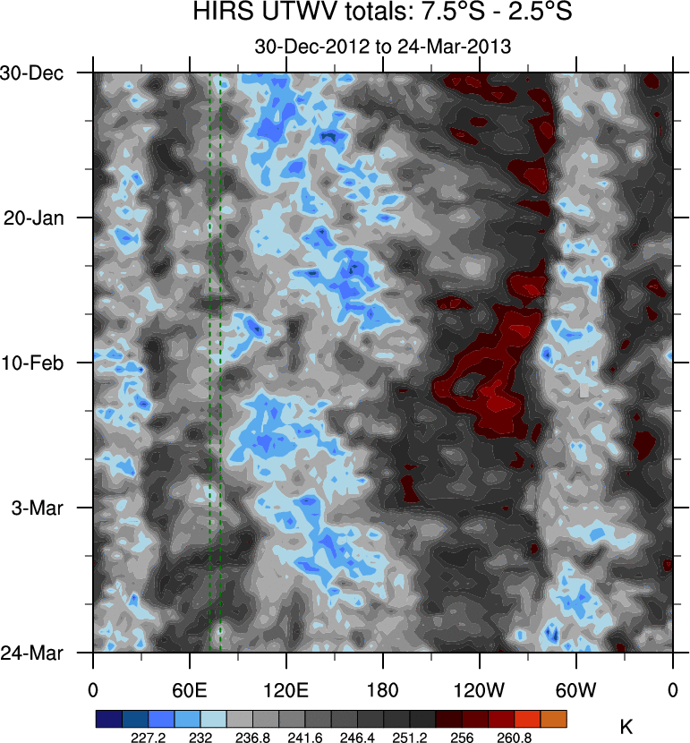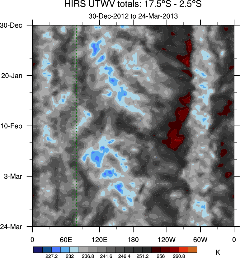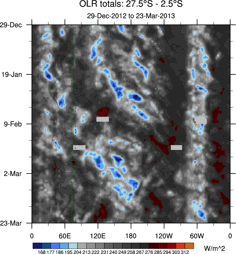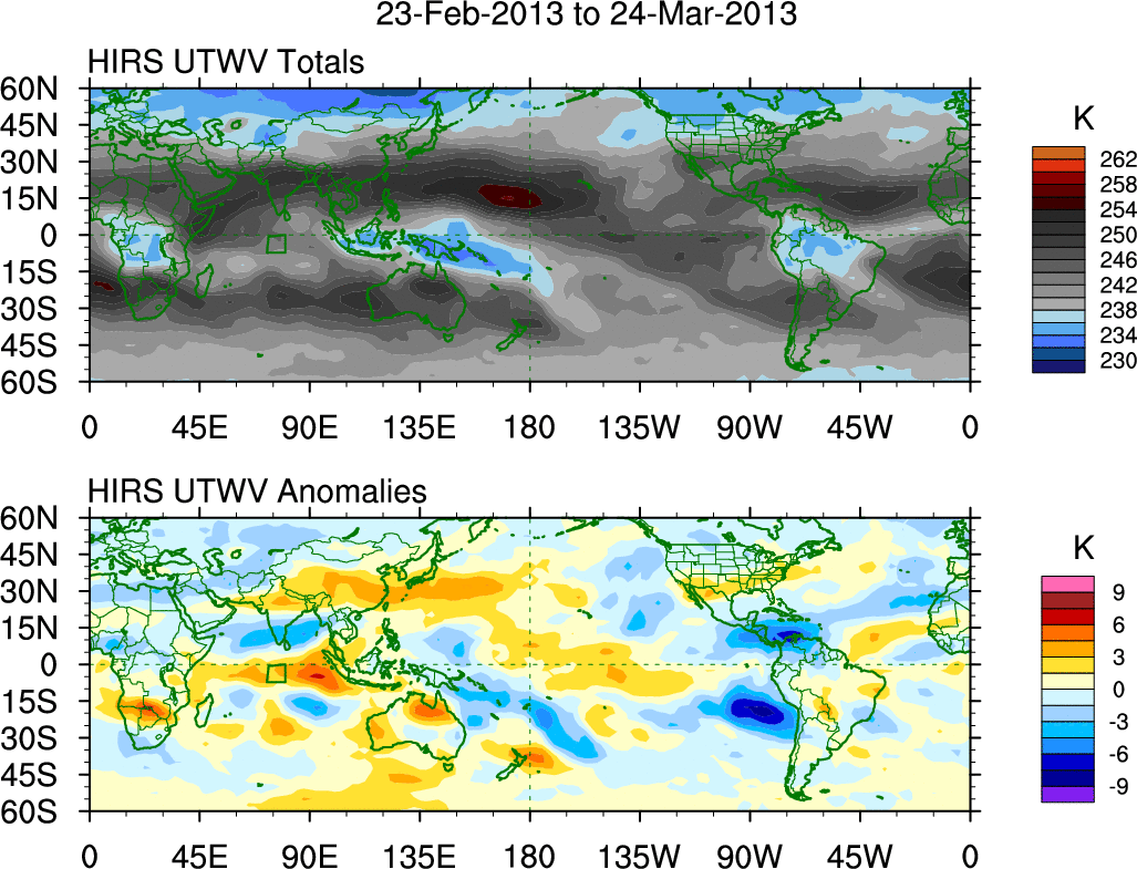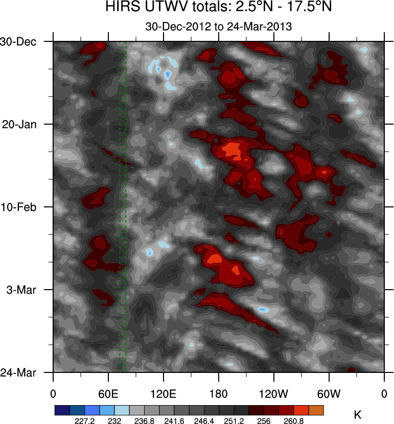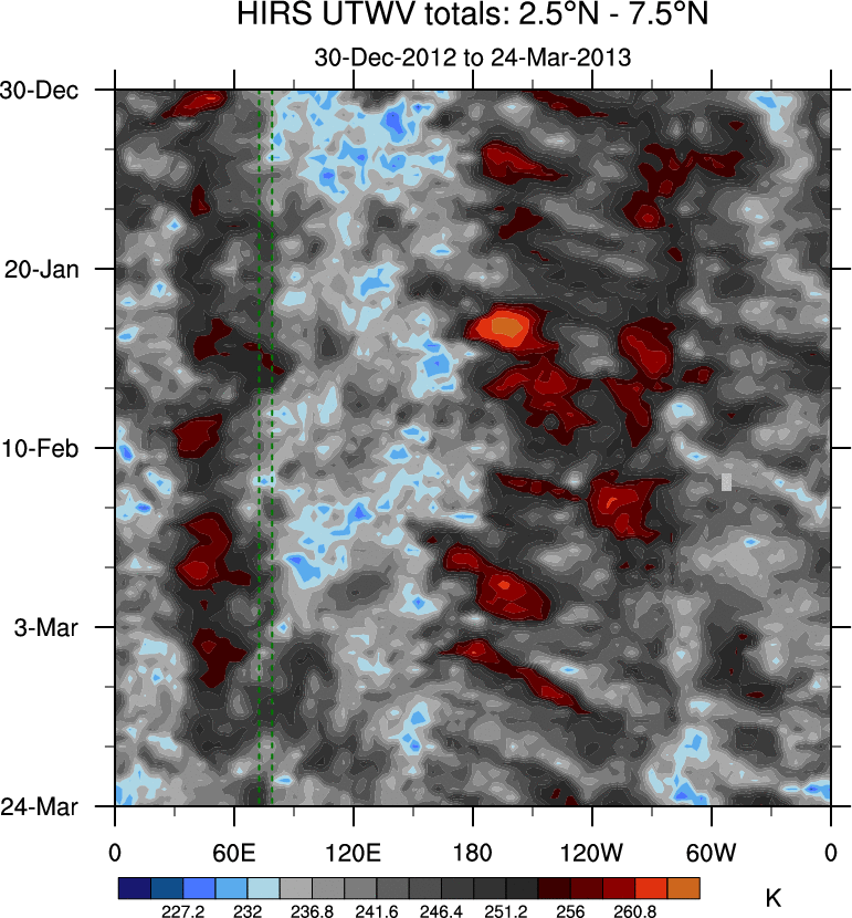 To identify tropical waves in near real-time, the OLR and UTWV data are filtered following Wheeler & Weickmann (2001 MWR). The daily anomalies are calculated using the first 3 harmonics of the seasonal cycle for 1979–2009. Missing values are then filled using linear interpolation in space and time. The most recent 365 days of anomalies are padded with 659 days of zeroes, and the result is filtered for each wave type.