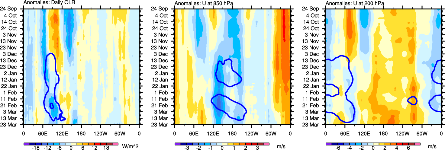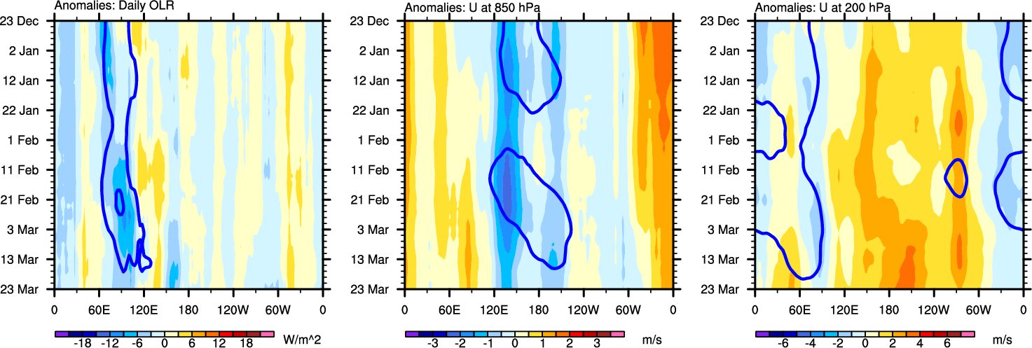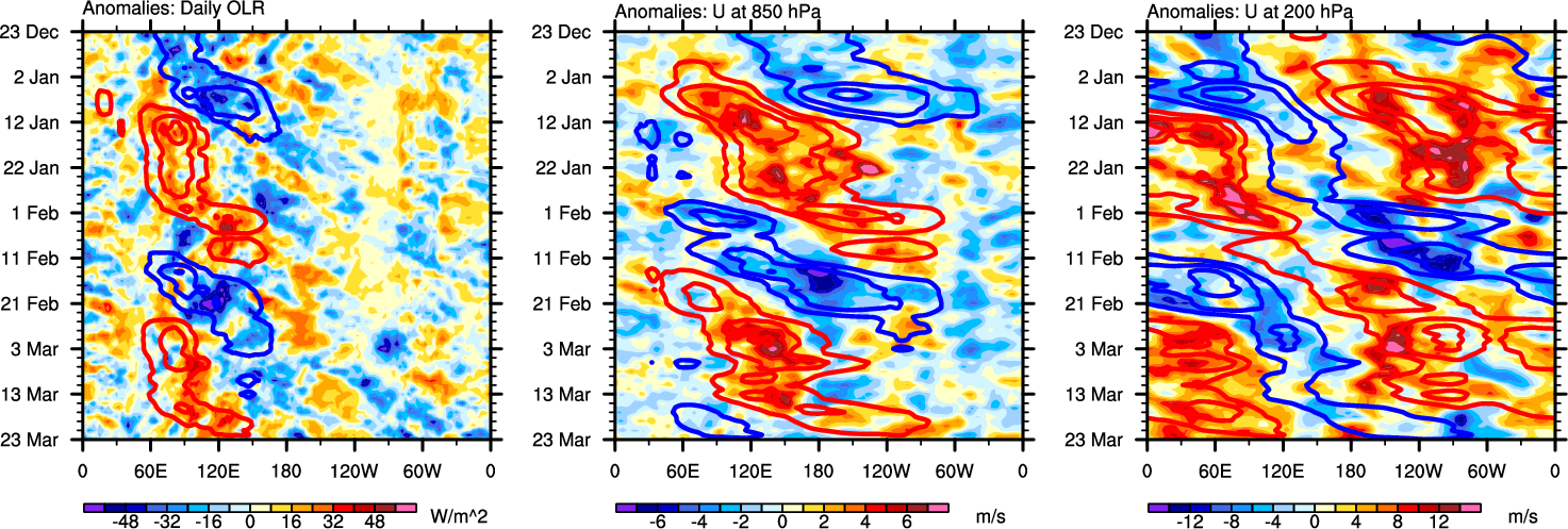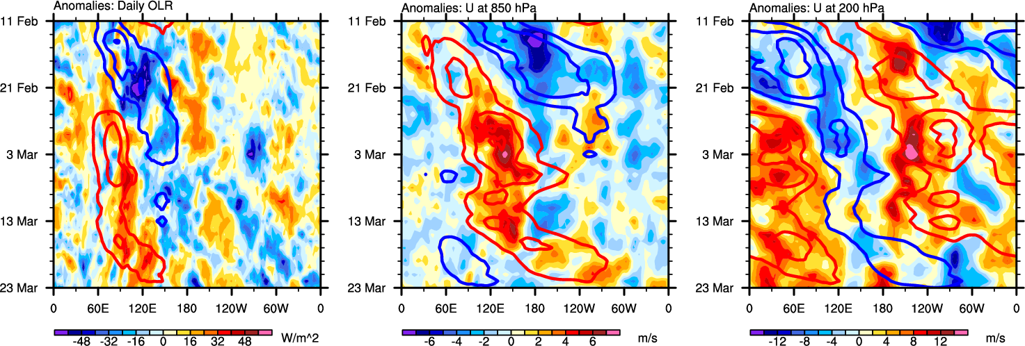 The Hovmollers show longitude-time plots for OLR, U-850, and U-200. The shading indicates the observed anomalies, while the contours are the projection of those anomalies onto the RMM EOFs.