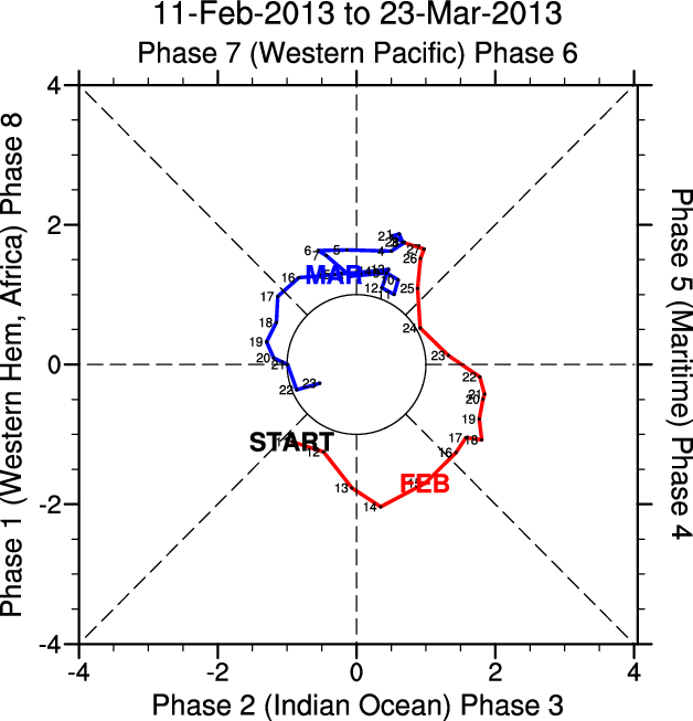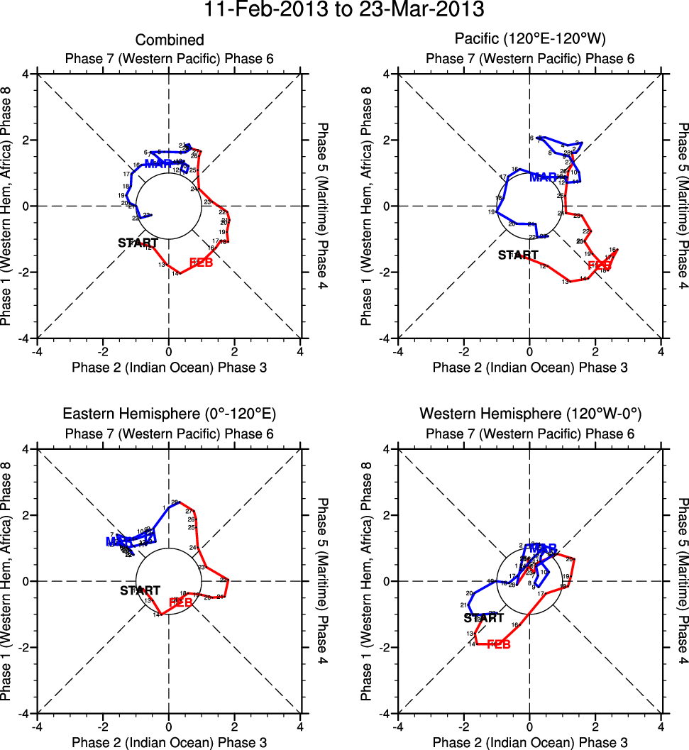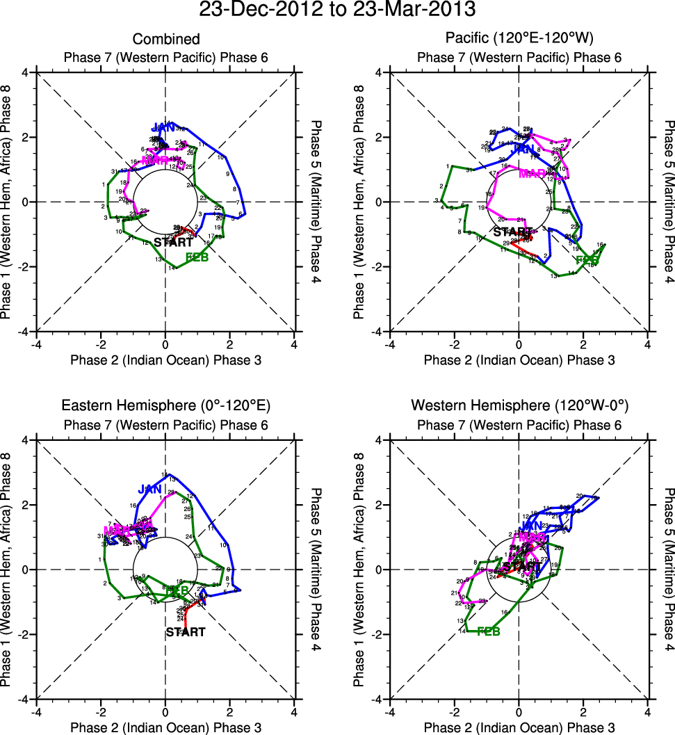 Wheeler and Hendon (2004) constructed the RMM index for monitoring the MJO. This index consists of the first two principal components (PCs) of OLR, 850-hPa zonal wind, and 200-hPa zonal wind averaged 15S-15N.