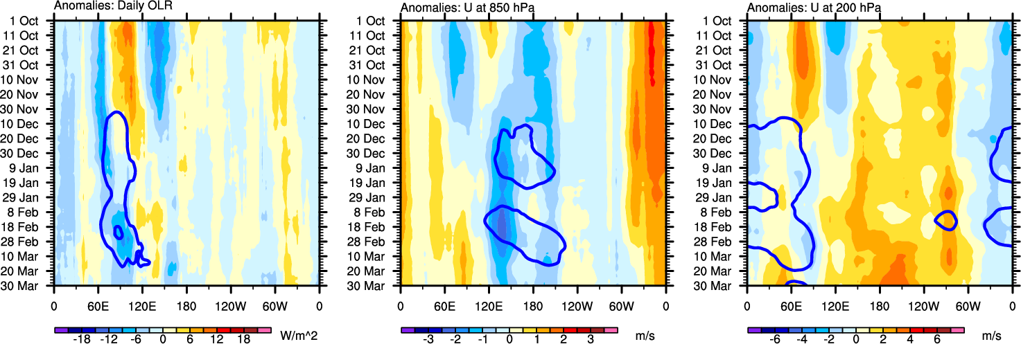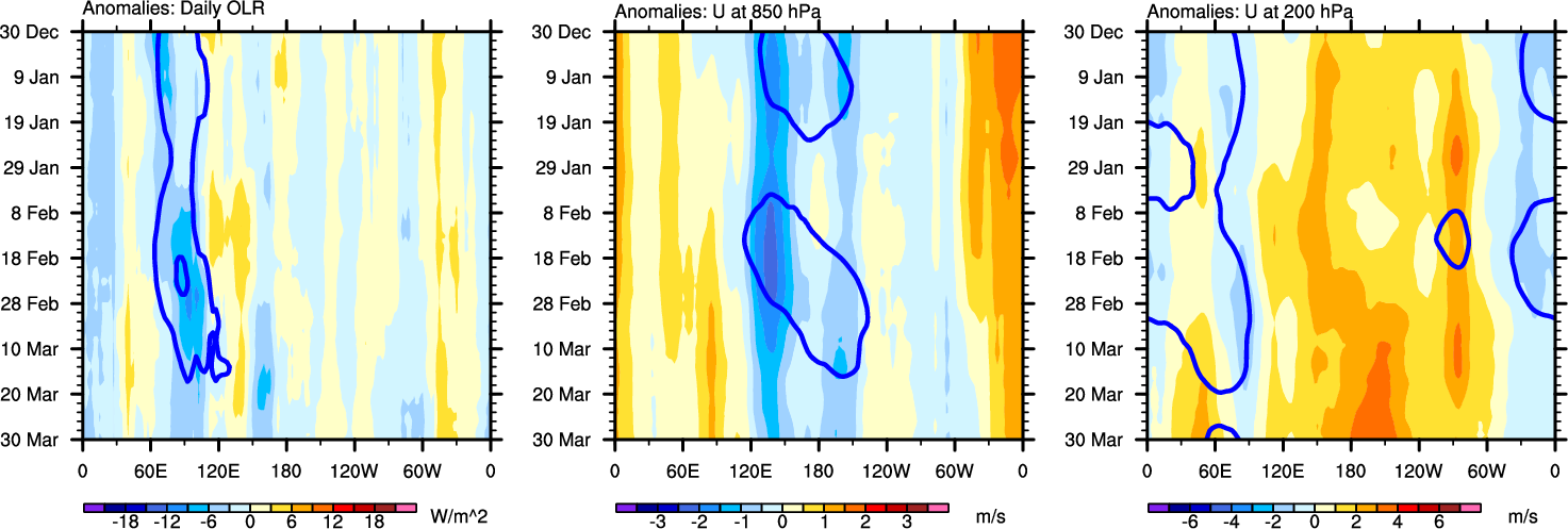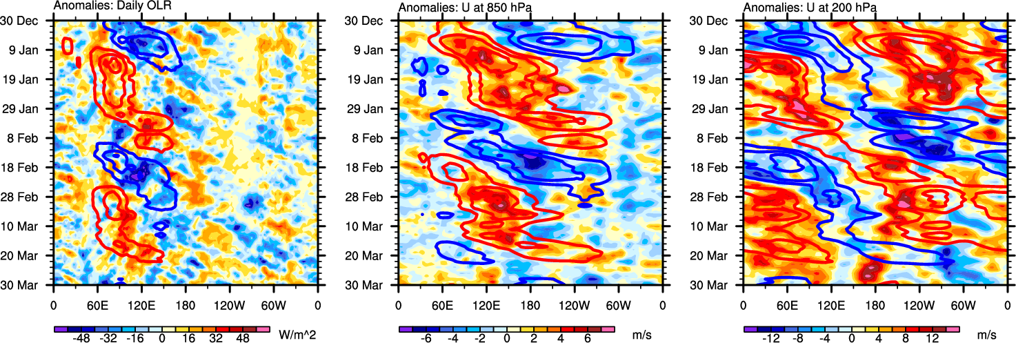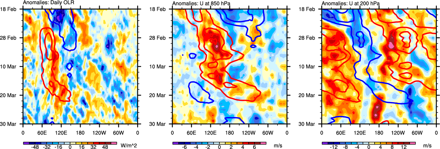 The Hovmollers show longitude-time plots for OLR, U-850, and U-200. The shading indicates the observed anomalies, while the contours are the projection of those anomalies onto the RMM EOFs.
