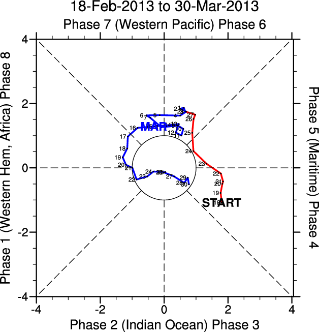 Wheeler and Hendon (2004) constructed the RMM index for monitoring the MJO. This index consists of the first two principal components (PCs) of OLR, 850-hPa zonal wind, and 200-hPa zonal wind averaged 15S-15N.