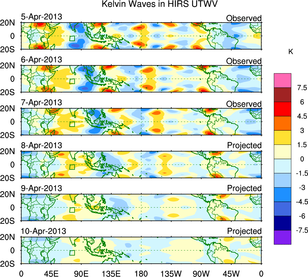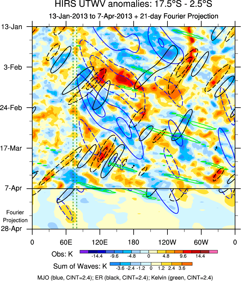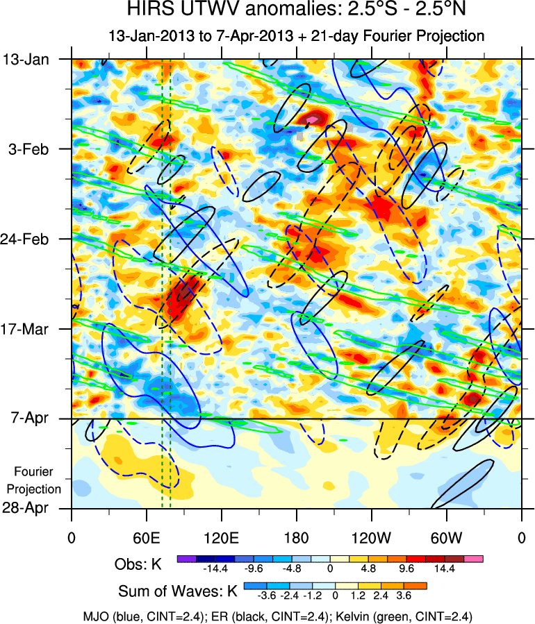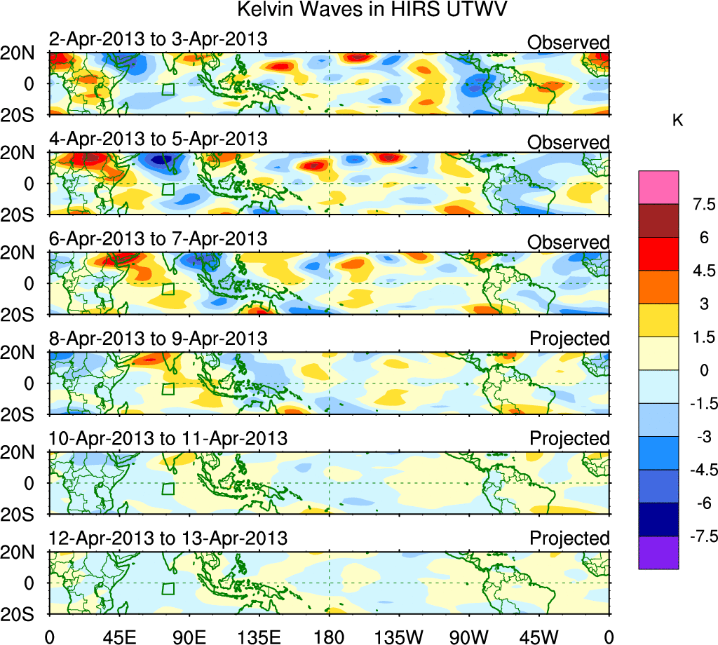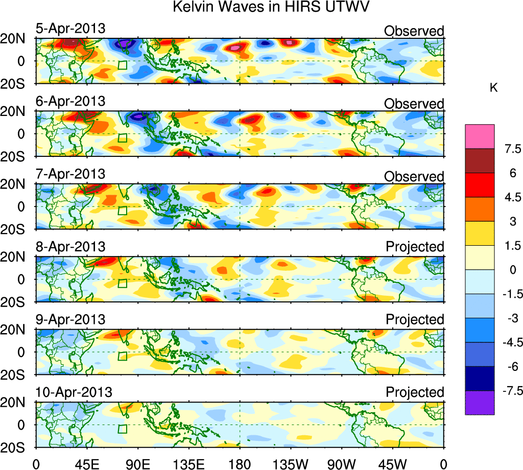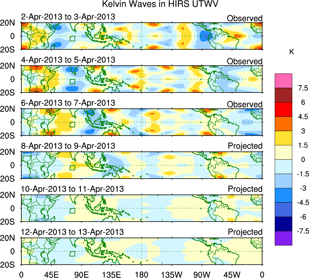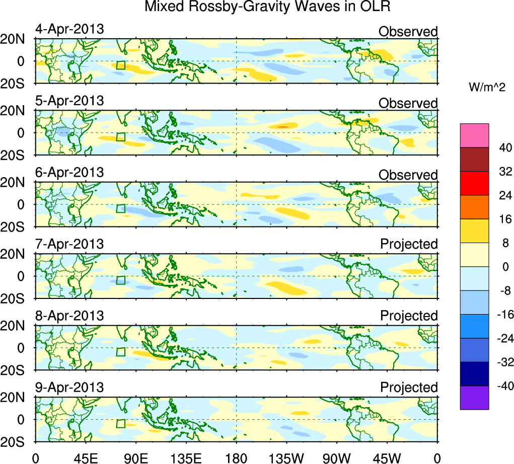To identify tropical waves in near real-time, the OLR and UTWV data are filtered following Wheeler & Weickmann (2001 MWR). The daily anomalies are calculated using the first 3 harmonics of the seasonal cycle for 1979–2009. Missing values are then filled using linear interpolation in space and time. The most recent 365 days of anomalies are padded with 659 days of zeroes, and the result is filtered for each wave type.