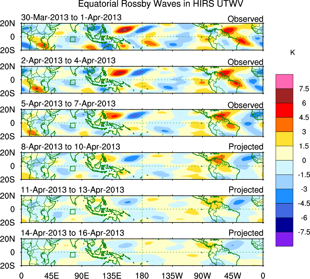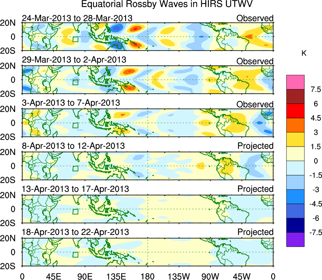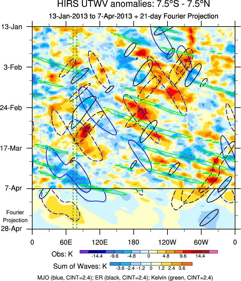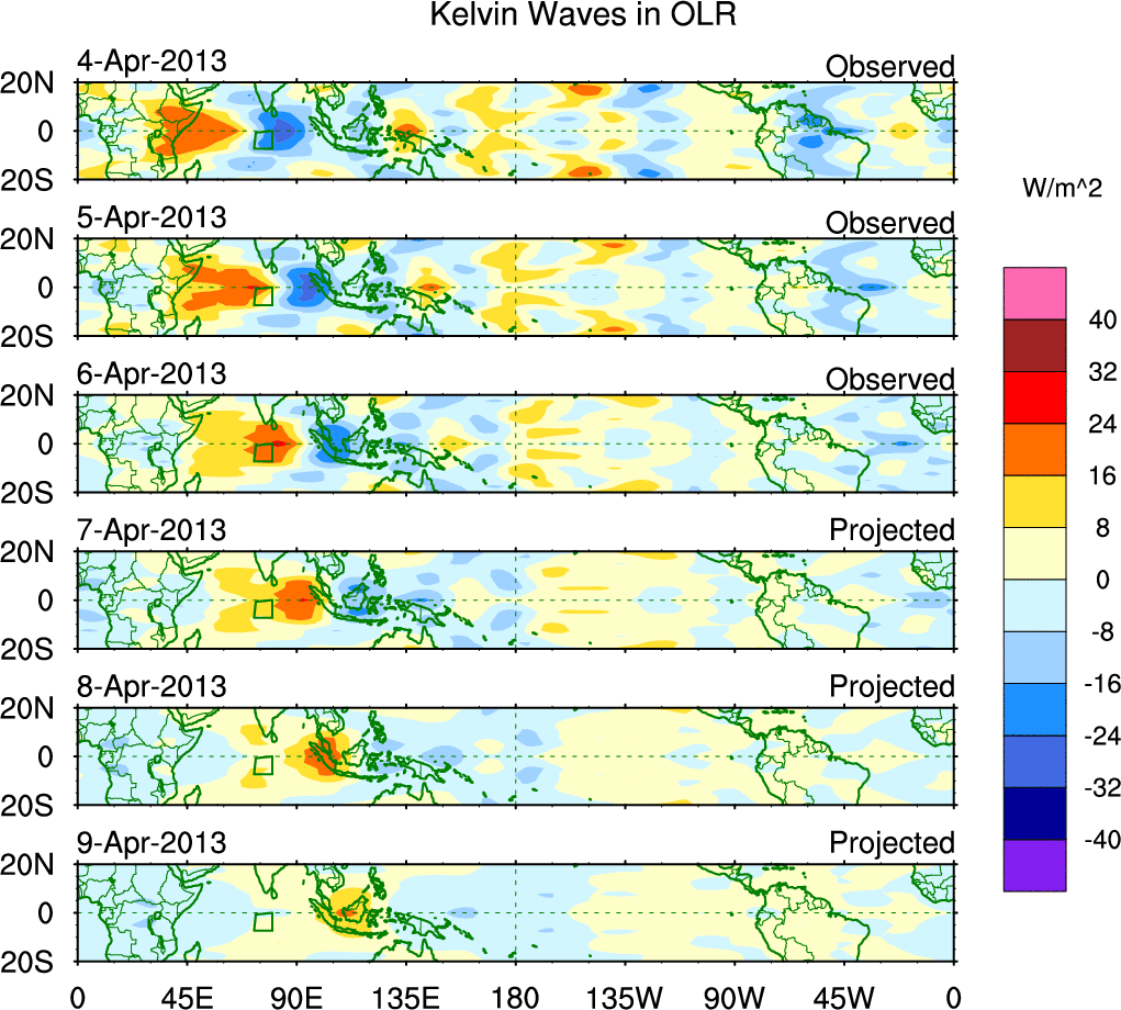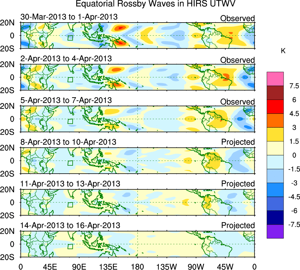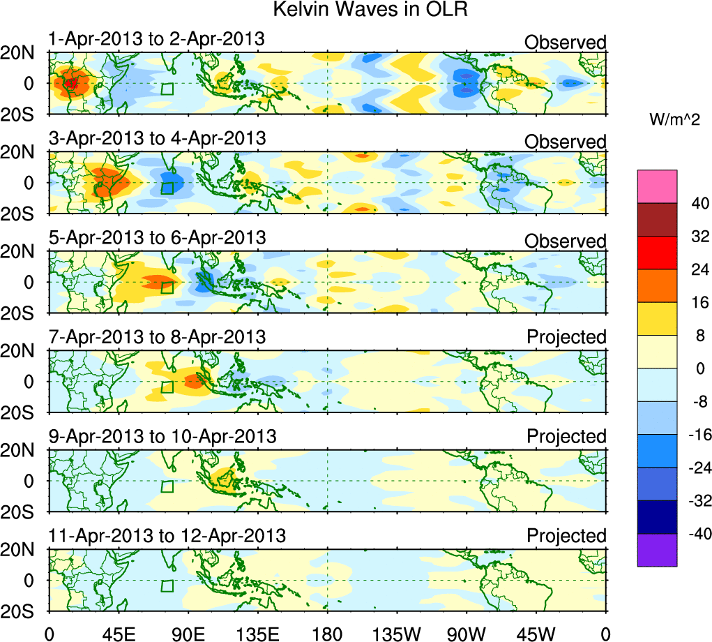 To identify tropical waves in near real-time, the OLR and UTWV data are filtered following Wheeler & Weickmann (2001 MWR). The daily anomalies are calculated using the first 3 harmonics of the seasonal cycle for 1979–2009. Missing values are then filled using linear interpolation in space and time. The most recent 365 days of anomalies are padded with 659 days of zeroes, and the result is filtered for each wave type.