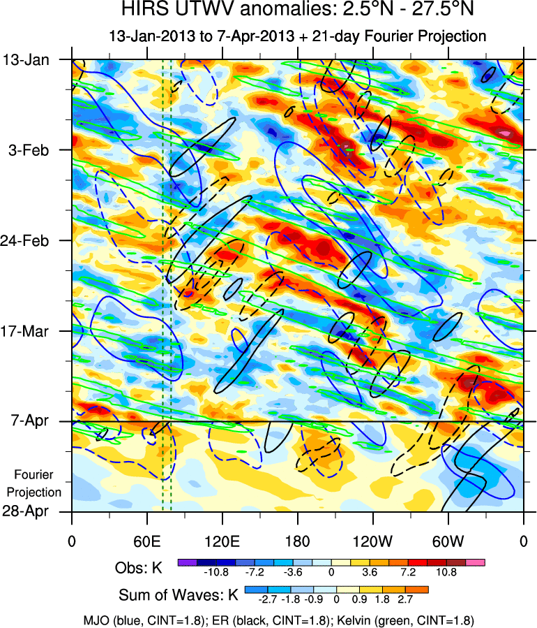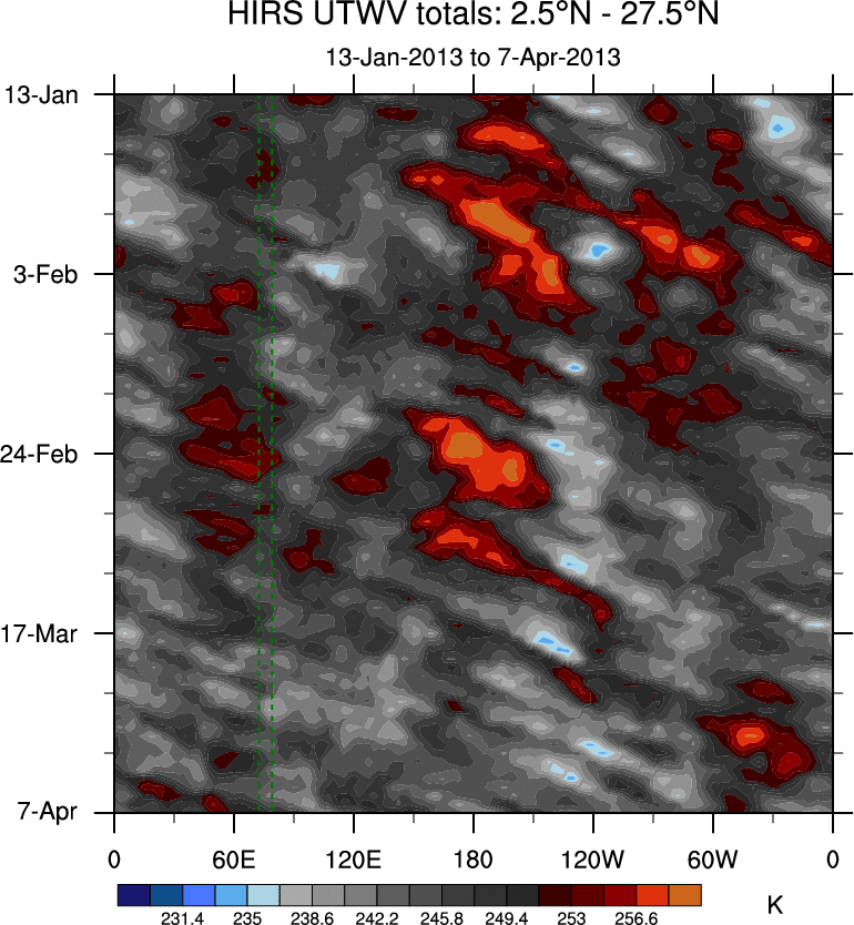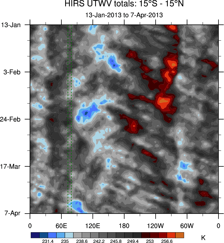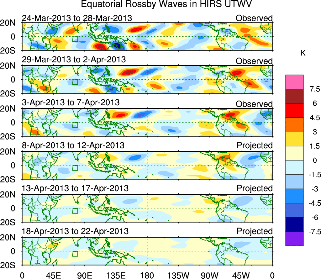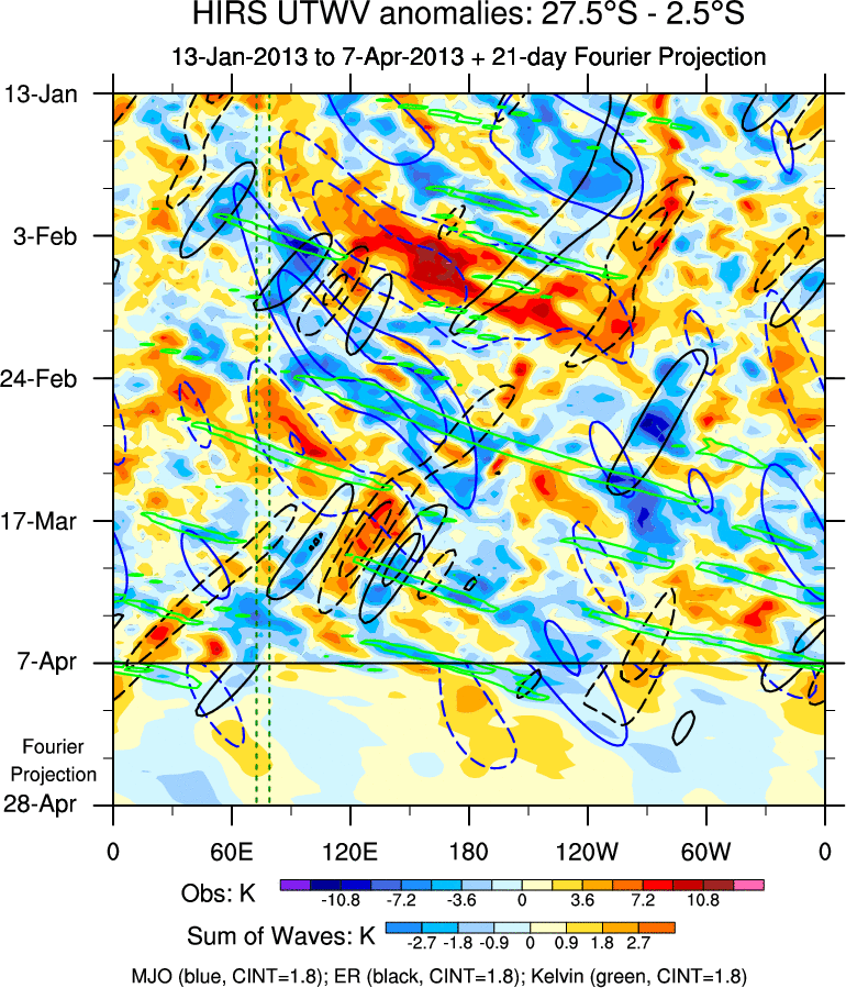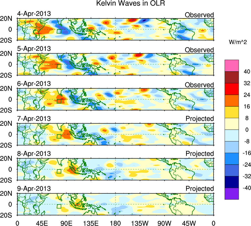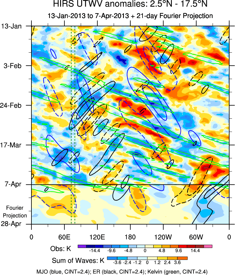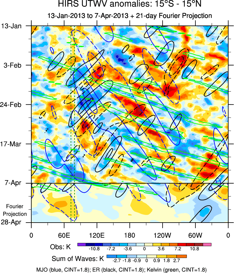 To identify tropical waves in near real-time, the OLR and UTWV data are filtered following Wheeler & Weickmann (2001 MWR). The daily anomalies are calculated using the first 3 harmonics of the seasonal cycle for 1979–2009. Missing values are then filled using linear interpolation in space and time. The most recent 365 days of anomalies are padded with 659 days of zeroes, and the result is filtered for each wave type.