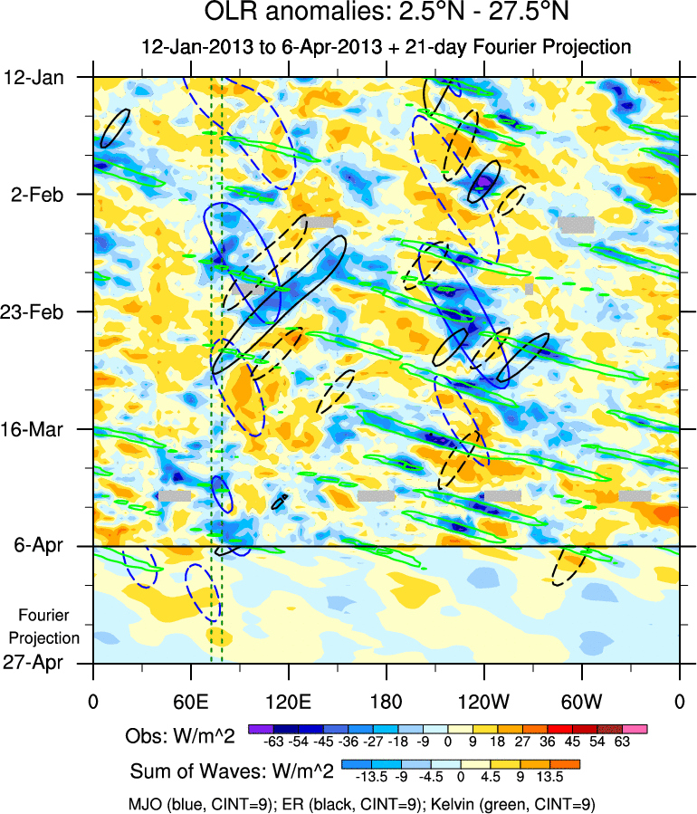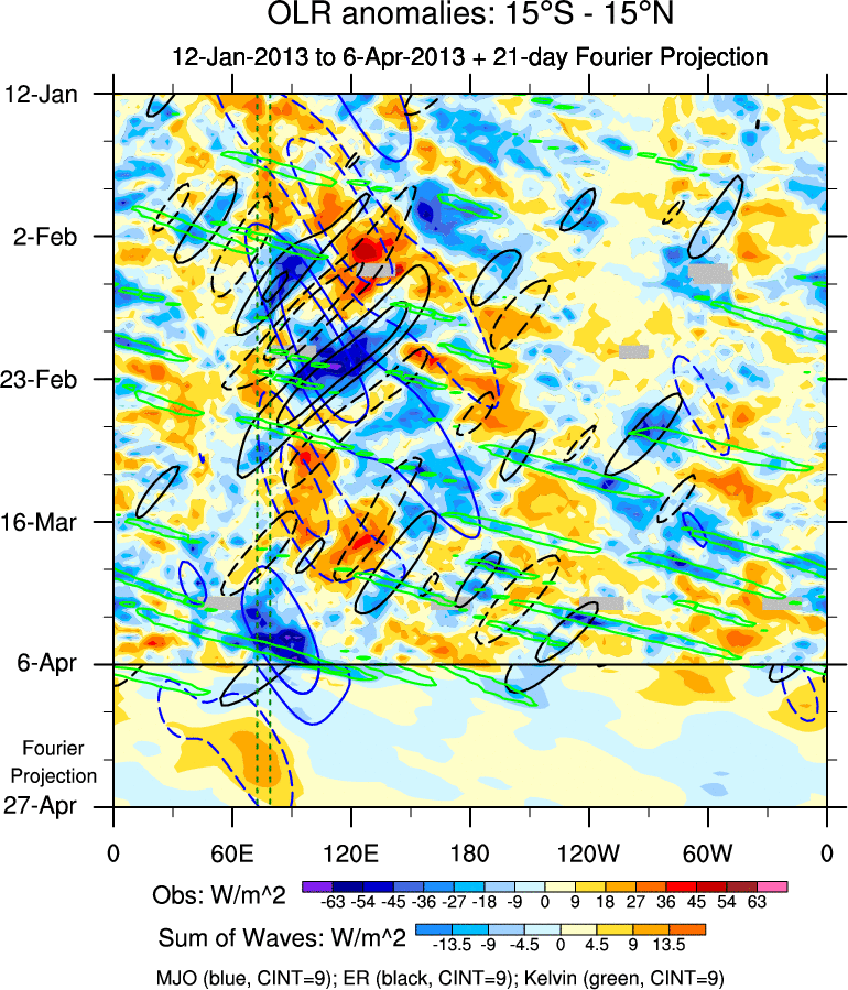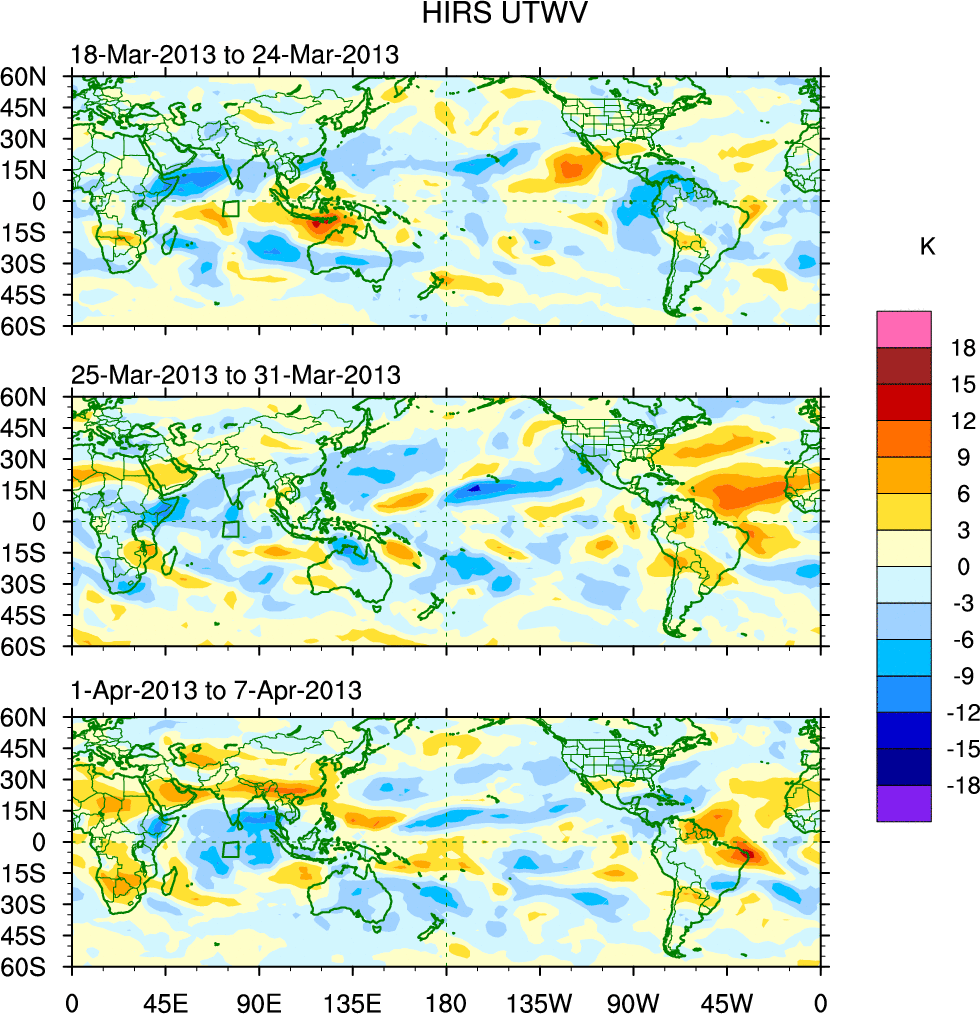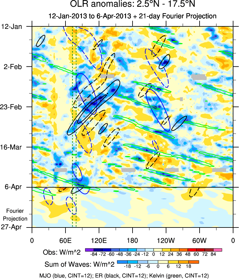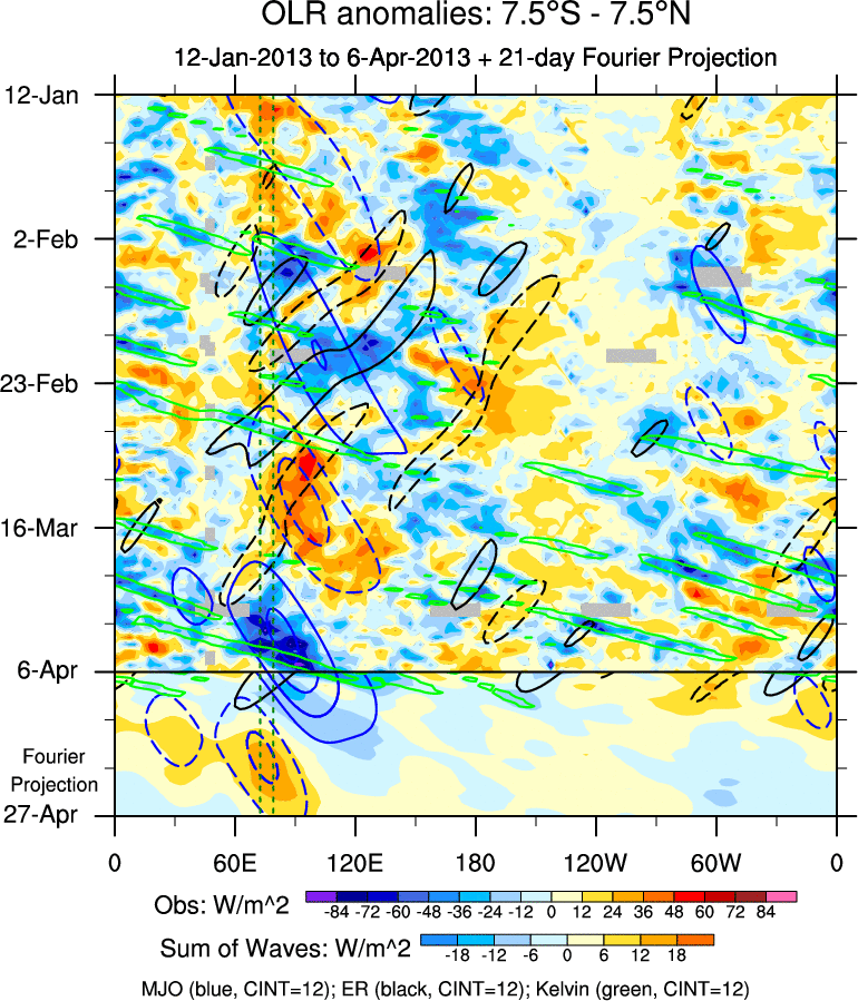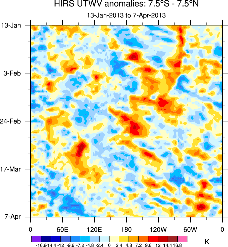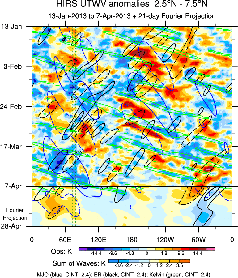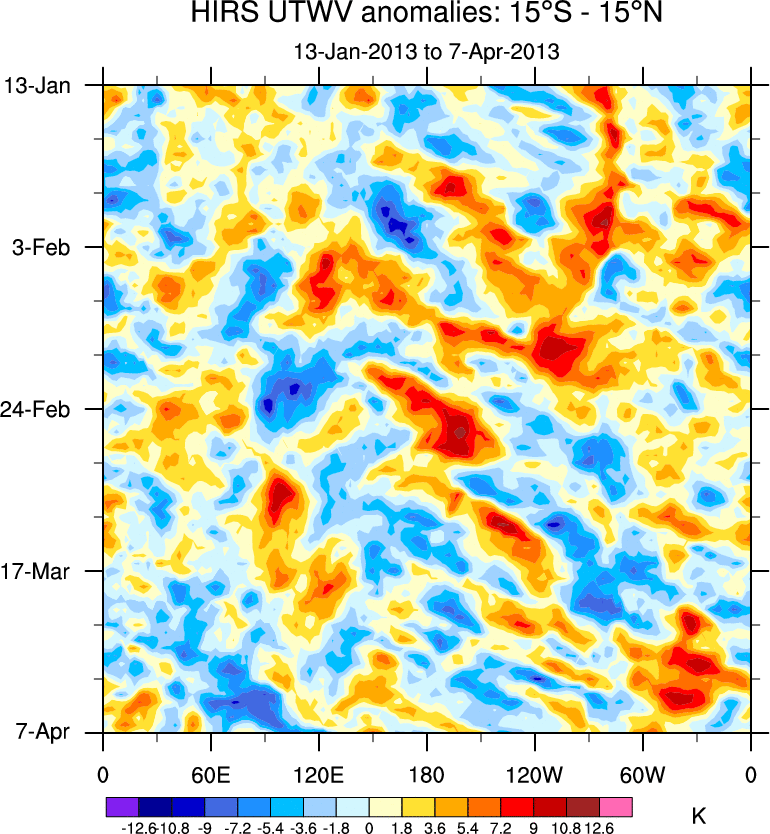 To identify tropical waves in near real-time, the OLR and UTWV data are filtered following Wheeler & Weickmann (2001 MWR). The daily anomalies are calculated using the first 3 harmonics of the seasonal cycle for 1979–2009. Missing values are then filled using linear interpolation in space and time. The most recent 365 days of anomalies are padded with 659 days of zeroes, and the result is filtered for each wave type.