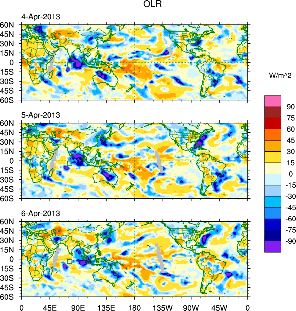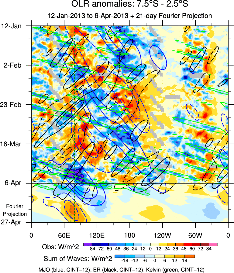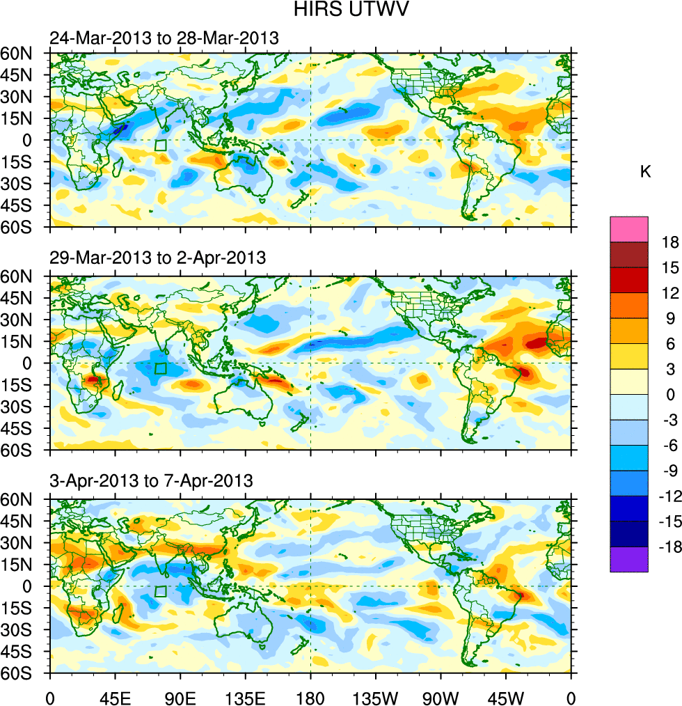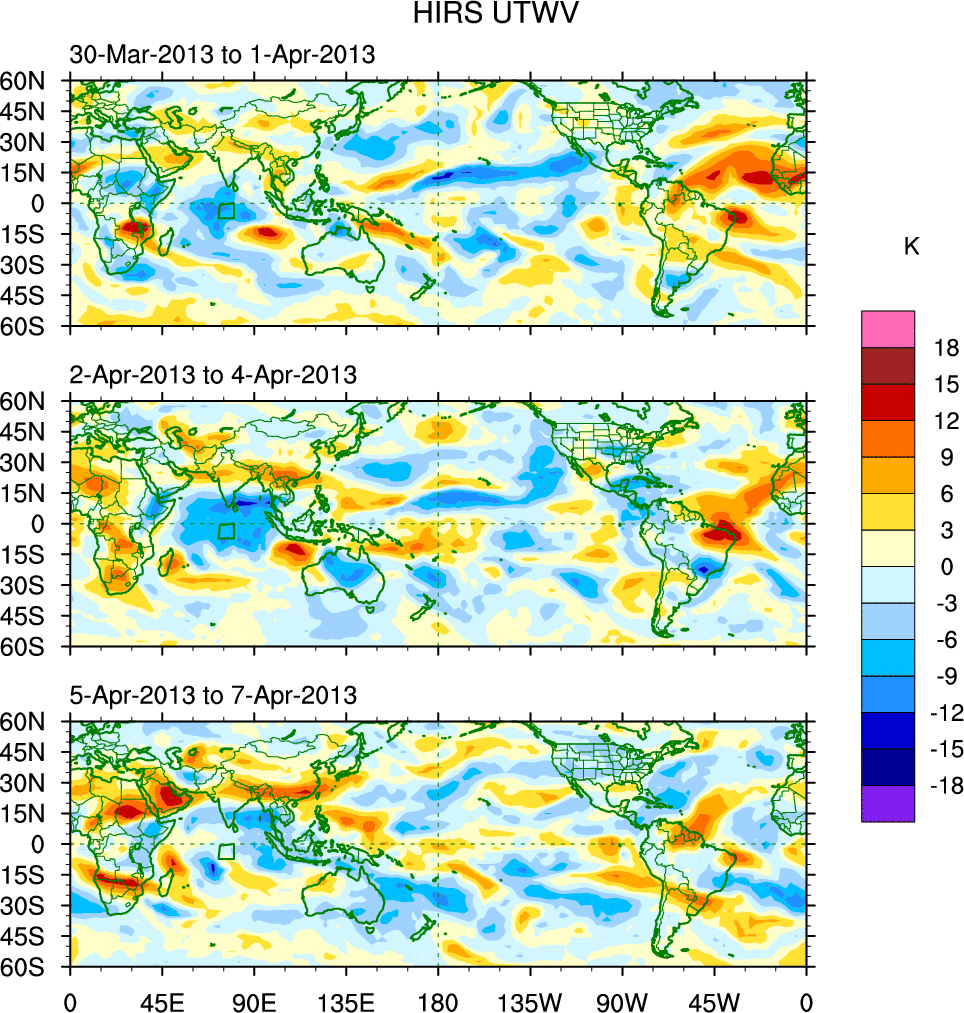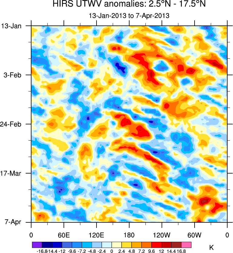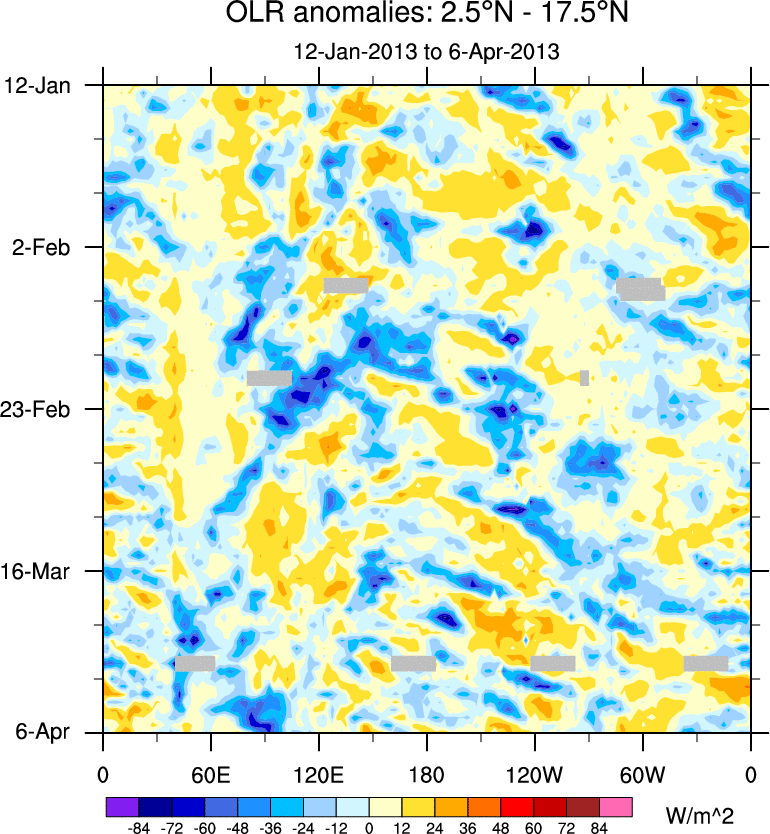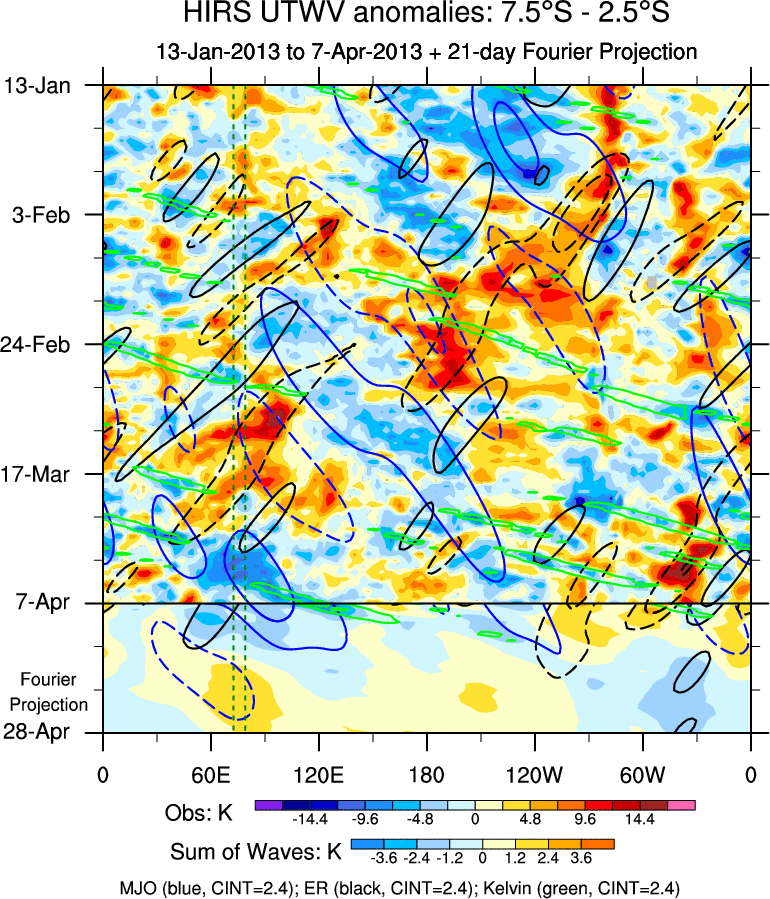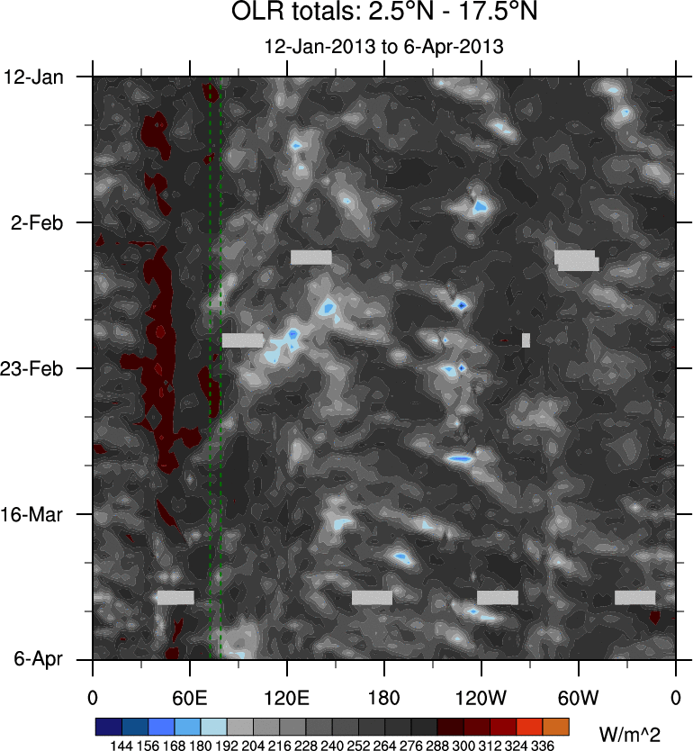 To identify tropical waves in near real-time, the OLR and UTWV data are filtered following Wheeler & Weickmann (2001 MWR). The daily anomalies are calculated using the first 3 harmonics of the seasonal cycle for 1979–2009. Missing values are then filled using linear interpolation in space and time. The most recent 365 days of anomalies are padded with 659 days of zeroes, and the result is filtered for each wave type.