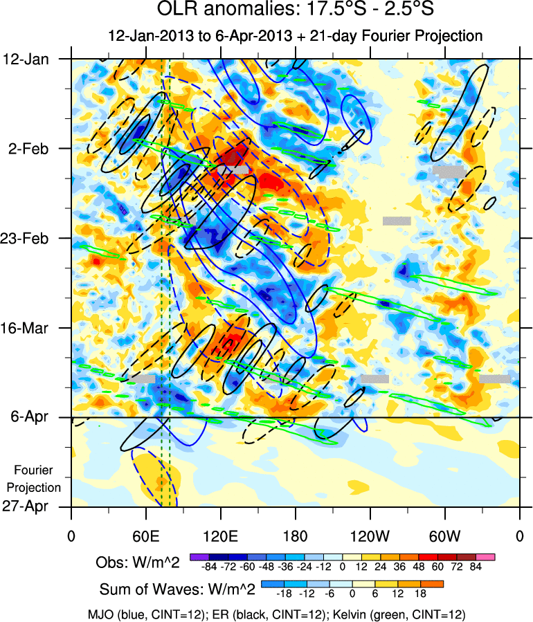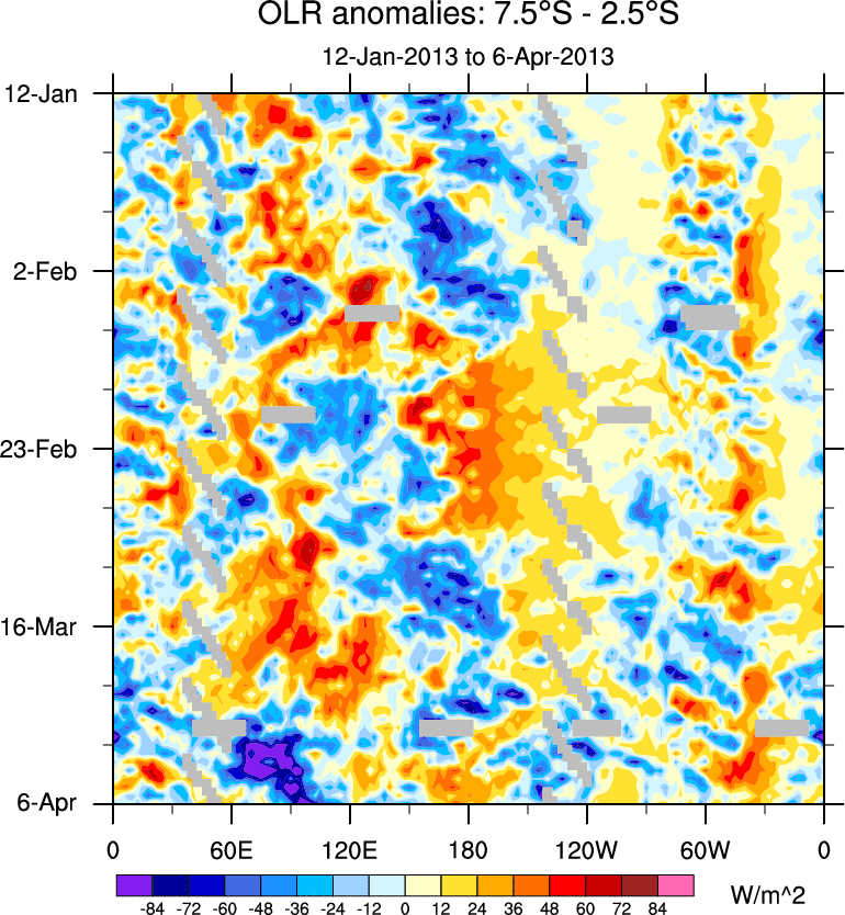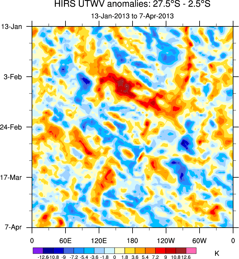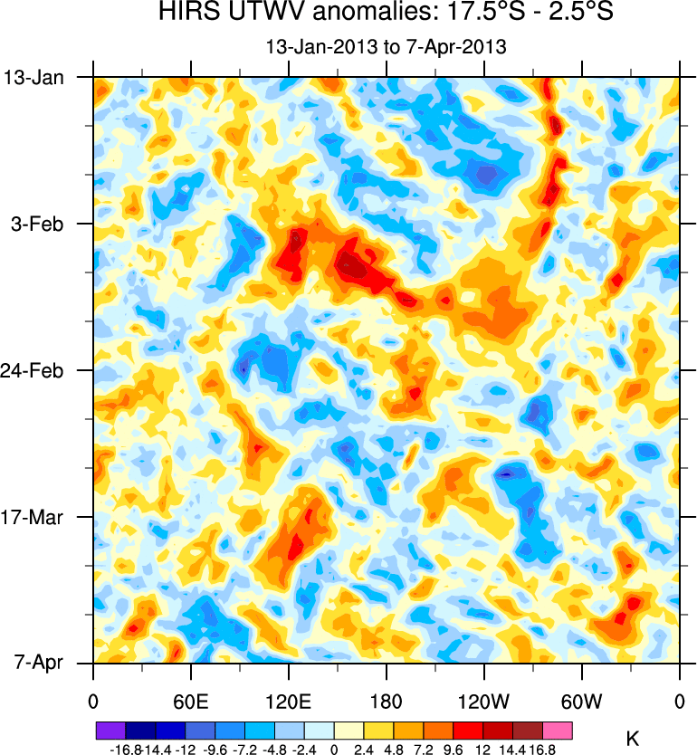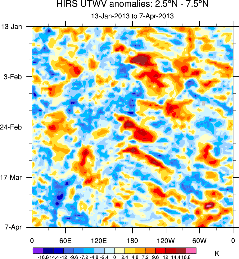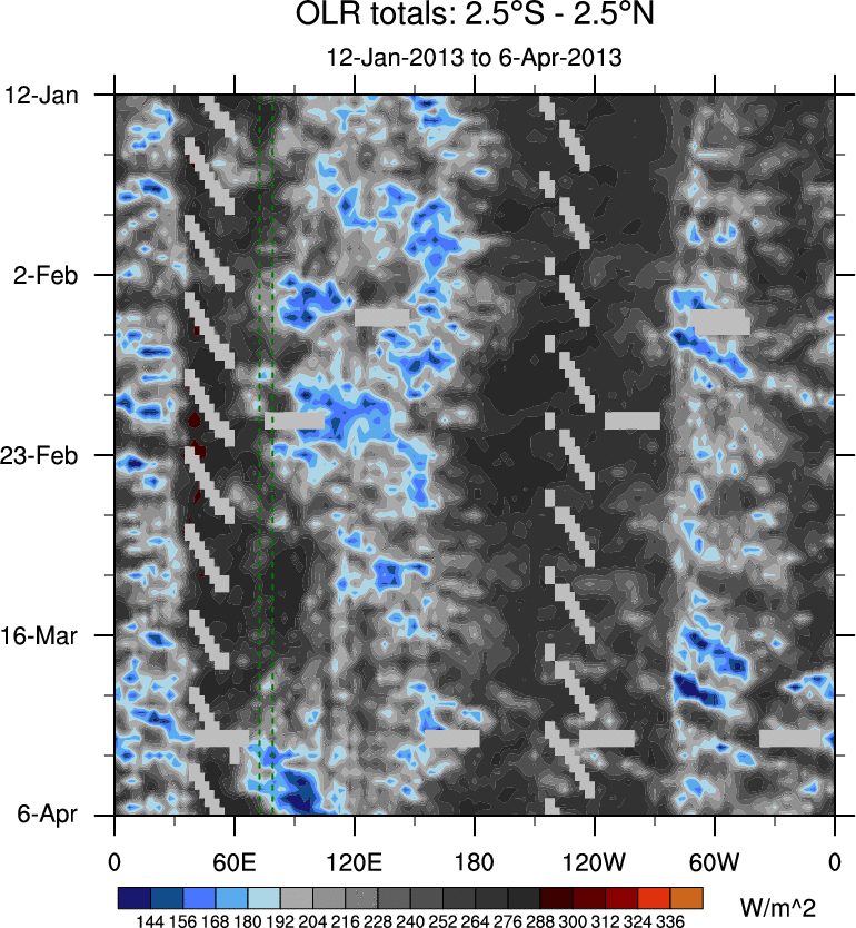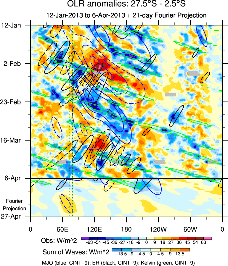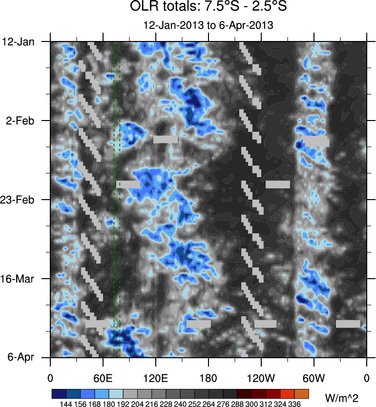 To identify tropical waves in near real-time, the OLR and UTWV data are filtered following Wheeler & Weickmann (2001 MWR). The daily anomalies are calculated using the first 3 harmonics of the seasonal cycle for 1979–2009. Missing values are then filled using linear interpolation in space and time. The most recent 365 days of anomalies are padded with 659 days of zeroes, and the result is filtered for each wave type.