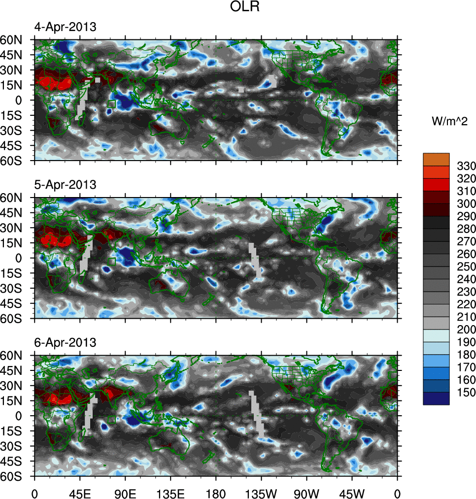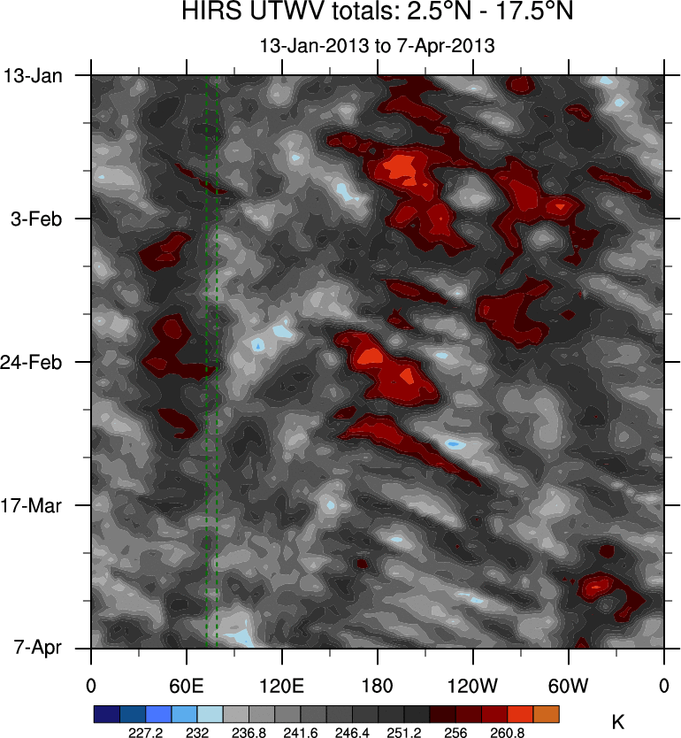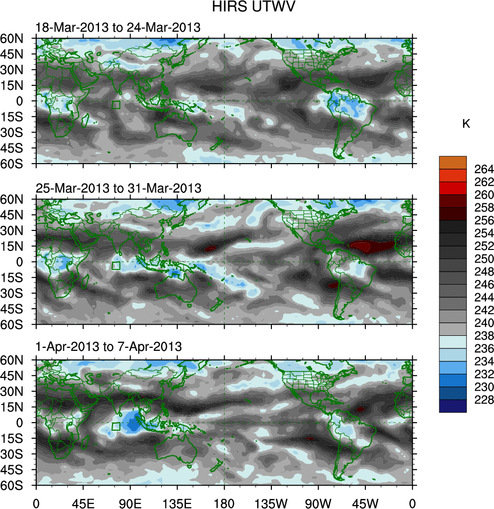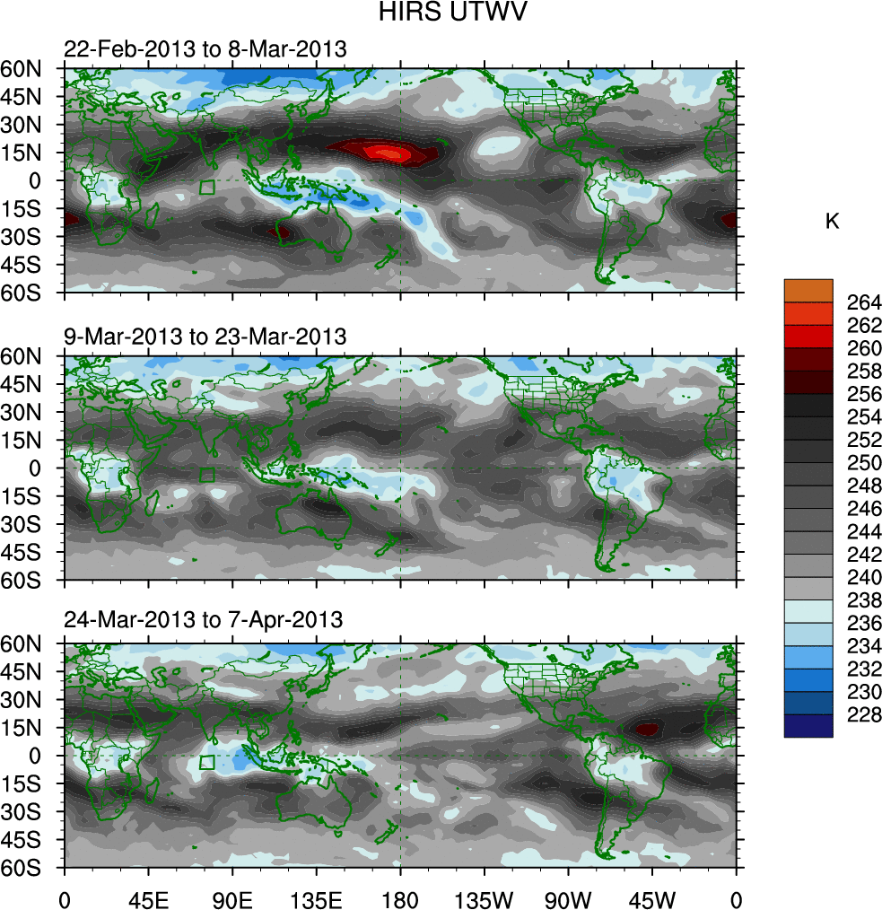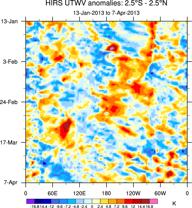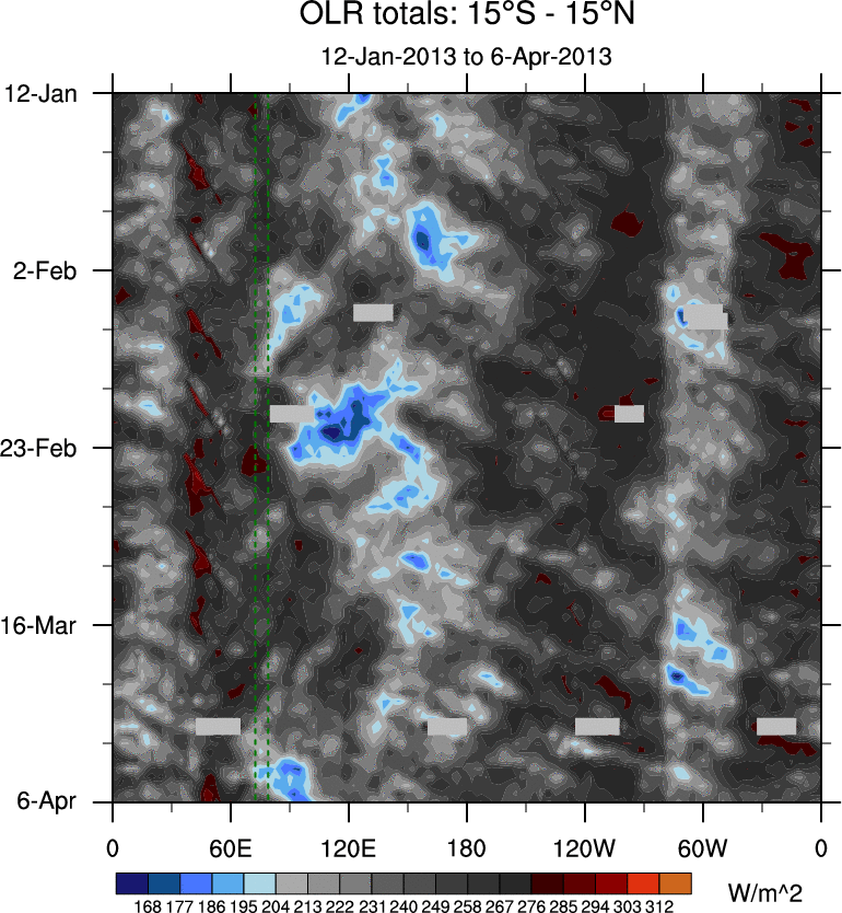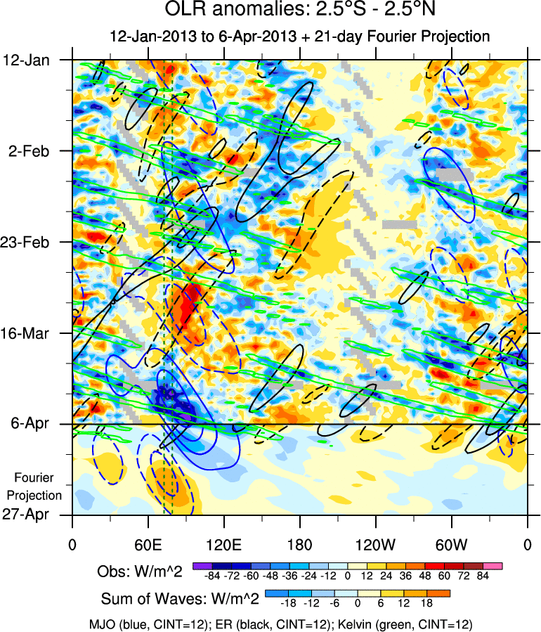 To identify tropical waves in near real-time, the OLR and UTWV data are filtered following Wheeler & Weickmann (2001 MWR). The daily anomalies are calculated using the first 3 harmonics of the seasonal cycle for 1979–2009. Missing values are then filled using linear interpolation in space and time. The most recent 365 days of anomalies are padded with 659 days of zeroes, and the result is filtered for each wave type.