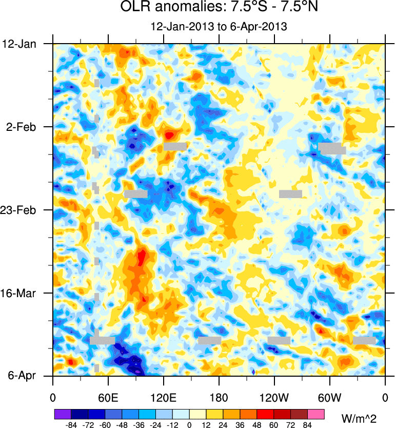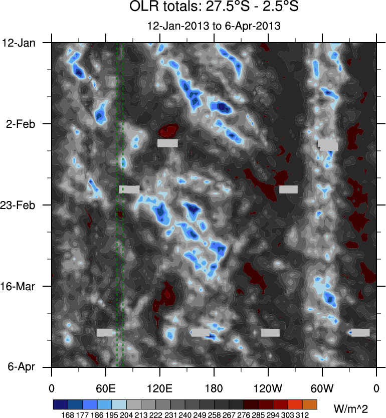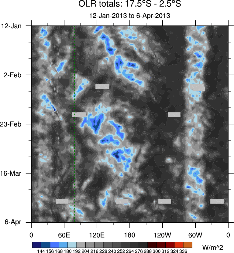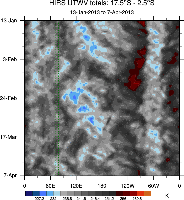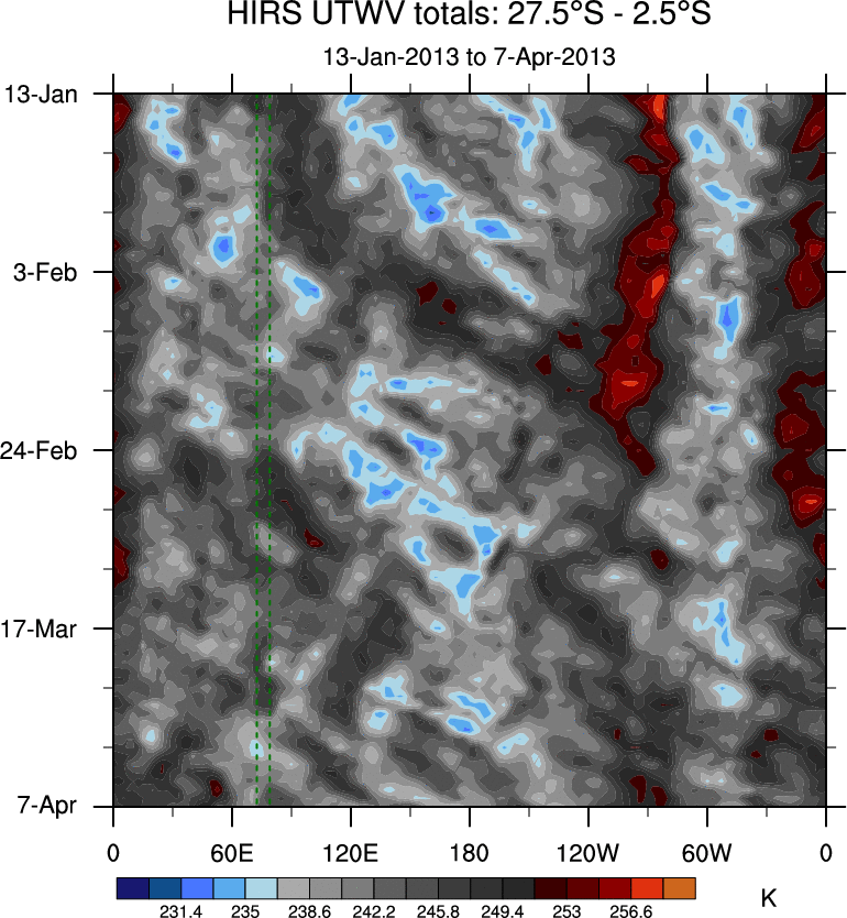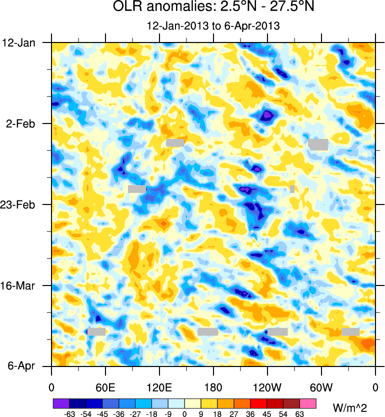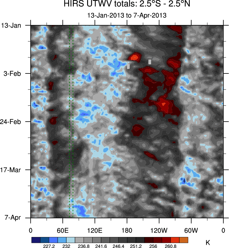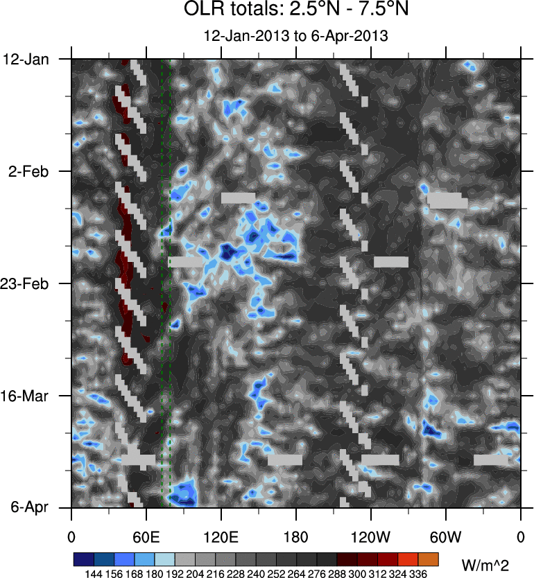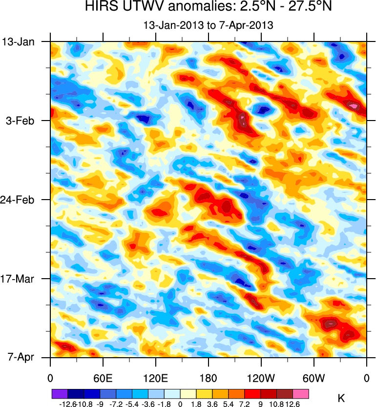 To identify tropical waves in near real-time, the OLR and UTWV data are filtered following Wheeler & Weickmann (2001 MWR). The daily anomalies are calculated using the first 3 harmonics of the seasonal cycle for 1979–2009. Missing values are then filled using linear interpolation in space and time. The most recent 365 days of anomalies are padded with 659 days of zeroes, and the result is filtered for each wave type.
