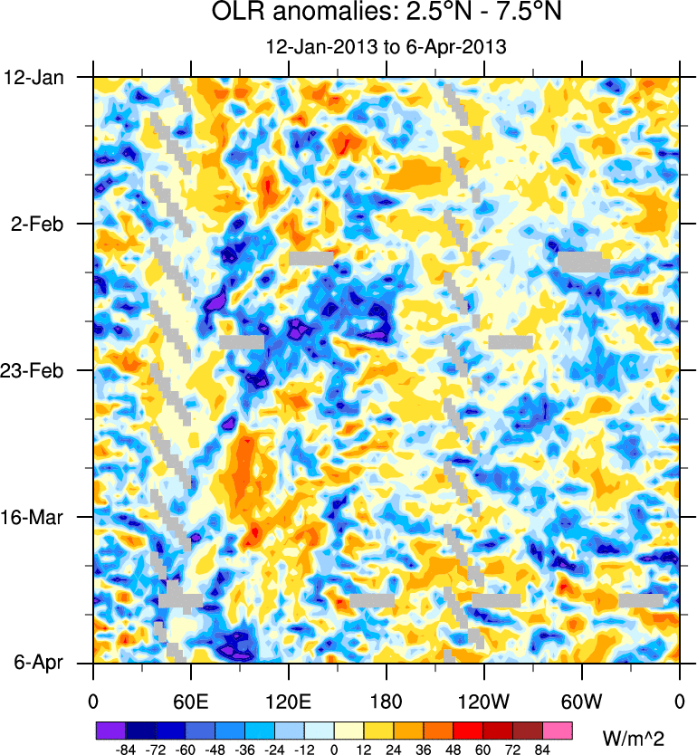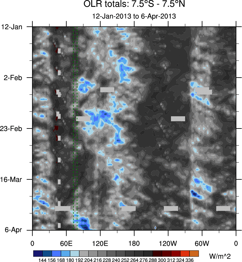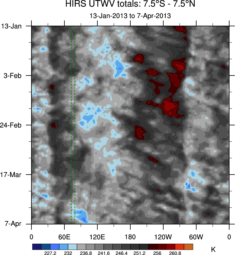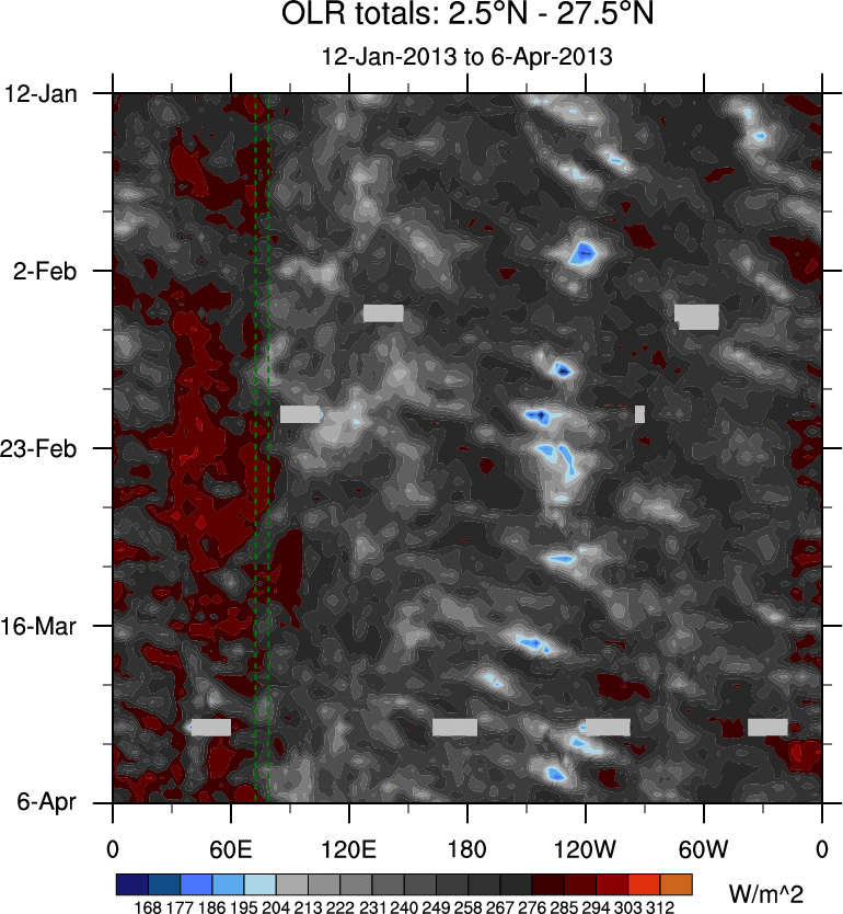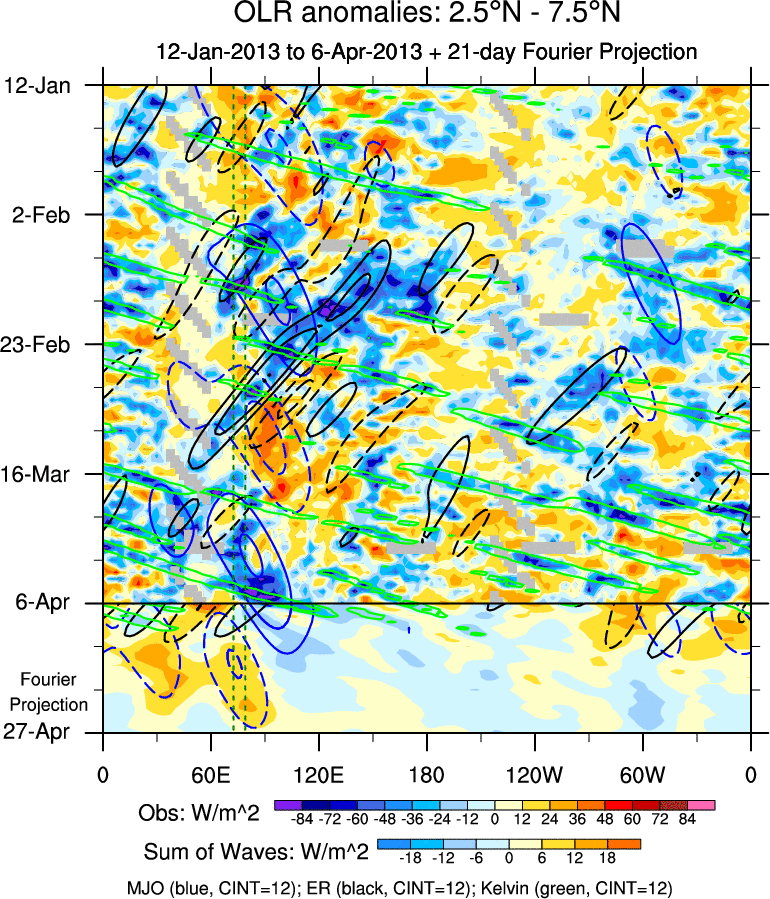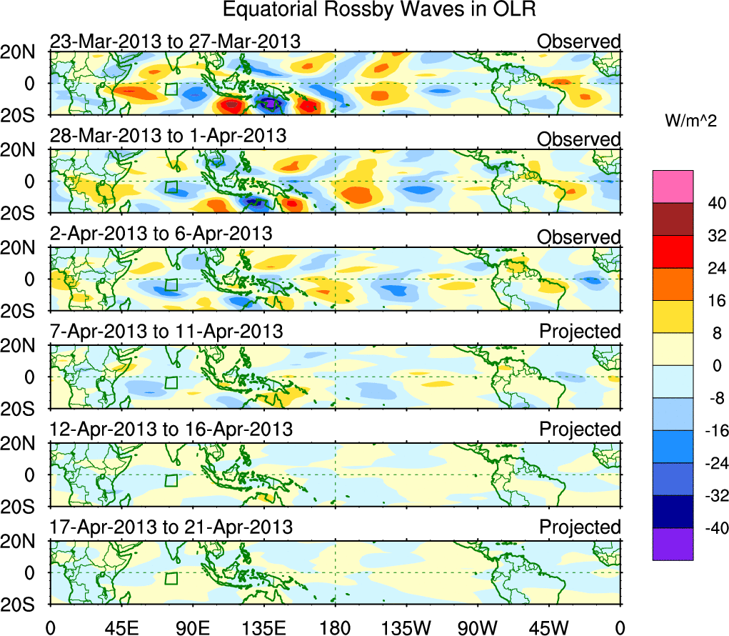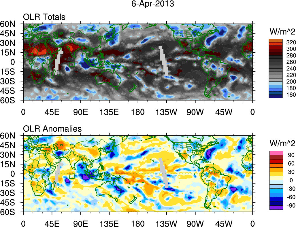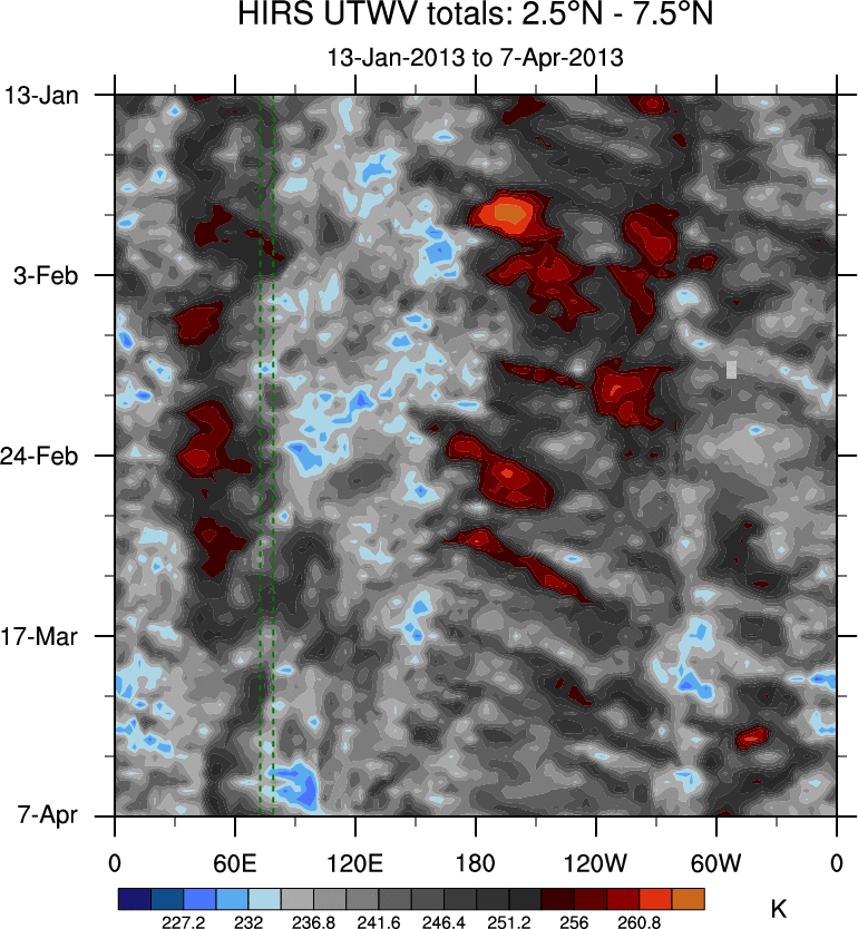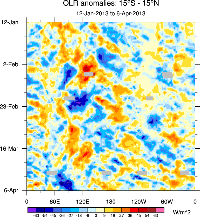 To identify tropical waves in near real-time, the OLR and UTWV data are filtered following Wheeler & Weickmann (2001 MWR). The daily anomalies are calculated using the first 3 harmonics of the seasonal cycle for 1979–2009. Missing values are then filled using linear interpolation in space and time. The most recent 365 days of anomalies are padded with 659 days of zeroes, and the result is filtered for each wave type.