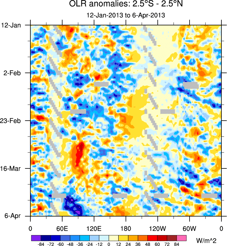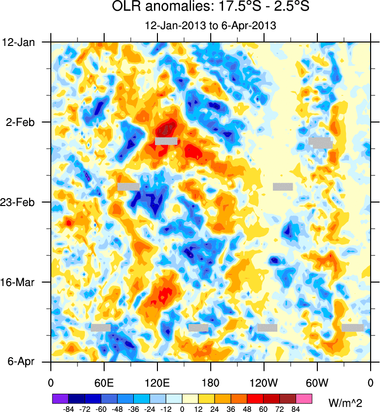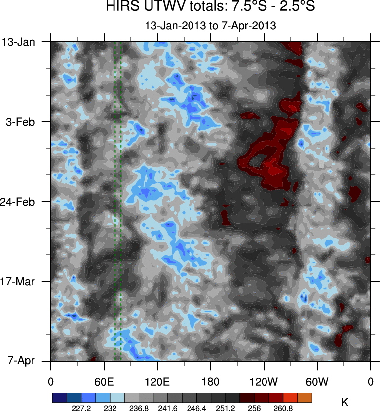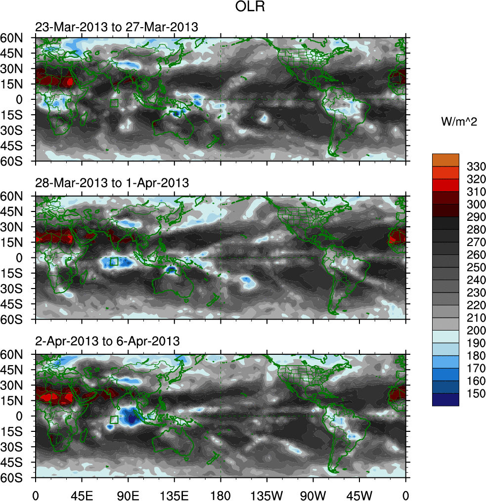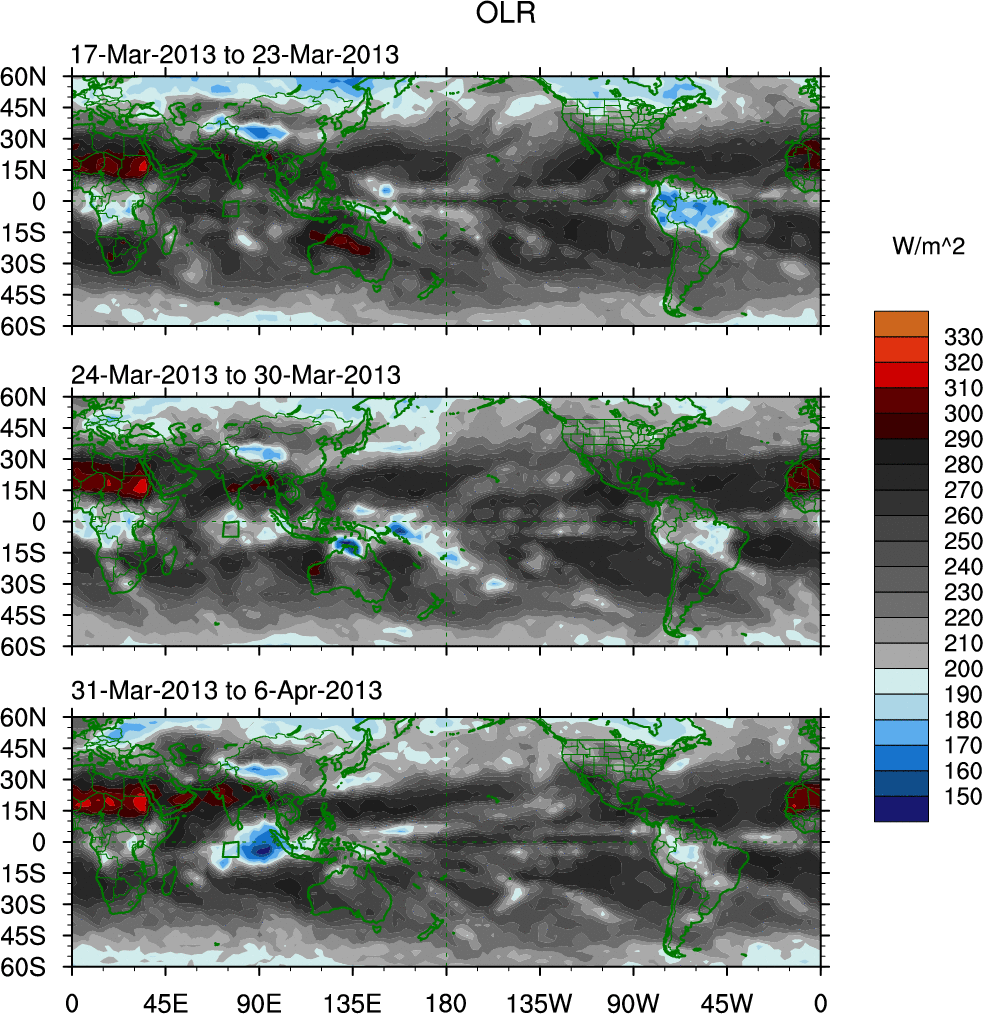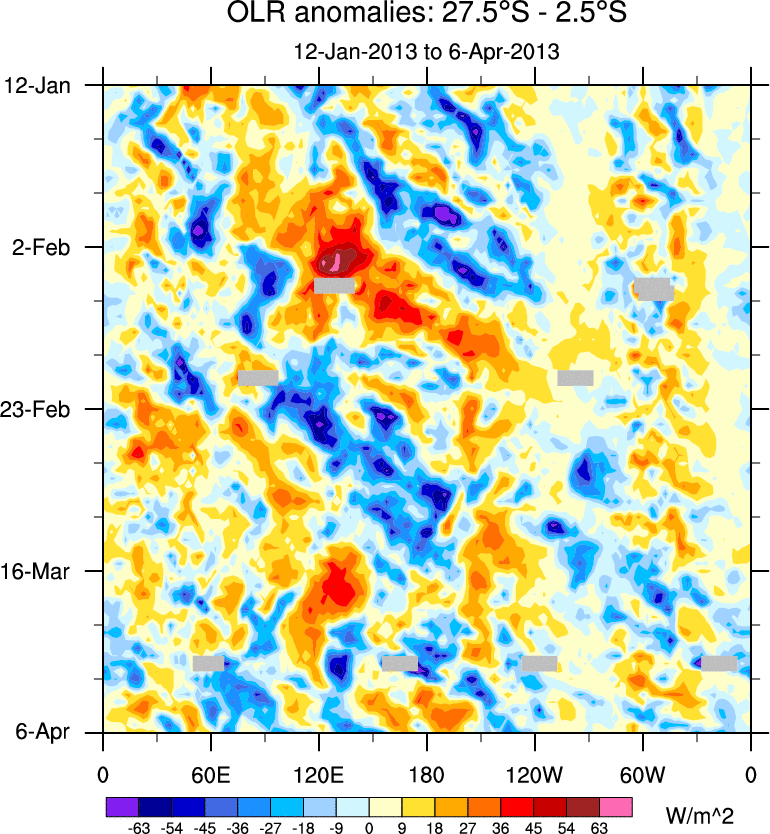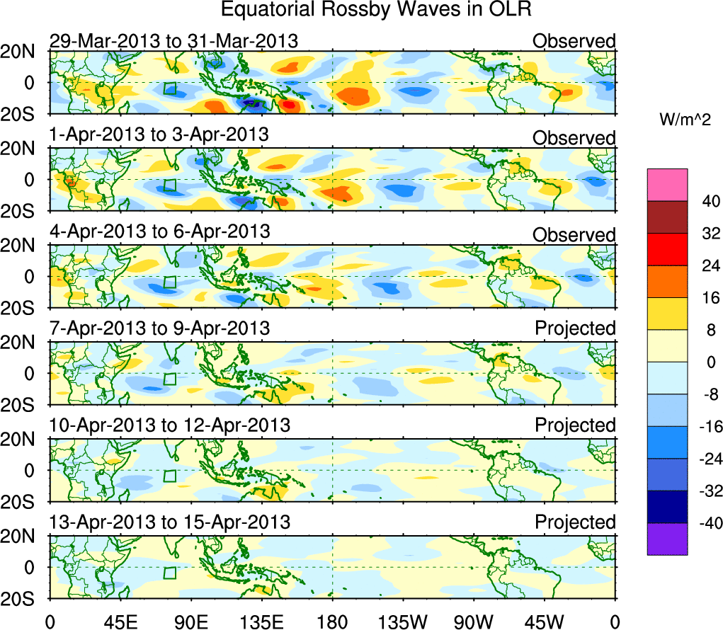 To identify tropical waves in near real-time, the OLR and UTWV data are filtered following Wheeler & Weickmann (2001 MWR). The daily anomalies are calculated using the first 3 harmonics of the seasonal cycle for 1979–2009. Missing values are then filled using linear interpolation in space and time. The most recent 365 days of anomalies are padded with 659 days of zeroes, and the result is filtered for each wave type.