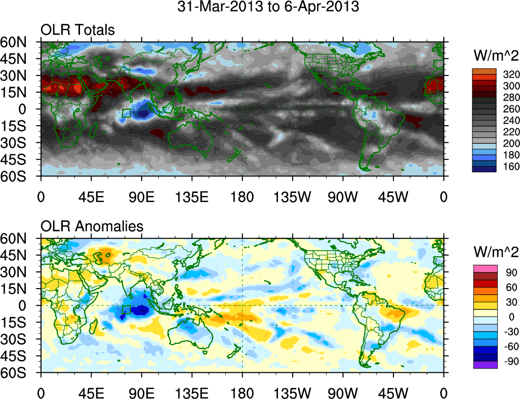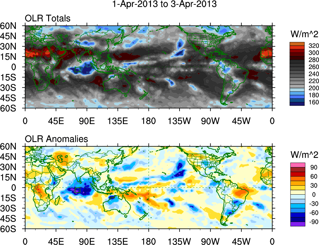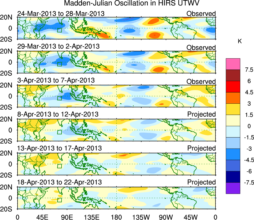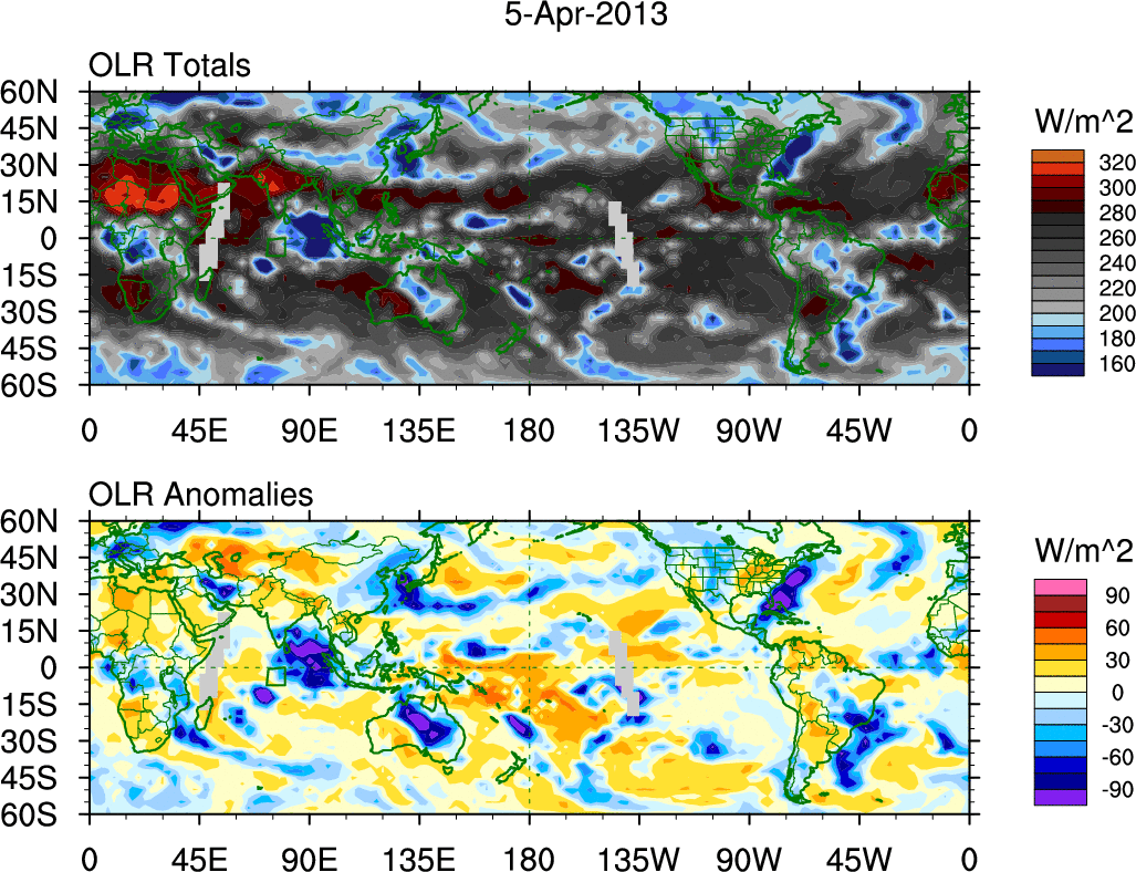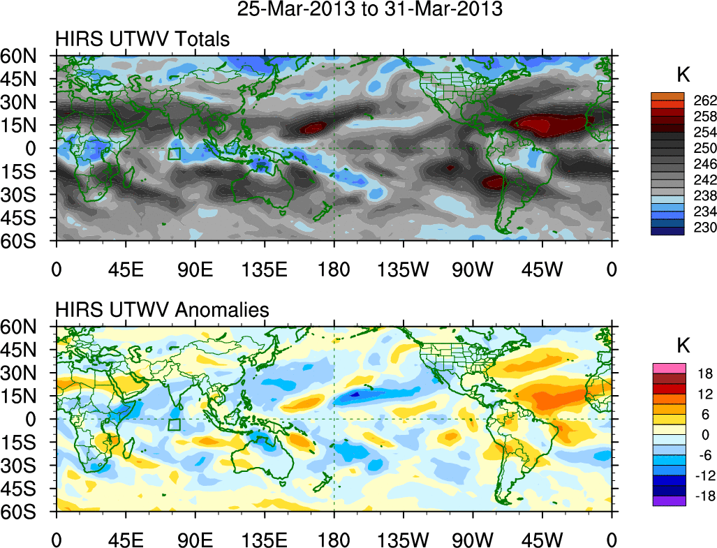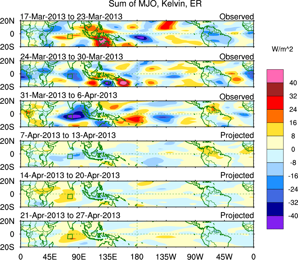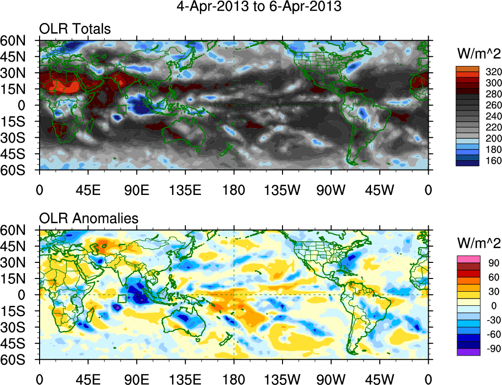 To identify tropical waves in near real-time, the OLR and UTWV data are filtered following Wheeler & Weickmann (2001 MWR). The daily anomalies are calculated using the first 3 harmonics of the seasonal cycle for 1979–2009. Missing values are then filled using linear interpolation in space and time. The most recent 365 days of anomalies are padded with 659 days of zeroes, and the result is filtered for each wave type.