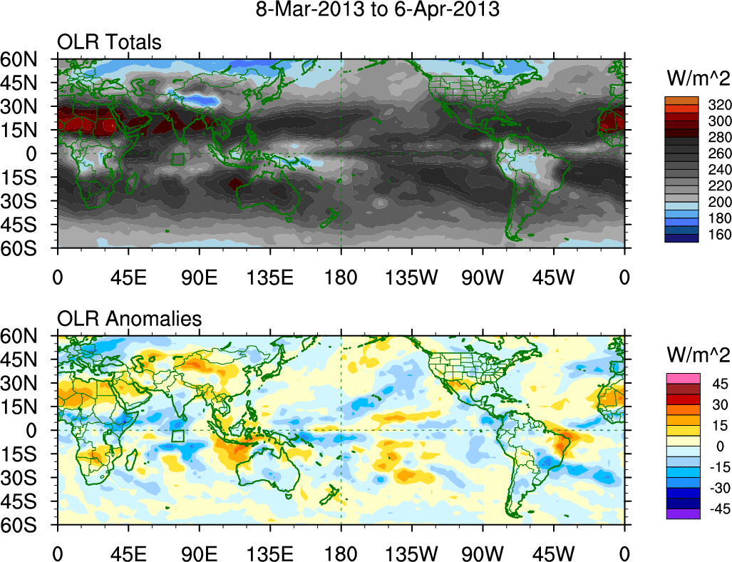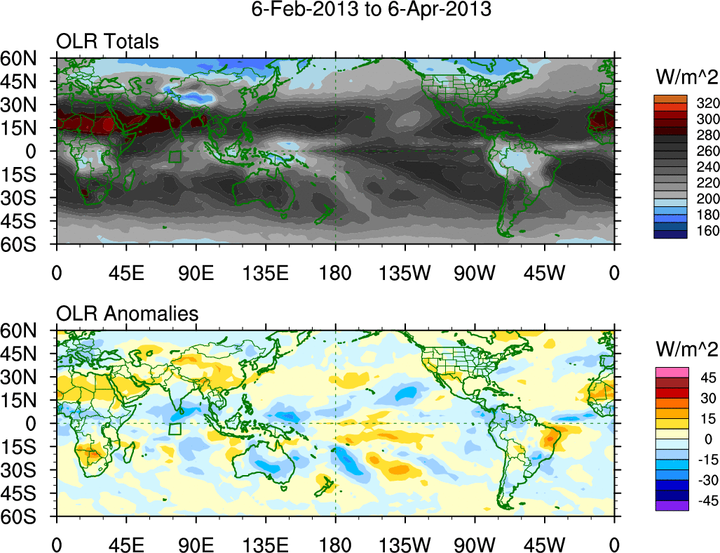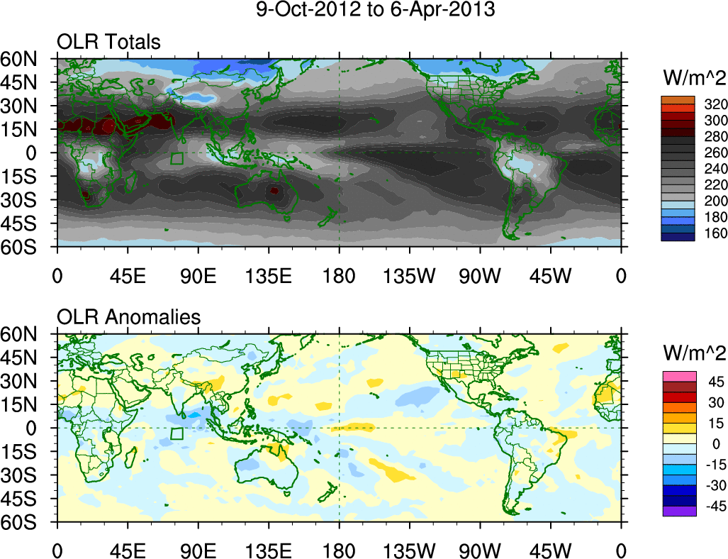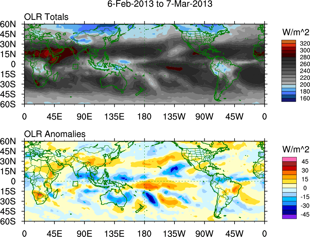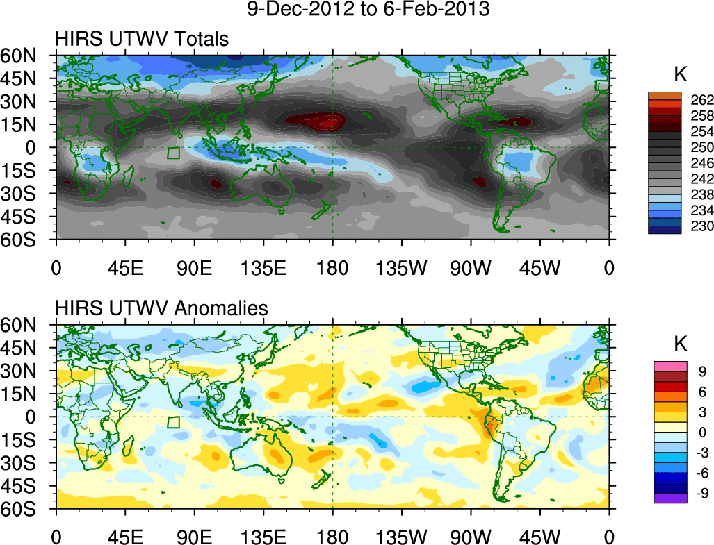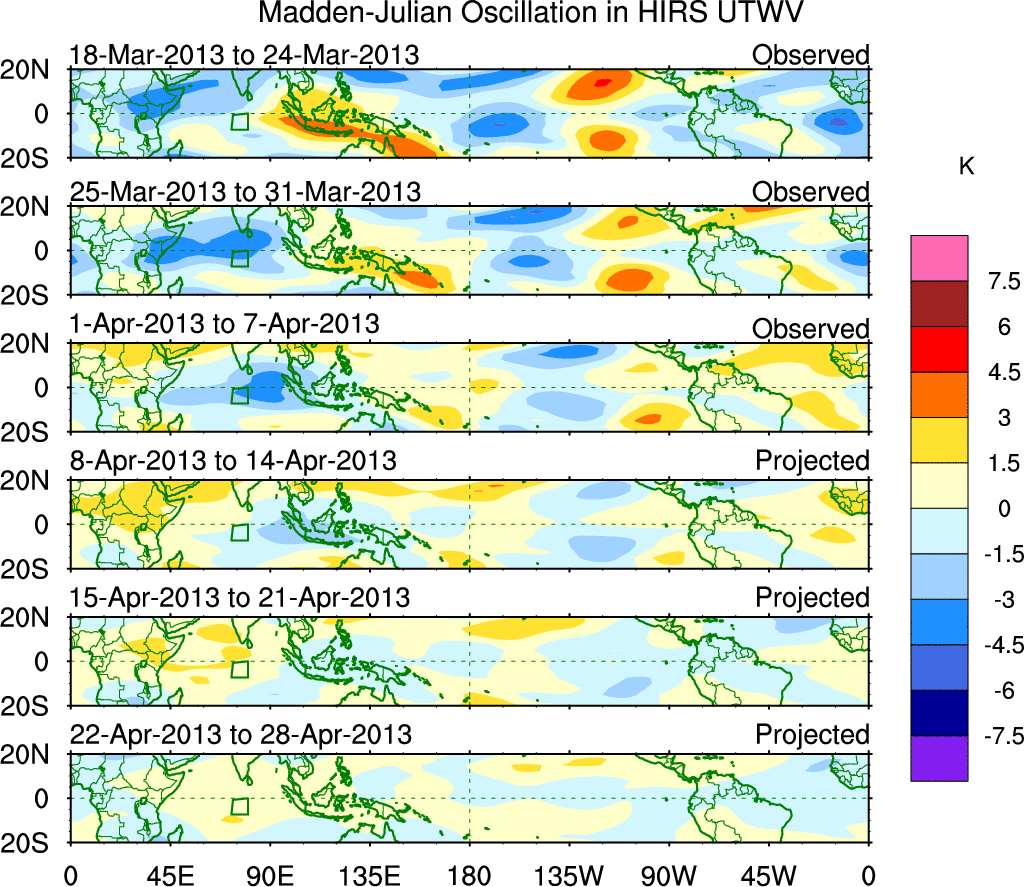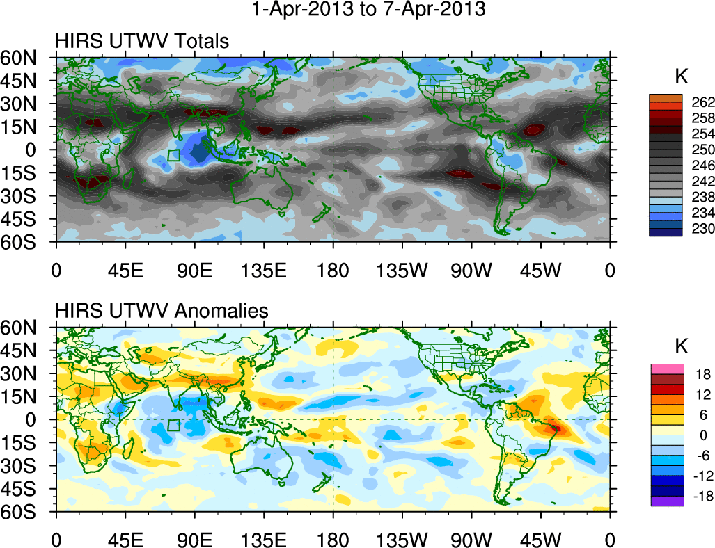 To identify tropical waves in near real-time, the OLR and UTWV data are filtered following Wheeler & Weickmann (2001 MWR). The daily anomalies are calculated using the first 3 harmonics of the seasonal cycle for 1979–2009. Missing values are then filled using linear interpolation in space and time. The most recent 365 days of anomalies are padded with 659 days of zeroes, and the result is filtered for each wave type.