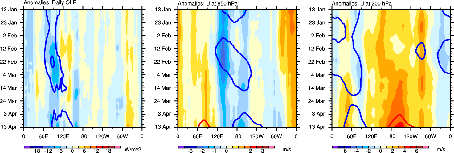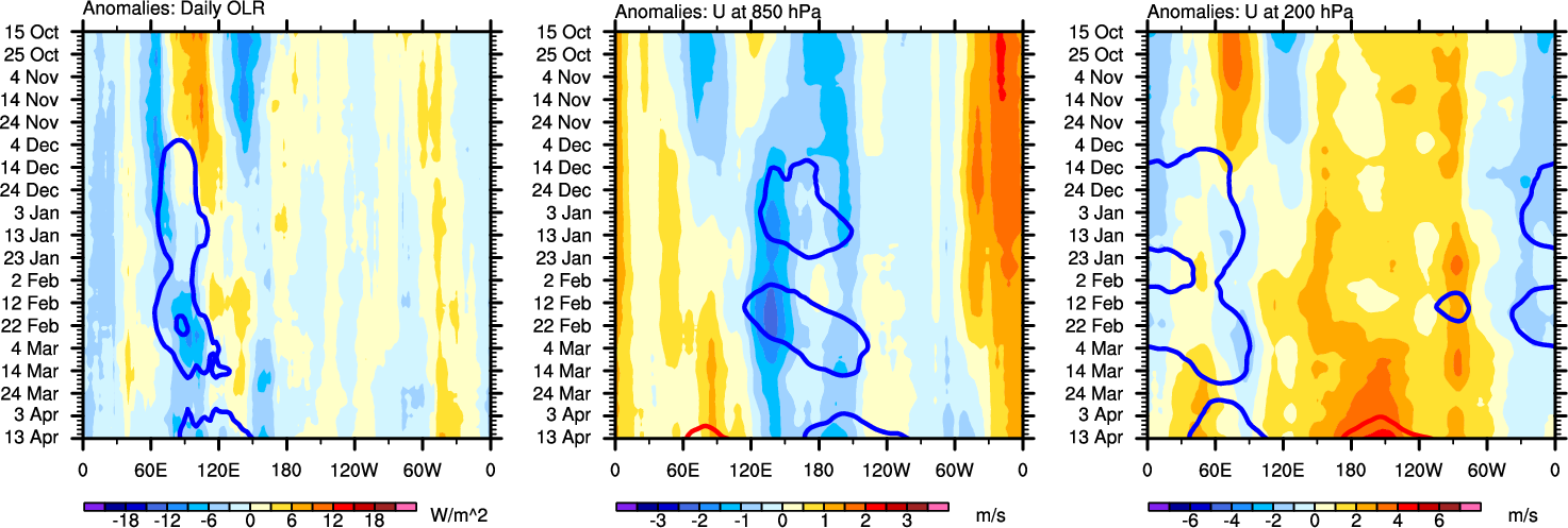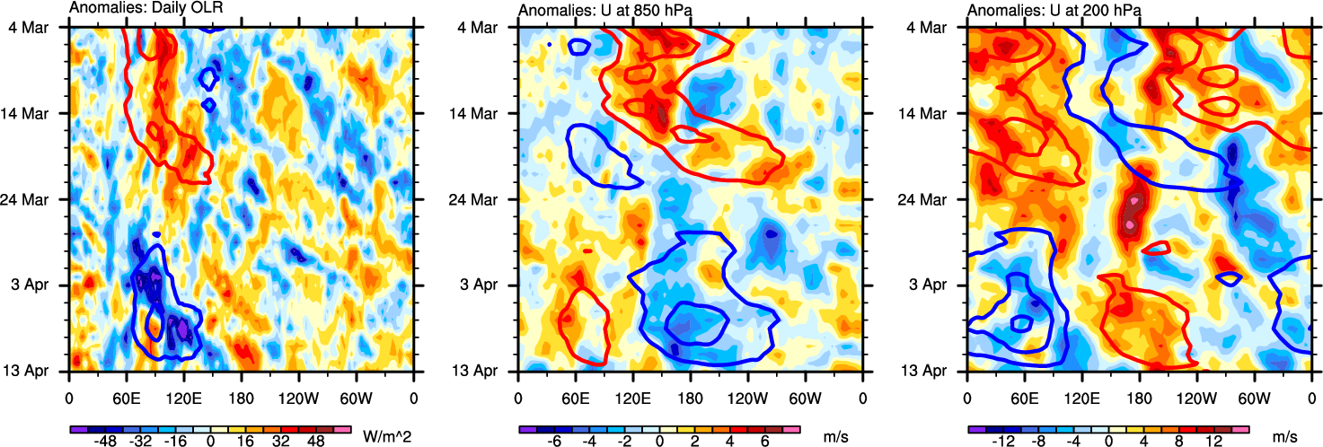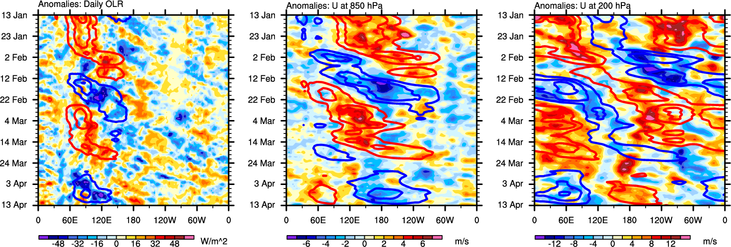 The Hovmollers show longitude-time plots for OLR, U-850, and U-200. The shading indicates the observed anomalies, while the contours are the projection of those anomalies onto the RMM EOFs.