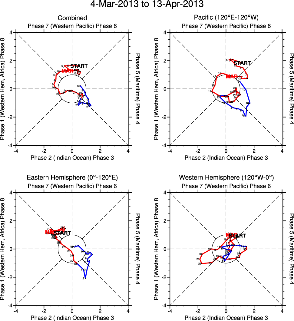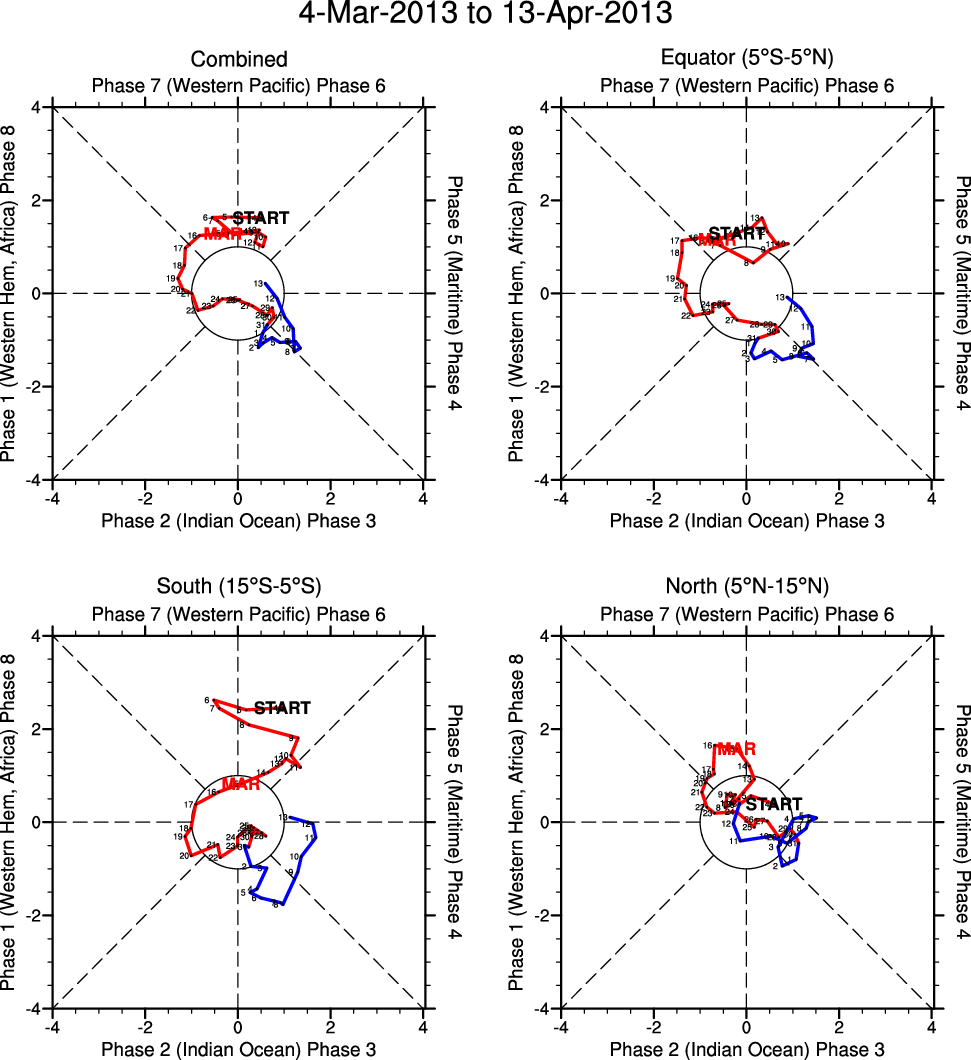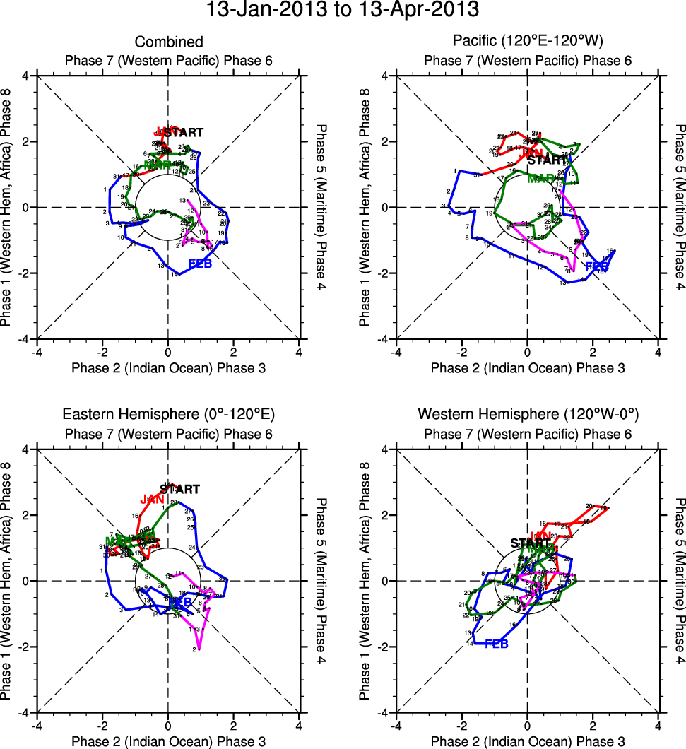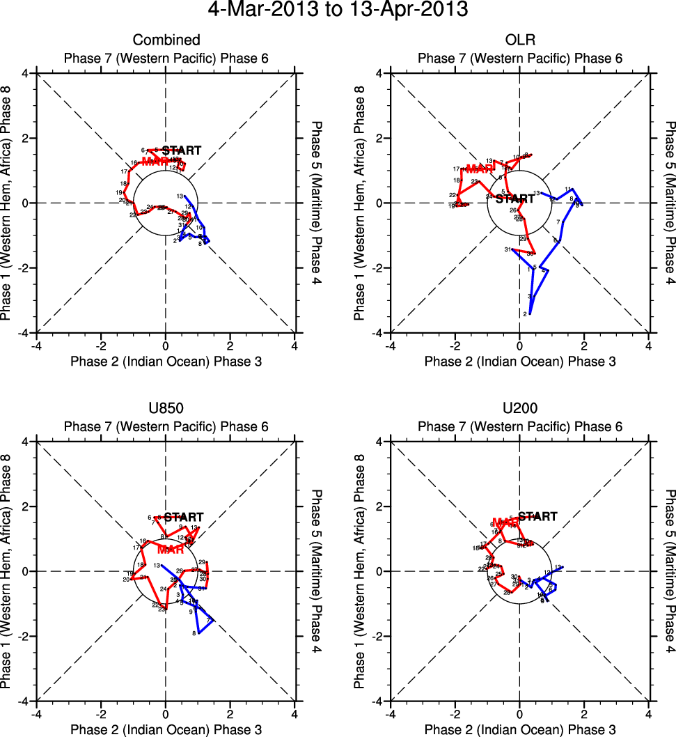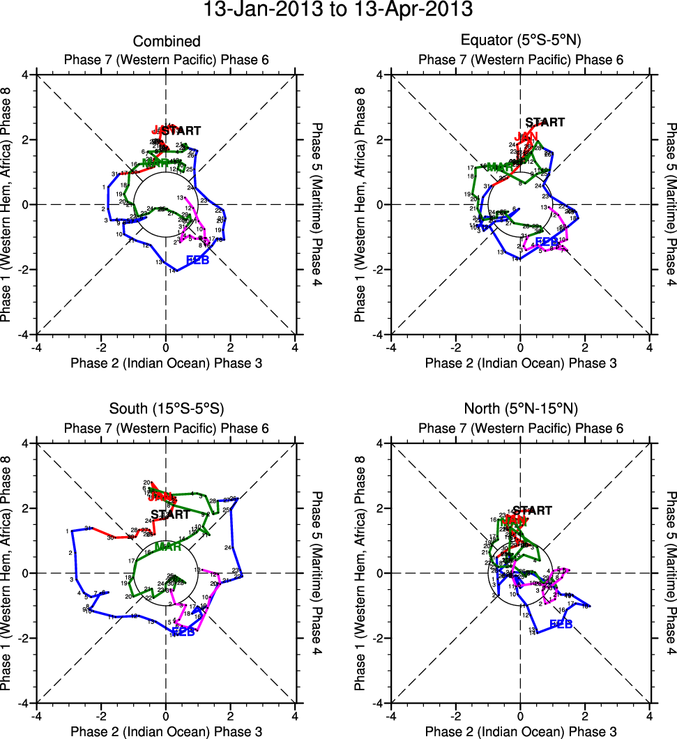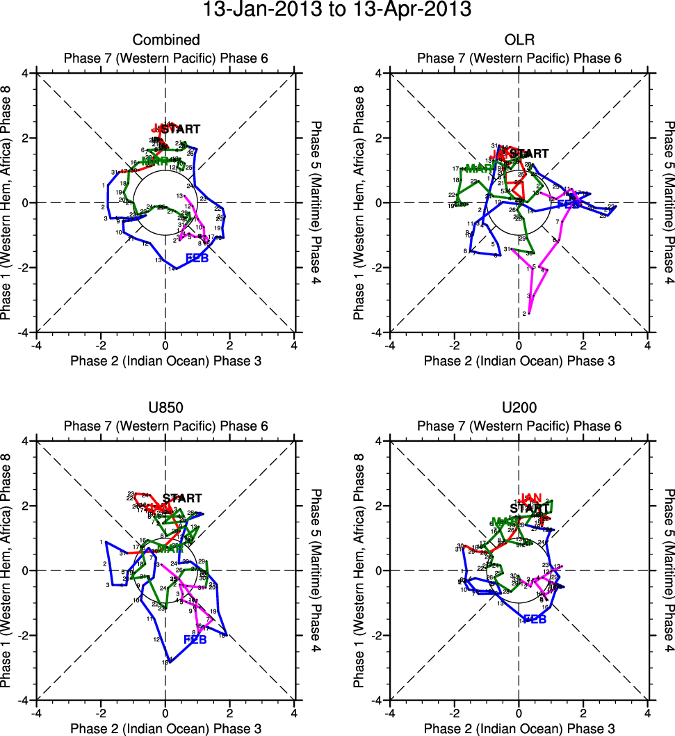 Wheeler and Hendon (2004) constructed the RMM index for monitoring the MJO. This index consists of the first two principal components (PCs) of OLR, 850-hPa zonal wind, and 200-hPa zonal wind averaged 15S-15N.