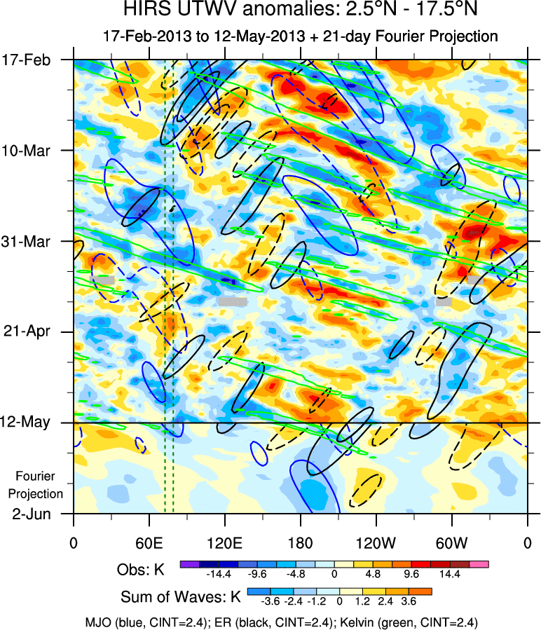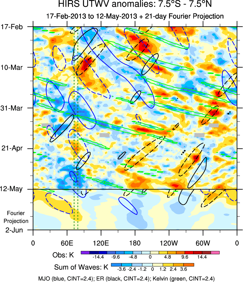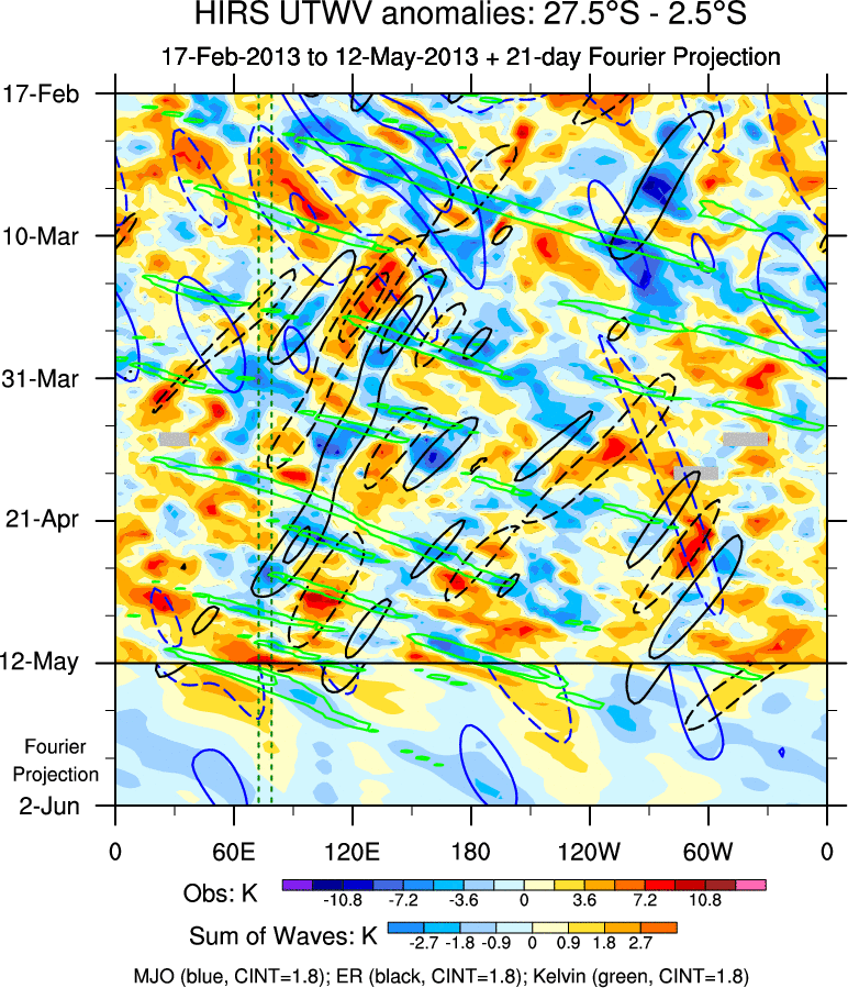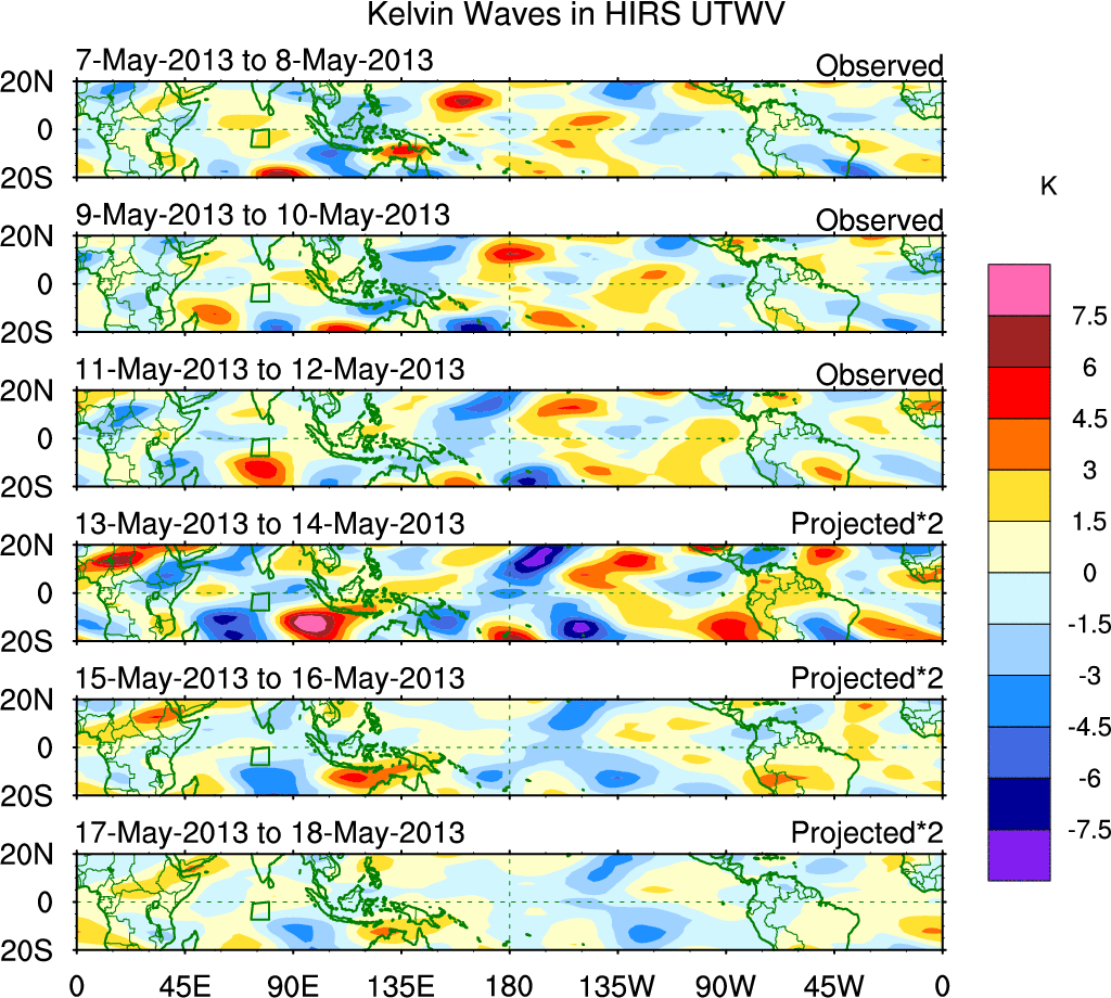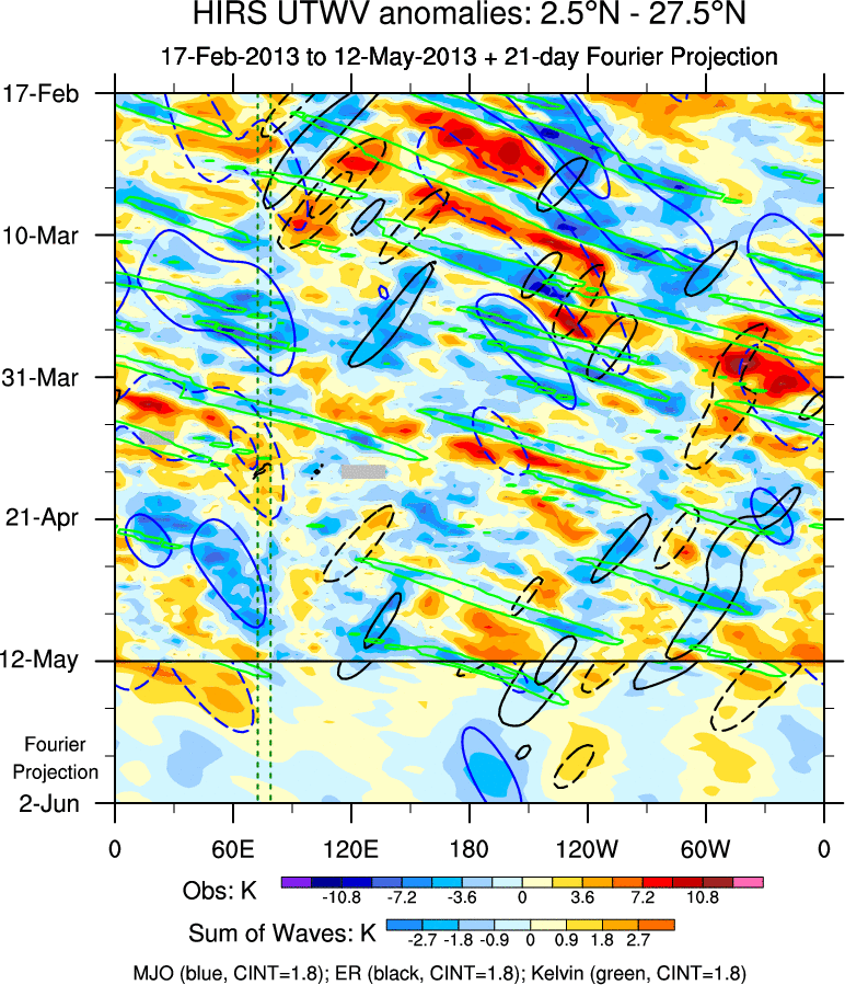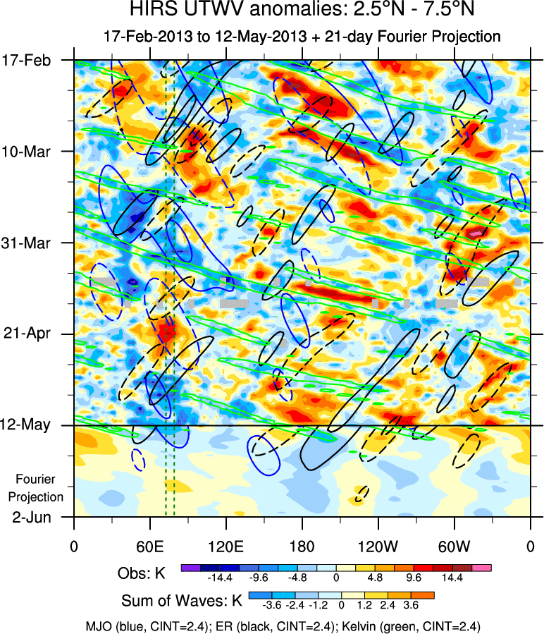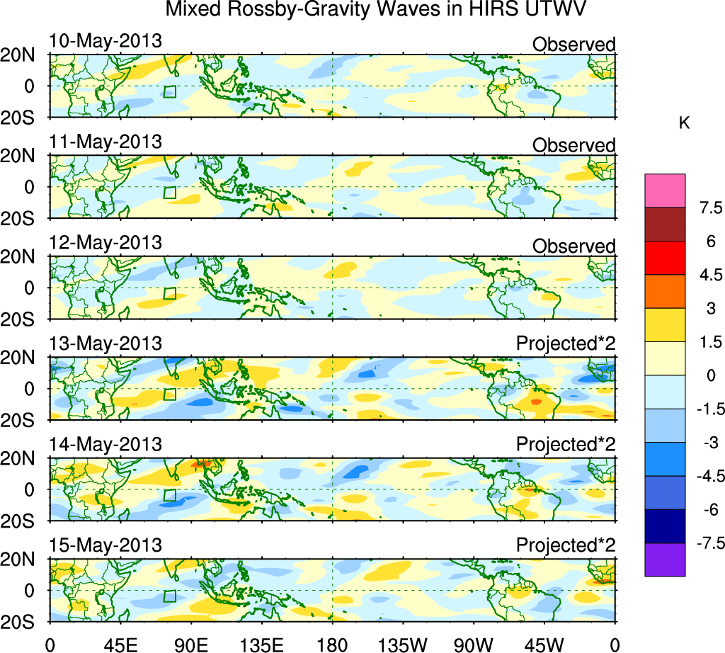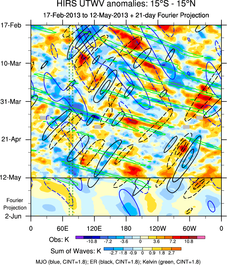To identify tropical waves in near real-time, the OLR and UTWV data are filtered following Wheeler & Weickmann (2001 MWR). The daily anomalies are calculated using the first 3 harmonics of the seasonal cycle for 1979–2009. Missing values are then filled using linear interpolation in space and time. The most recent 365 days of anomalies are padded with 659 days of zeroes, and the result is filtered for each wave type.