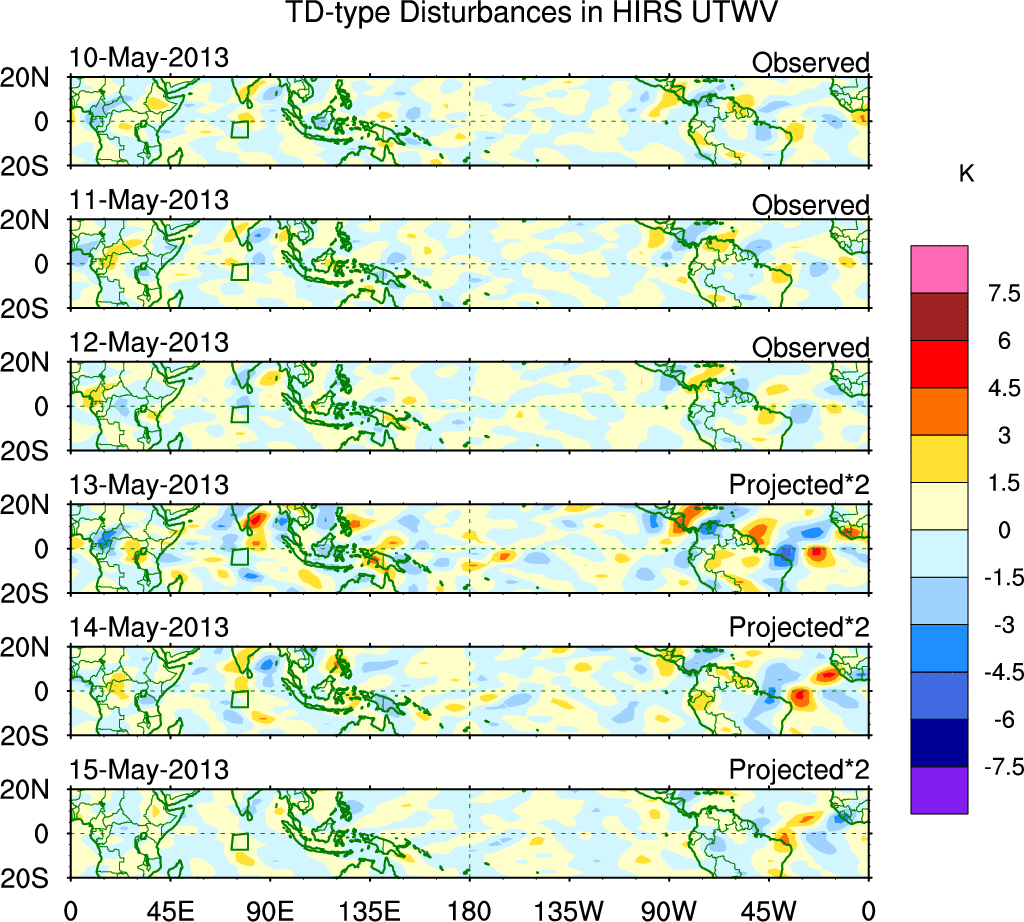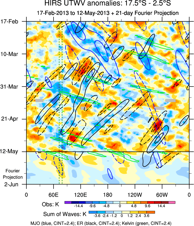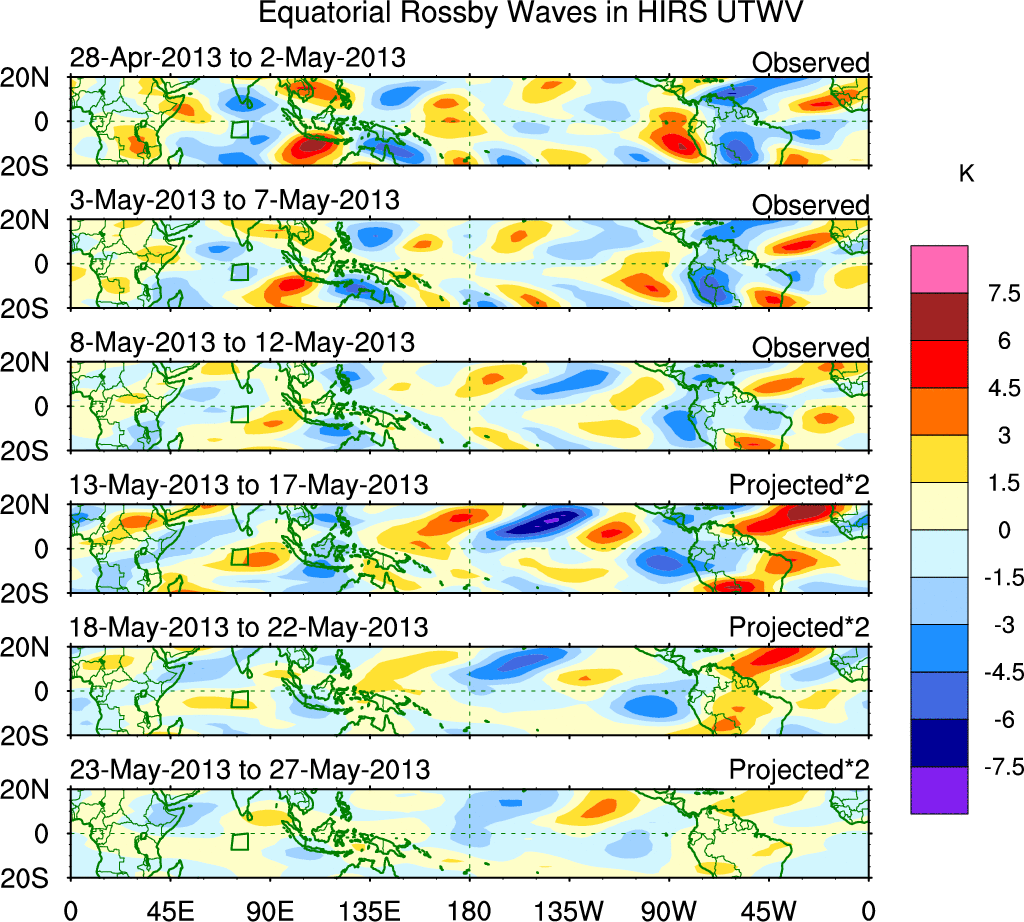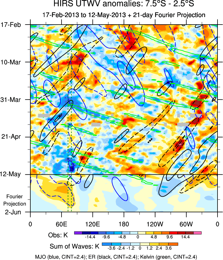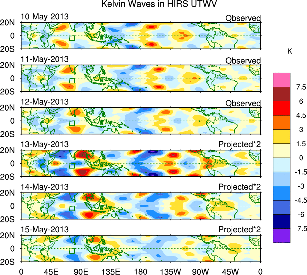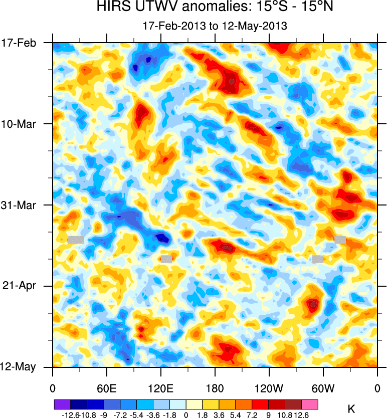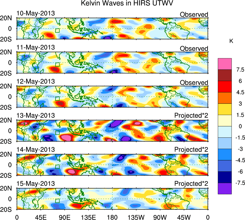 To identify tropical waves in near real-time, the OLR and UTWV data are filtered following Wheeler & Weickmann (2001 MWR). The daily anomalies are calculated using the first 3 harmonics of the seasonal cycle for 1979–2009. Missing values are then filled using linear interpolation in space and time. The most recent 365 days of anomalies are padded with 659 days of zeroes, and the result is filtered for each wave type.