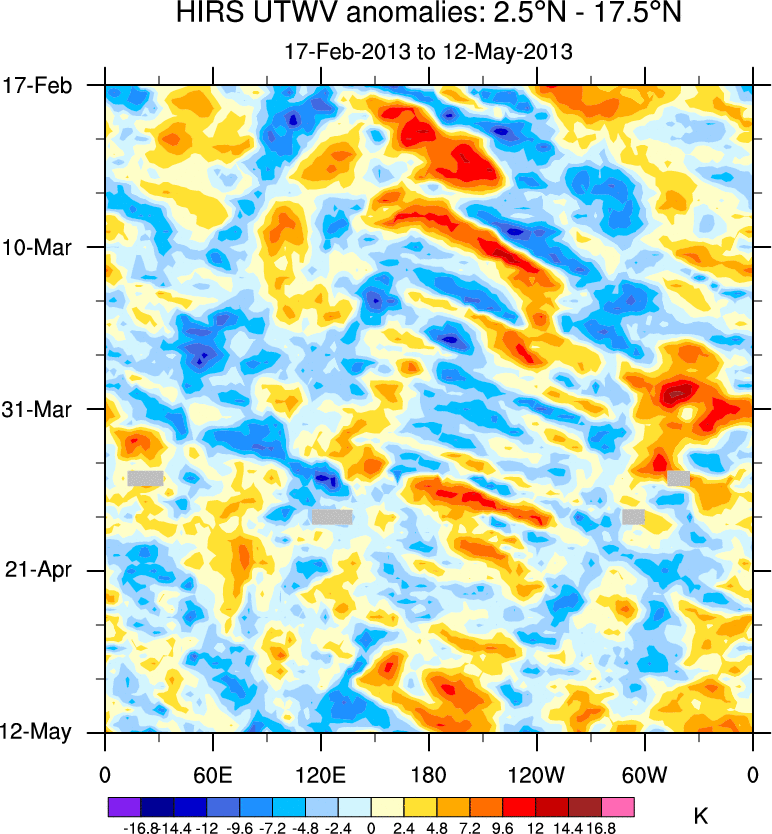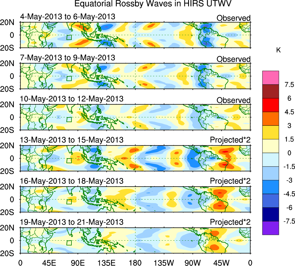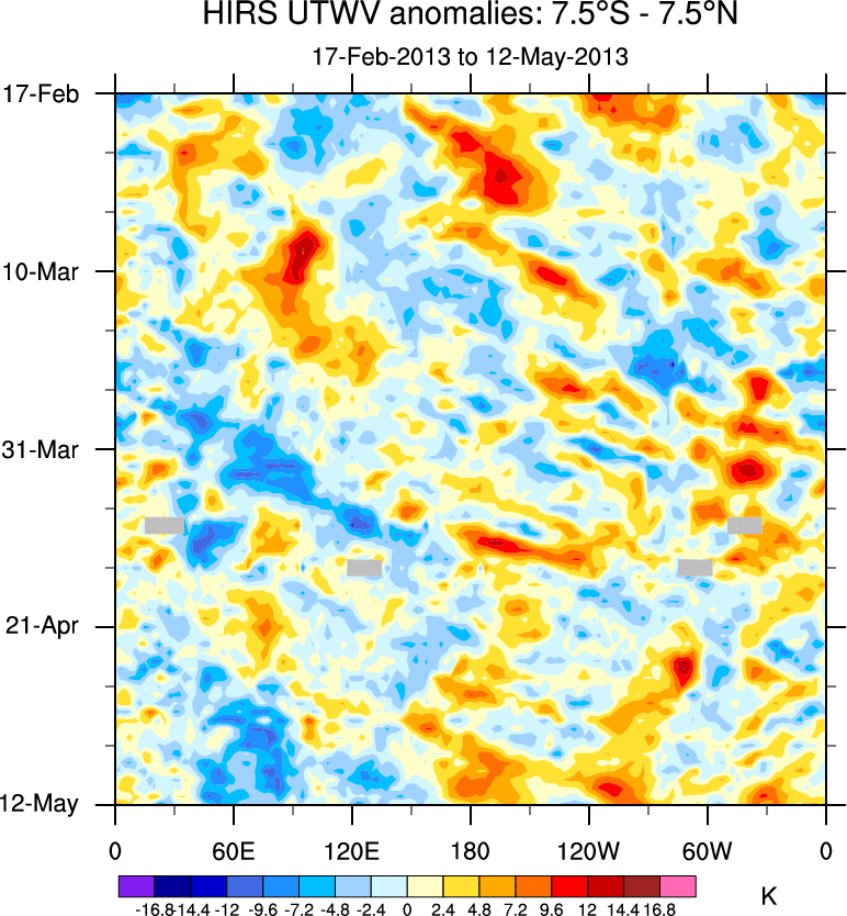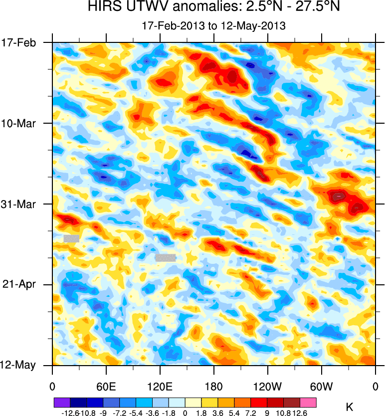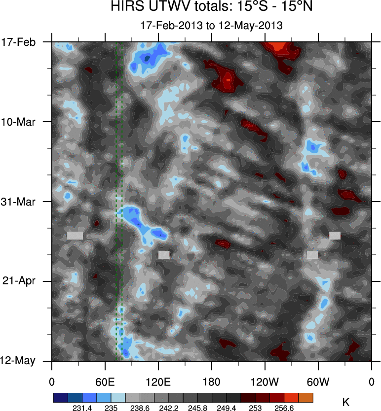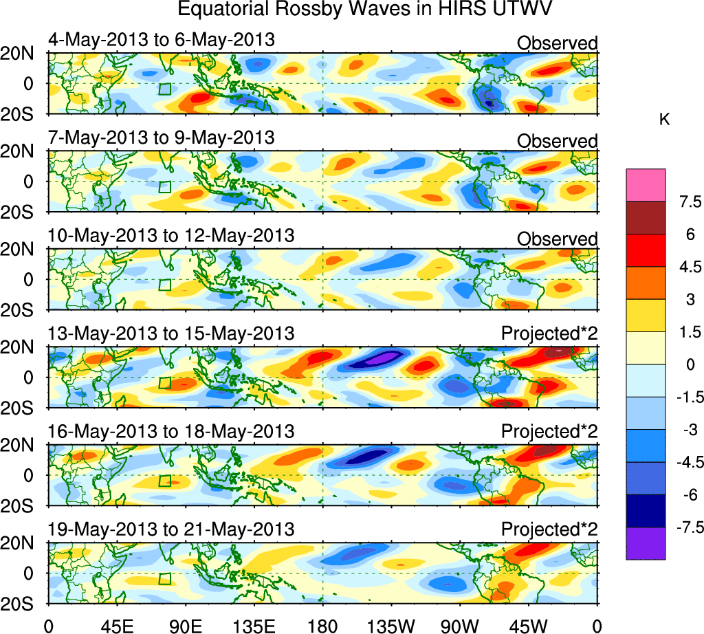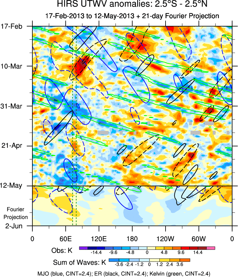 To identify tropical waves in near real-time, the OLR and UTWV data are filtered following Wheeler & Weickmann (2001 MWR). The daily anomalies are calculated using the first 3 harmonics of the seasonal cycle for 1979–2009. Missing values are then filled using linear interpolation in space and time. The most recent 365 days of anomalies are padded with 659 days of zeroes, and the result is filtered for each wave type.