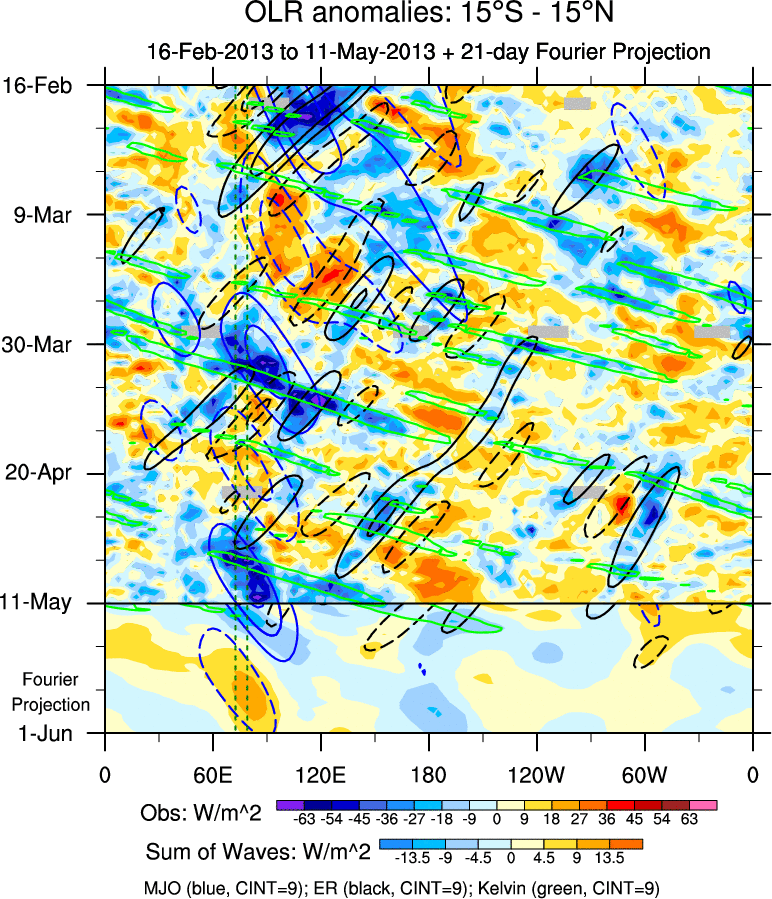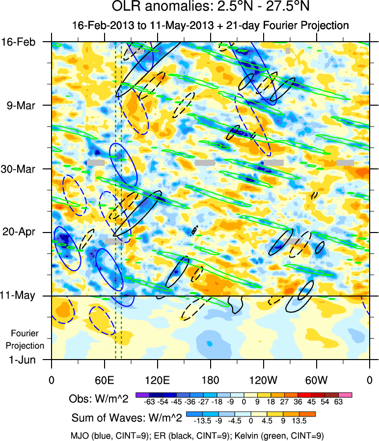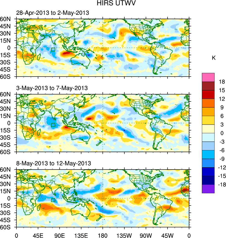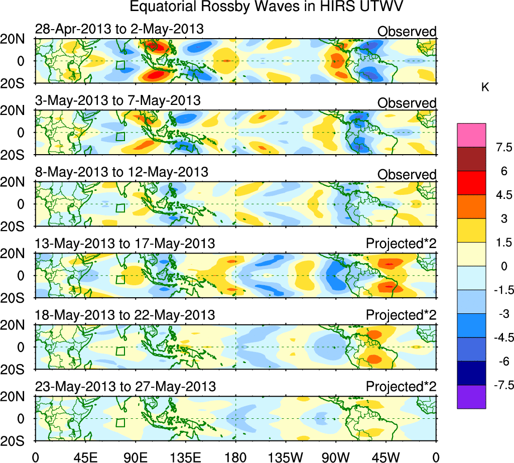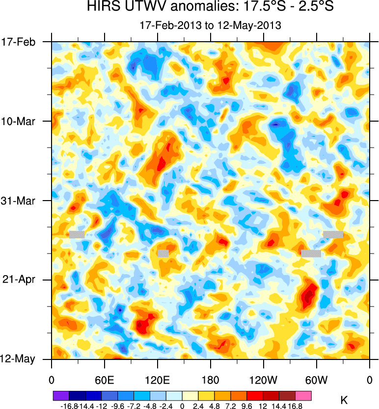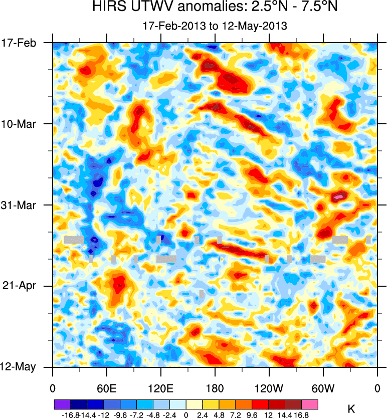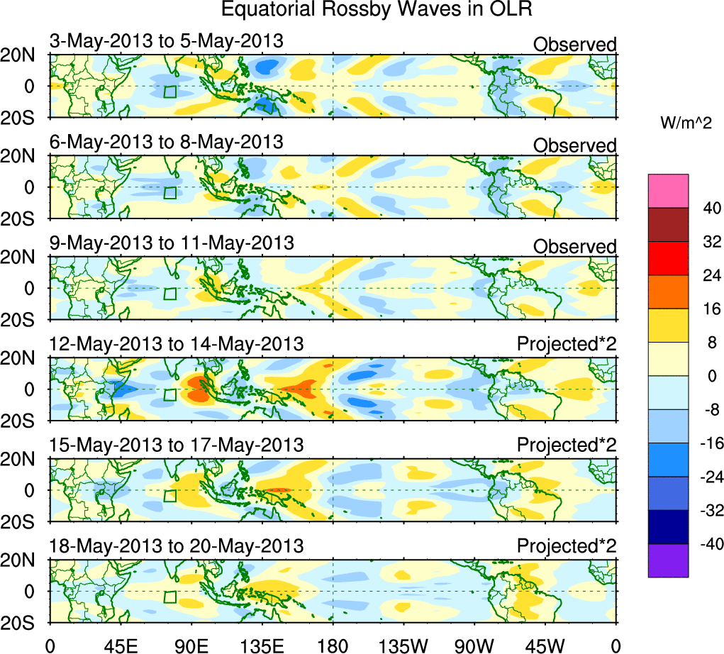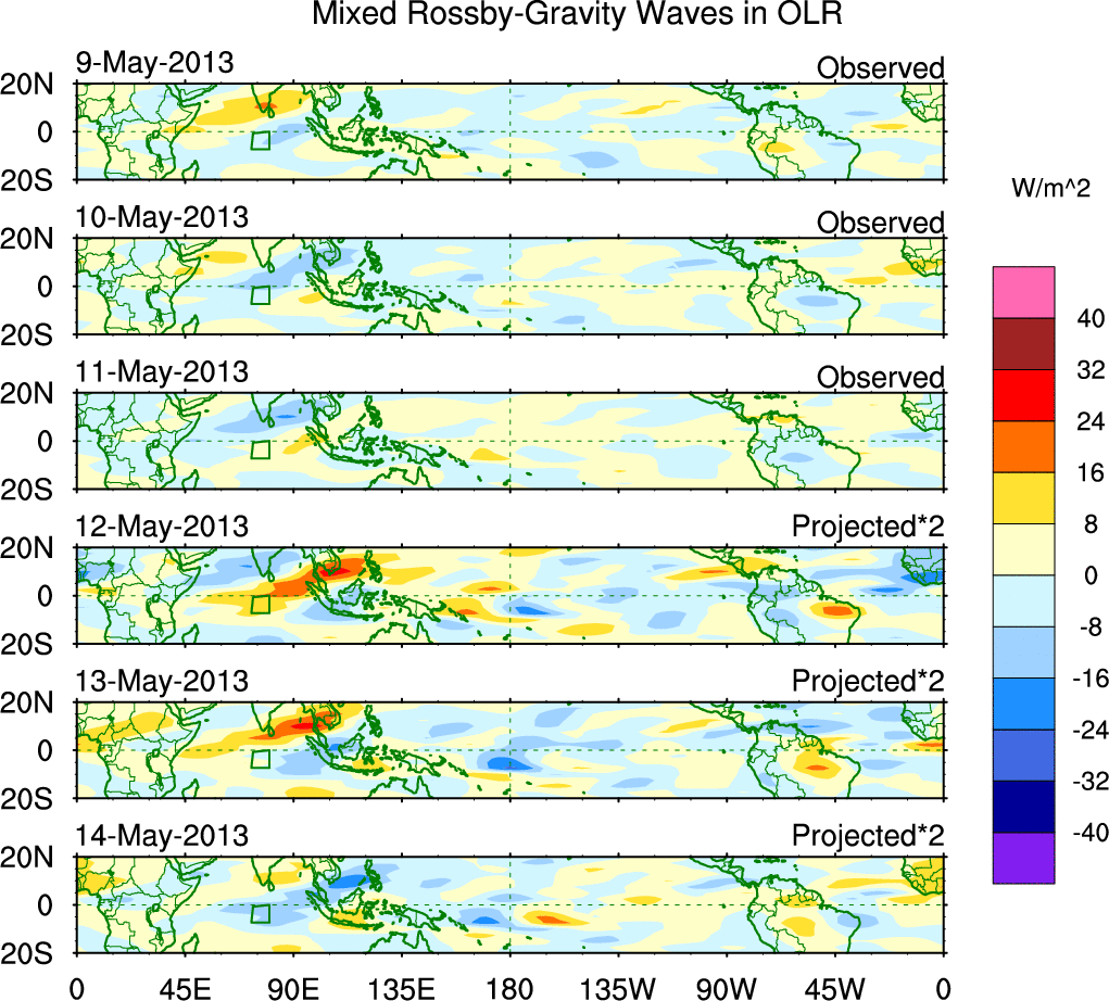 To identify tropical waves in near real-time, the OLR and UTWV data are filtered following Wheeler & Weickmann (2001 MWR). The daily anomalies are calculated using the first 3 harmonics of the seasonal cycle for 1979–2009. Missing values are then filled using linear interpolation in space and time. The most recent 365 days of anomalies are padded with 659 days of zeroes, and the result is filtered for each wave type.